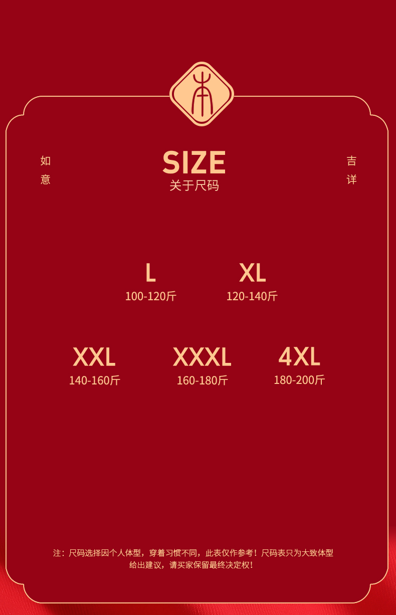 【尺码】L:100~120斤、XL:120~140斤、XXL:140~160斤、XXXL:160~180斤、4XL:180∽200斤