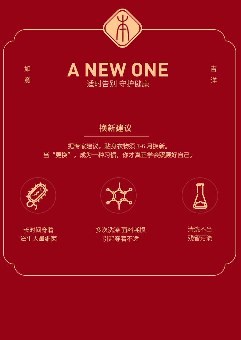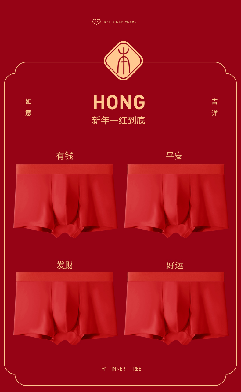 本命年穿红色衣裤,是自古以来的一种民间习俗,它反映了人们一种良好的愿望与追求。本命年穿红内裤,寓意好运,寓意平安。新婚夫妇穿红内裤,寓意喜庆,寓意幸福美满。