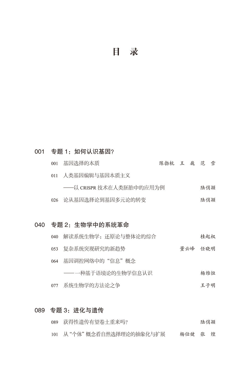 本书属于中国科学院《自然辩证法通讯》杂志社编辑出版的“《自然辩证法通讯》精选文丛”之一,主要讨论当代生物学研究中的哲学问题。共分为4个专题:专题1 如何认识基因?专题2 生物学中的系统革命;专题3:进化与遗传;专题4:生物学中的定律与解释。