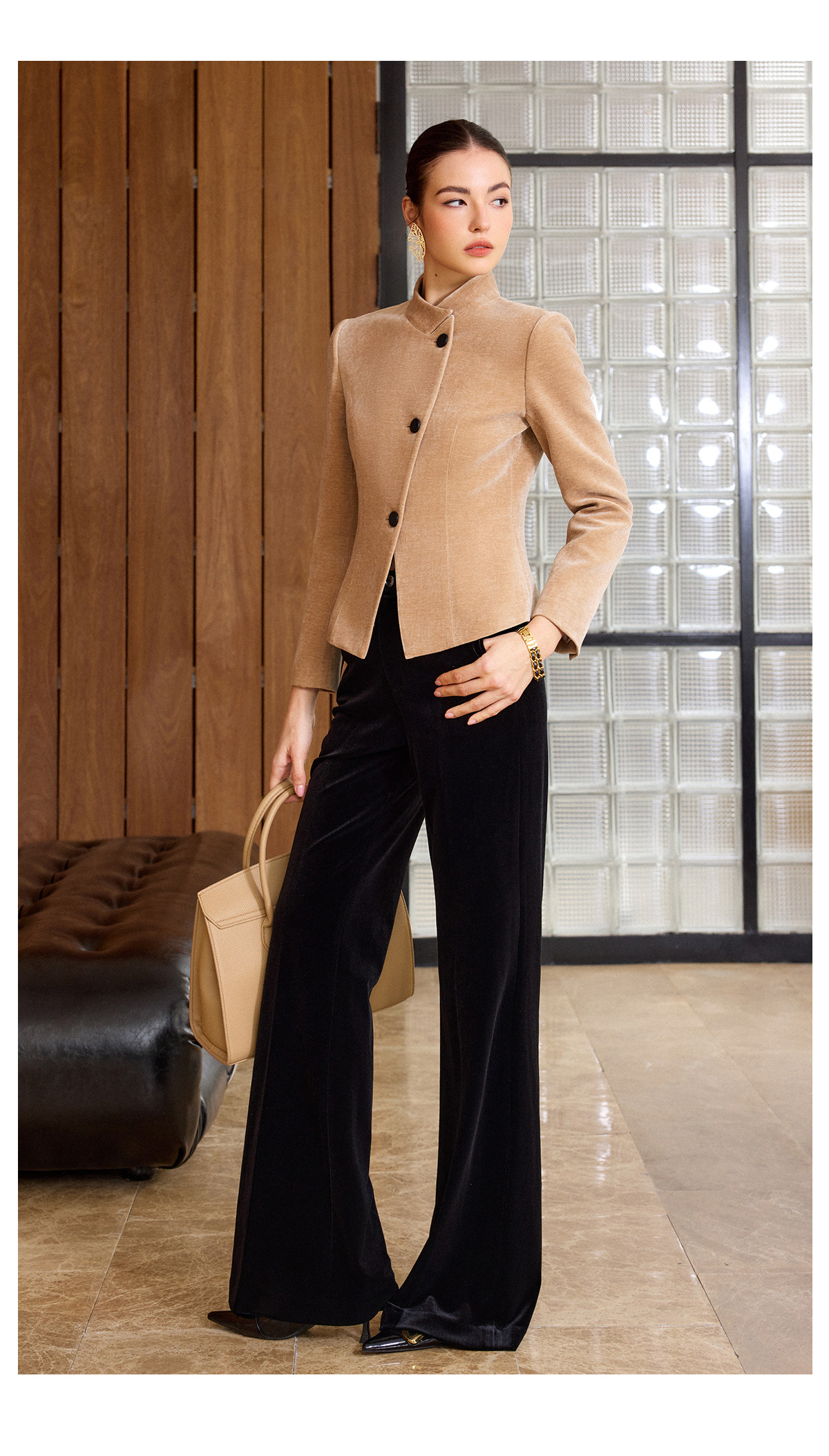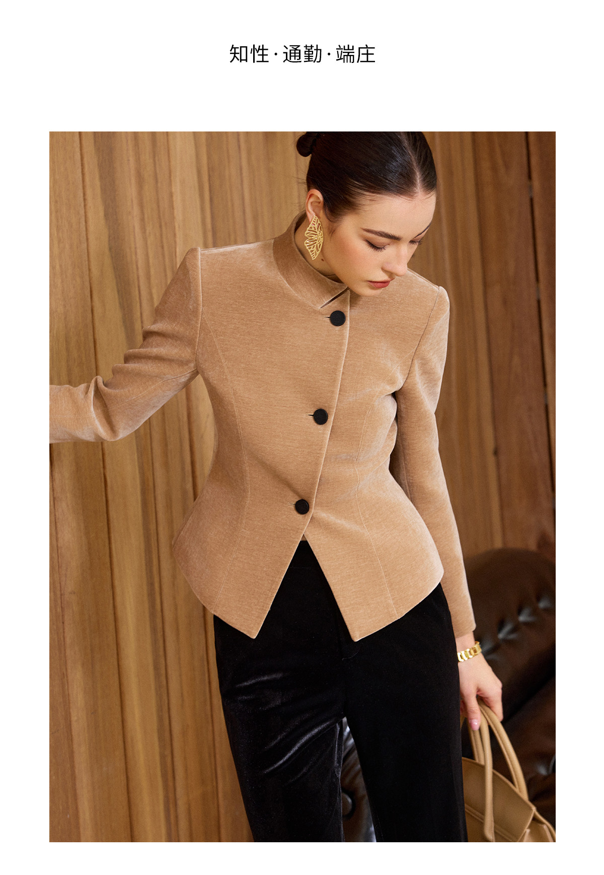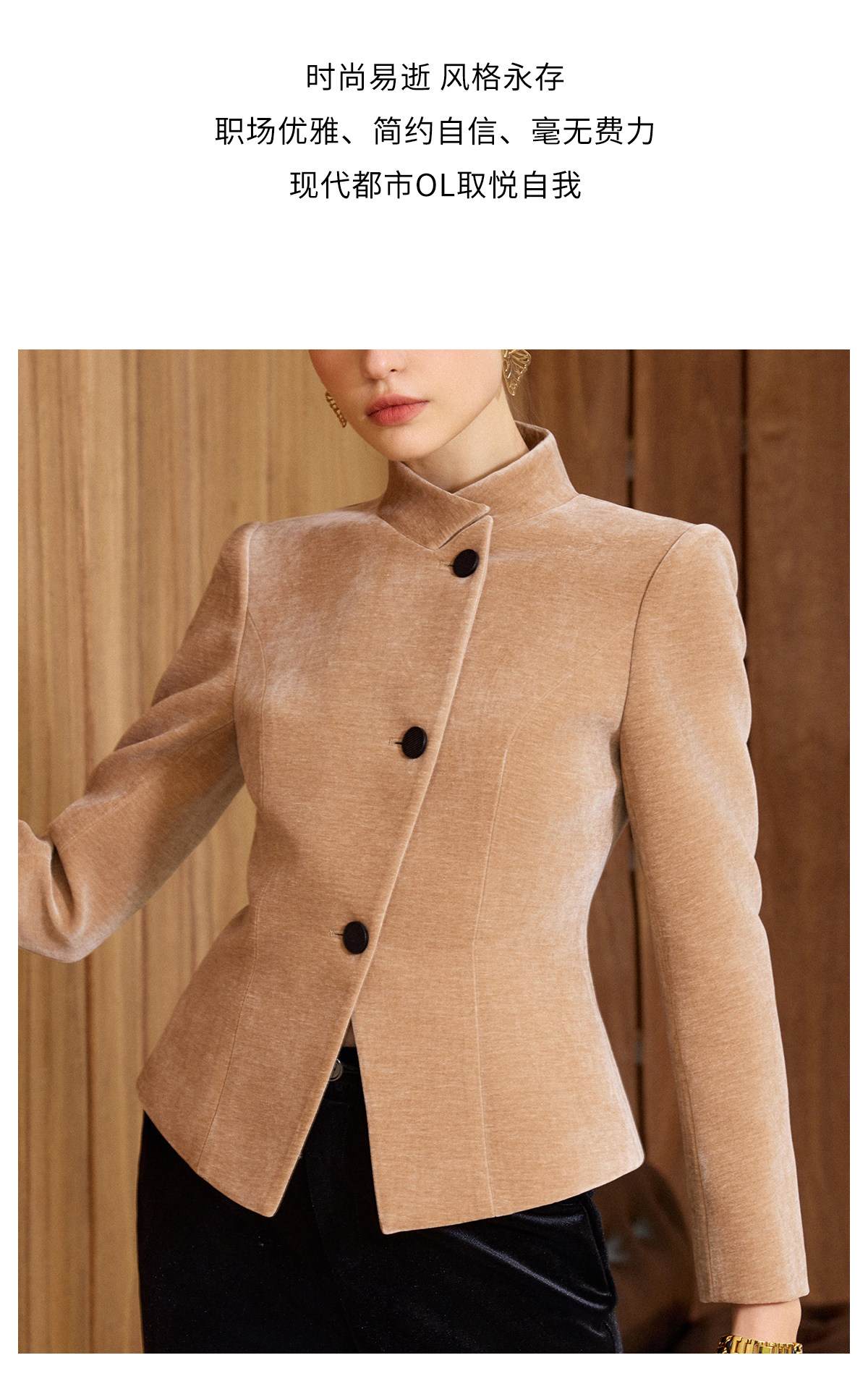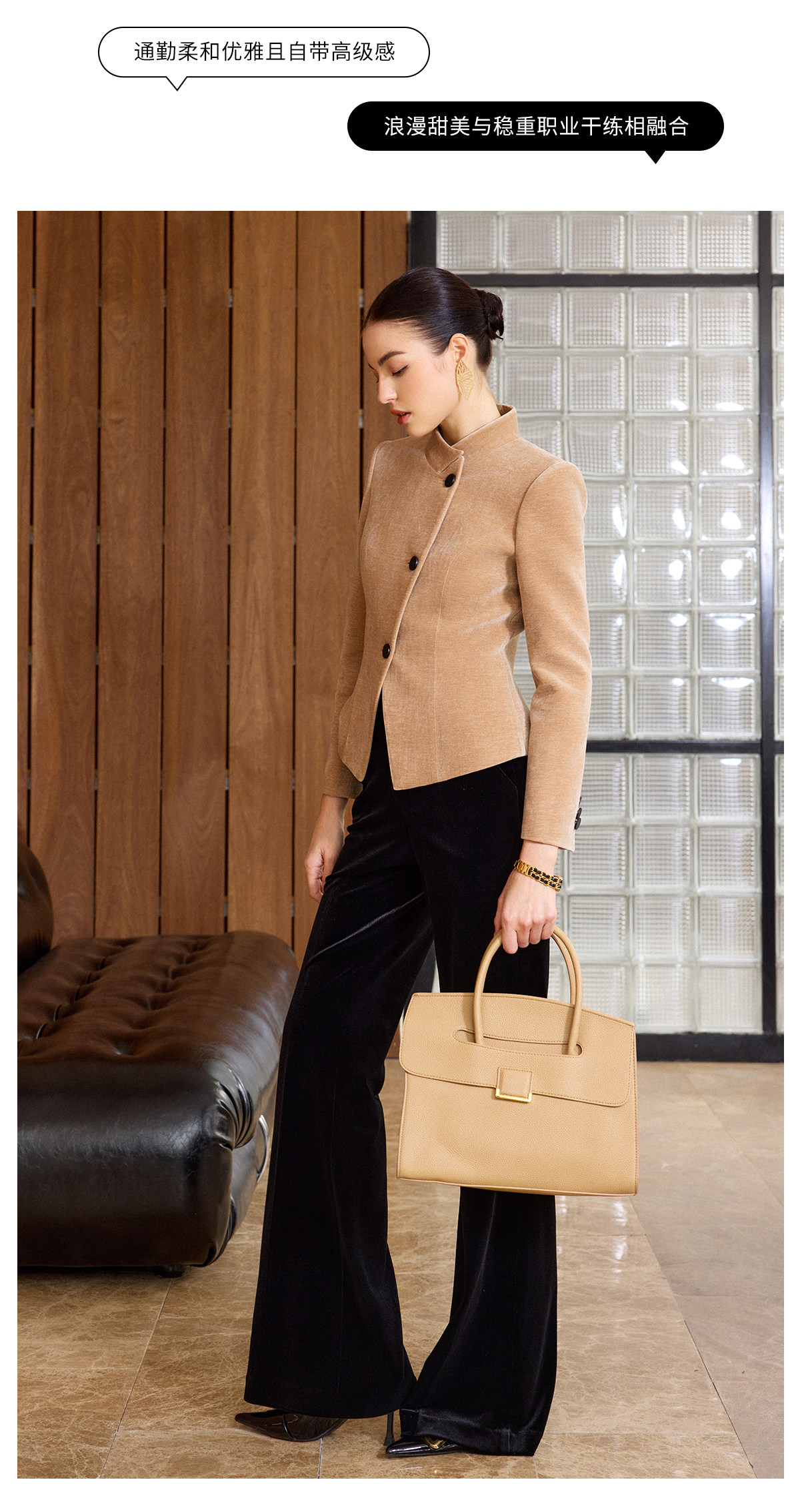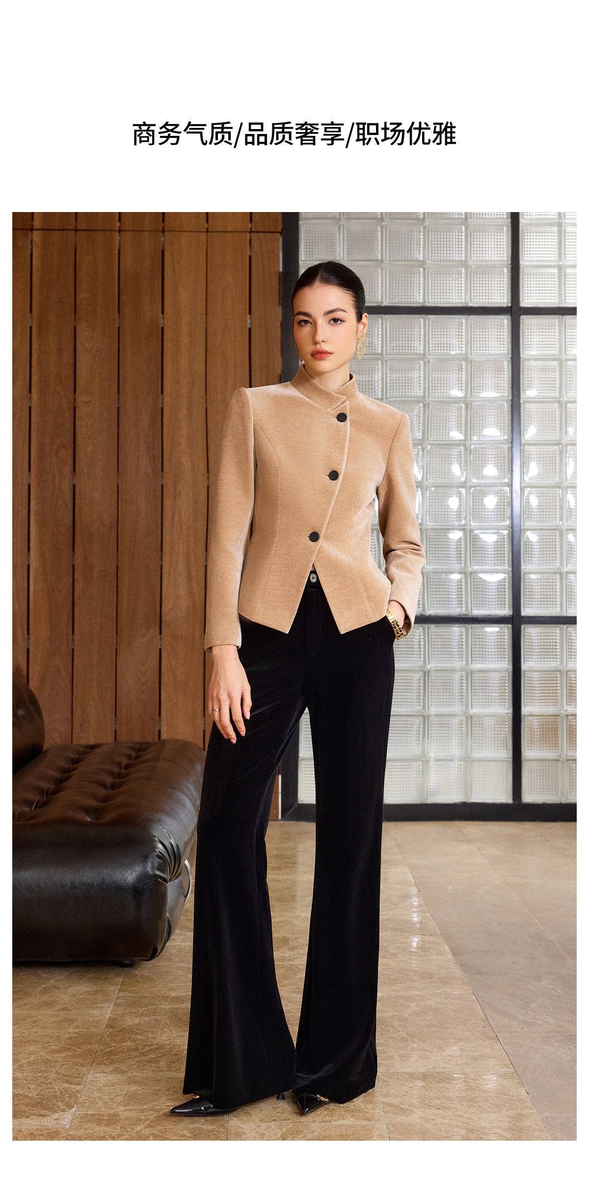 IWY/卡其色高级感气质丝绒套装女职业装立领上衣阔腿裤两件套通勤西装C2580+P2515