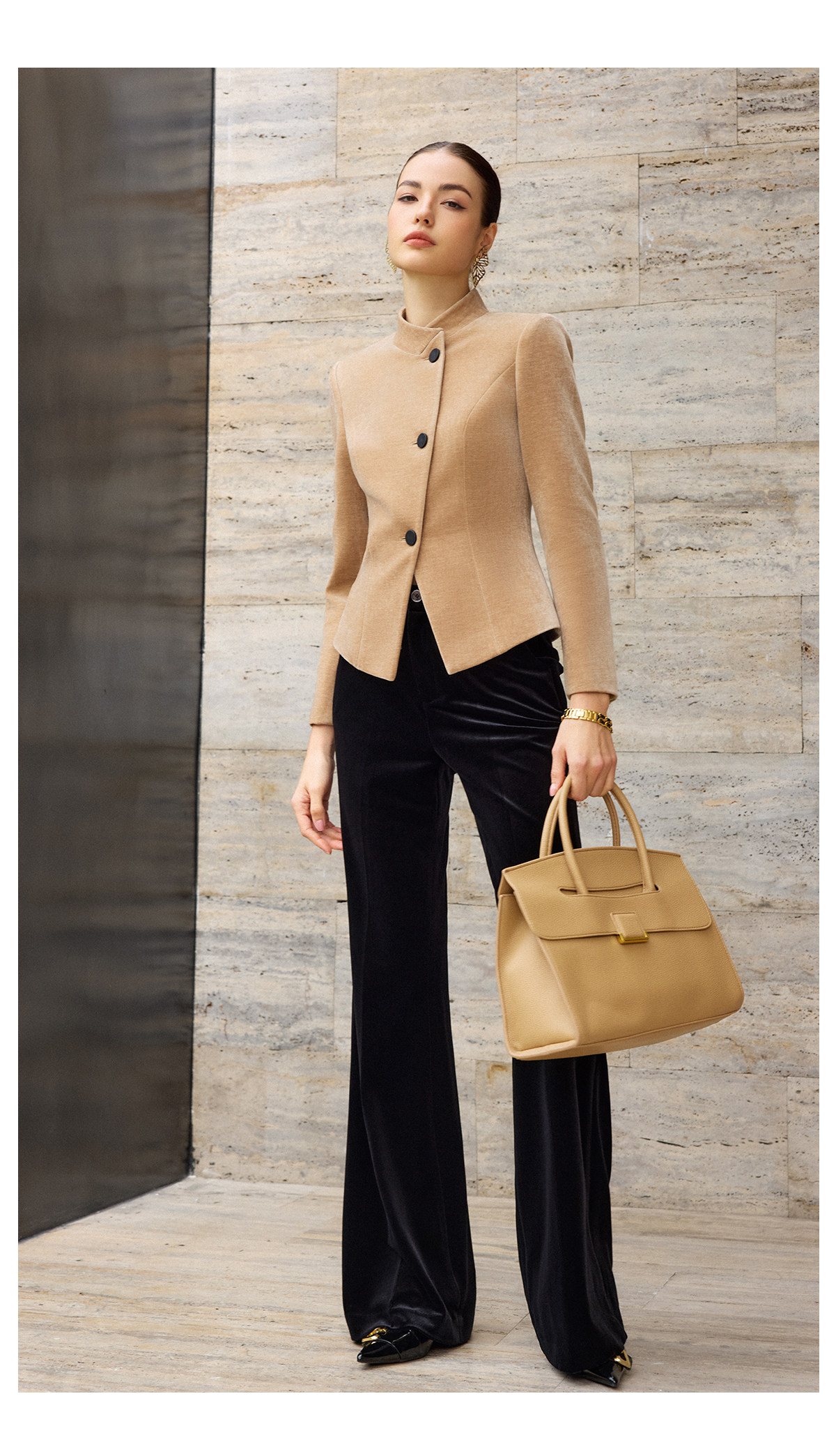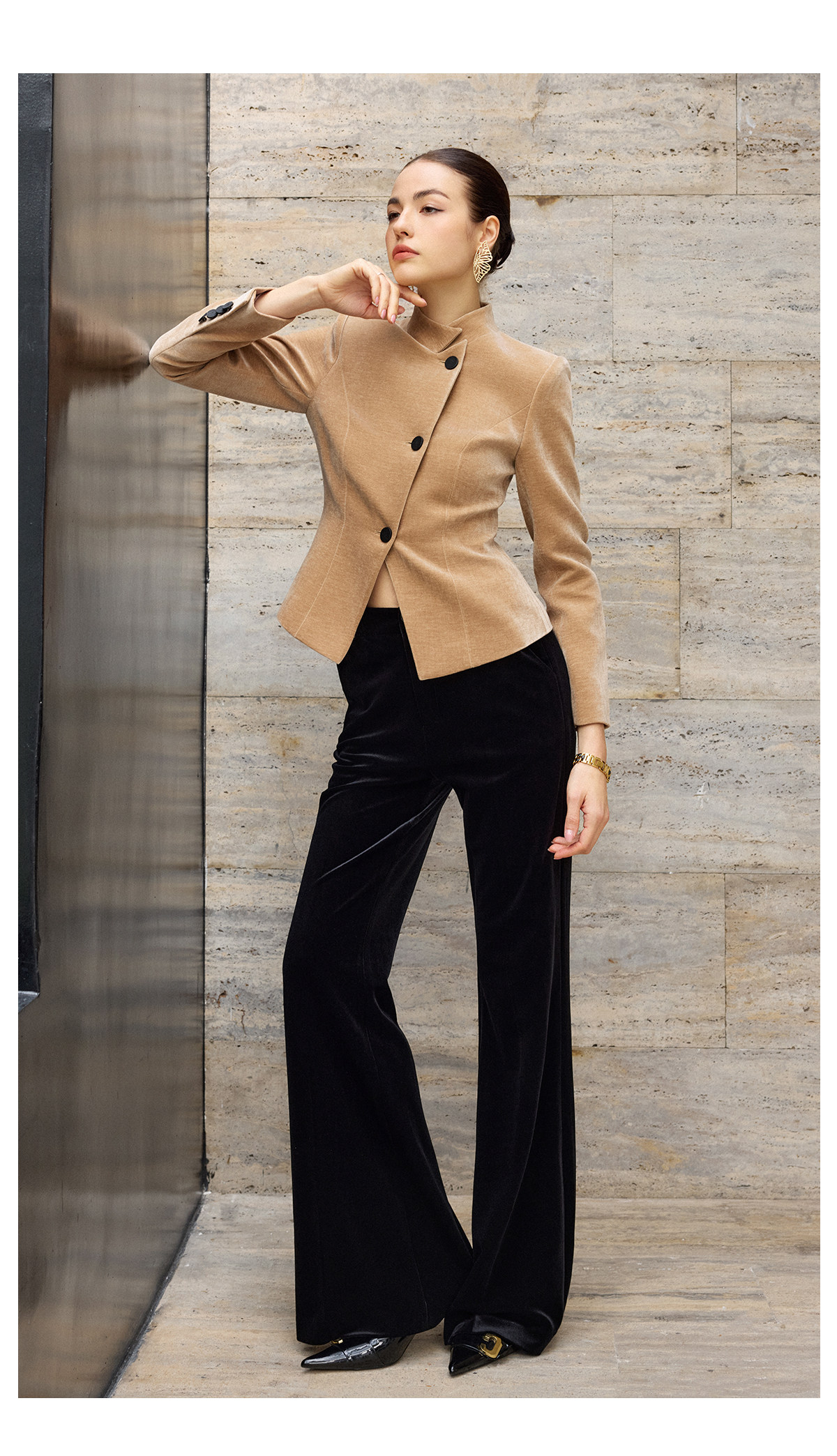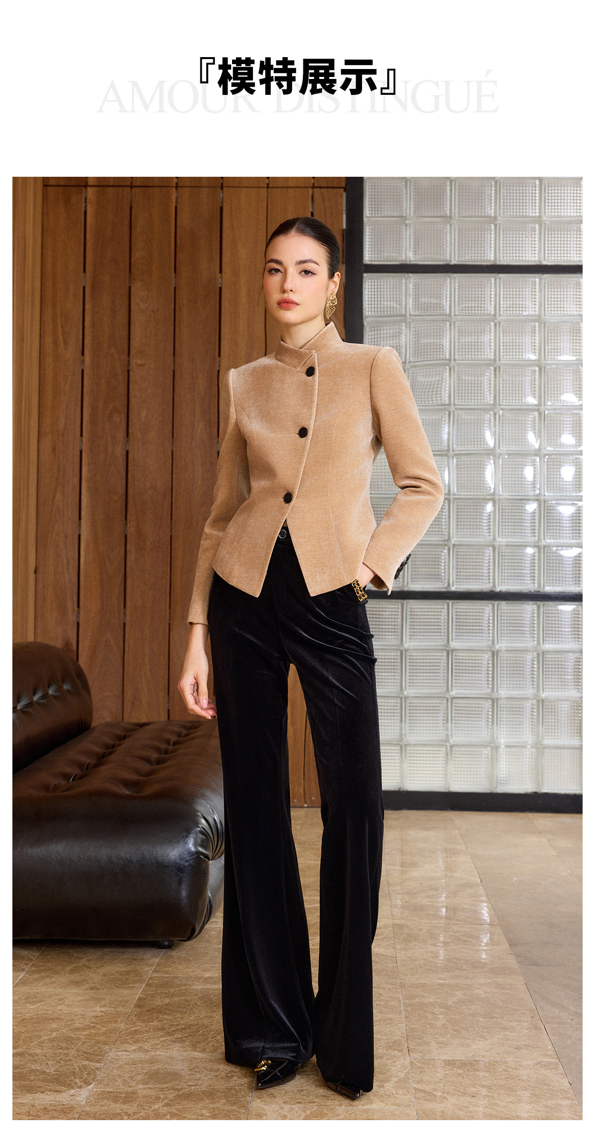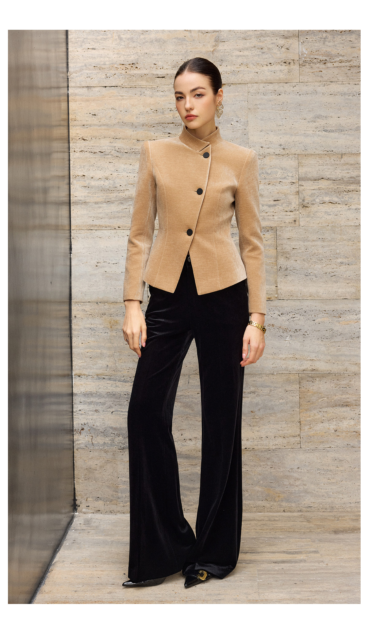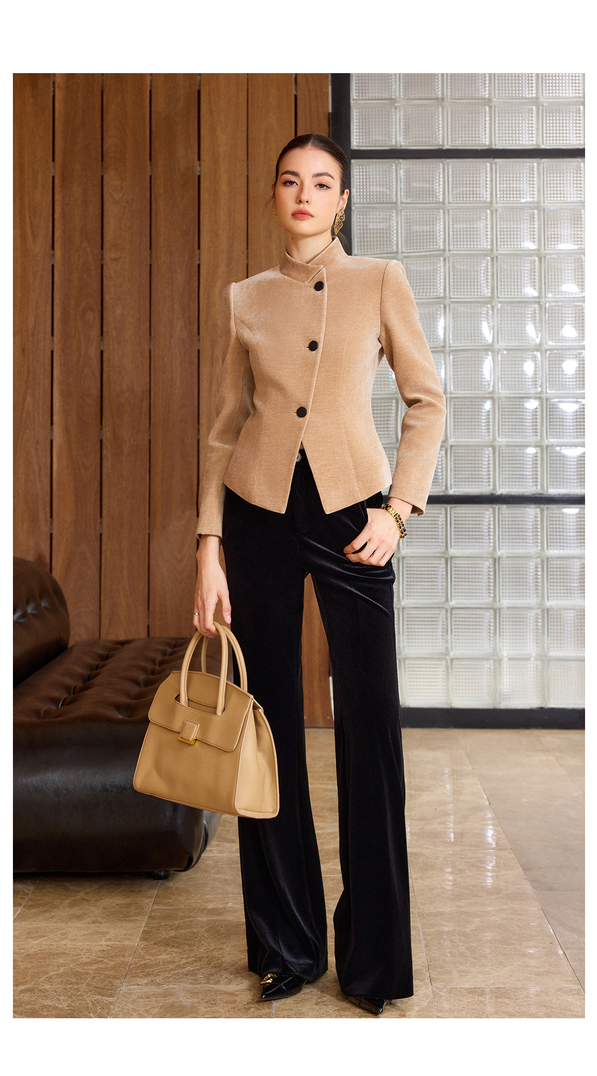 IWY/卡其色高级感气质丝绒套装女职业装立领上衣阔腿裤两件套通勤西装C2580+P2515