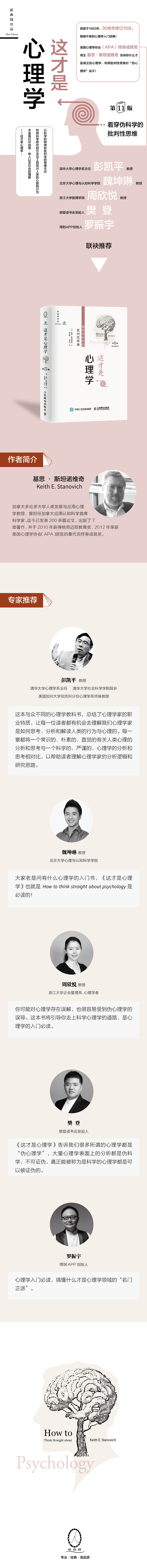 在今天的大众媒体和图书市场上,到处充斥着关于潜能提升、心理操控、色彩星座、催眠读心等伪装成心理学的主题,更有一些伪心理学家、所谓的心理治疗师打着心理学的旗号欺世盗名,从中渔利。在浩如烟海、良莠不齐的心理学信息面前,如何拨除迷雾,去伪存真,成为一个明智的心理学信息的消费者呢?《这才是心理学》将教给你科学实用的批判性思维技能,将真正的心理学研究从伪心理学中区分出来,告诉你什么才是真正的心理学。