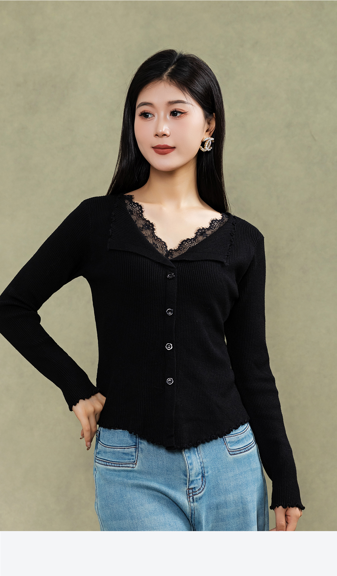 冬上新黑色蕾丝V领修身显瘦针织开衫1254093 商品图0