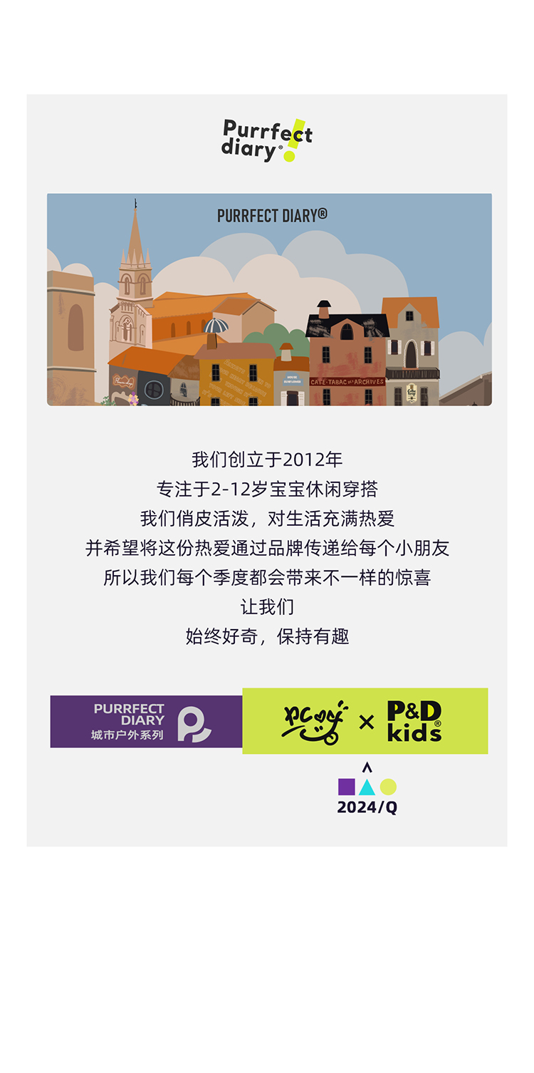 Purrfect-Diary专注于贴近自然随性的穿着概念,轻奢平价的童装文化传播,在产品设计上更加注重婴童穿着的舒适性、安全性、更出众的国际化品牌,将欧美的育婴文化在中国进行深入的传播与推广。