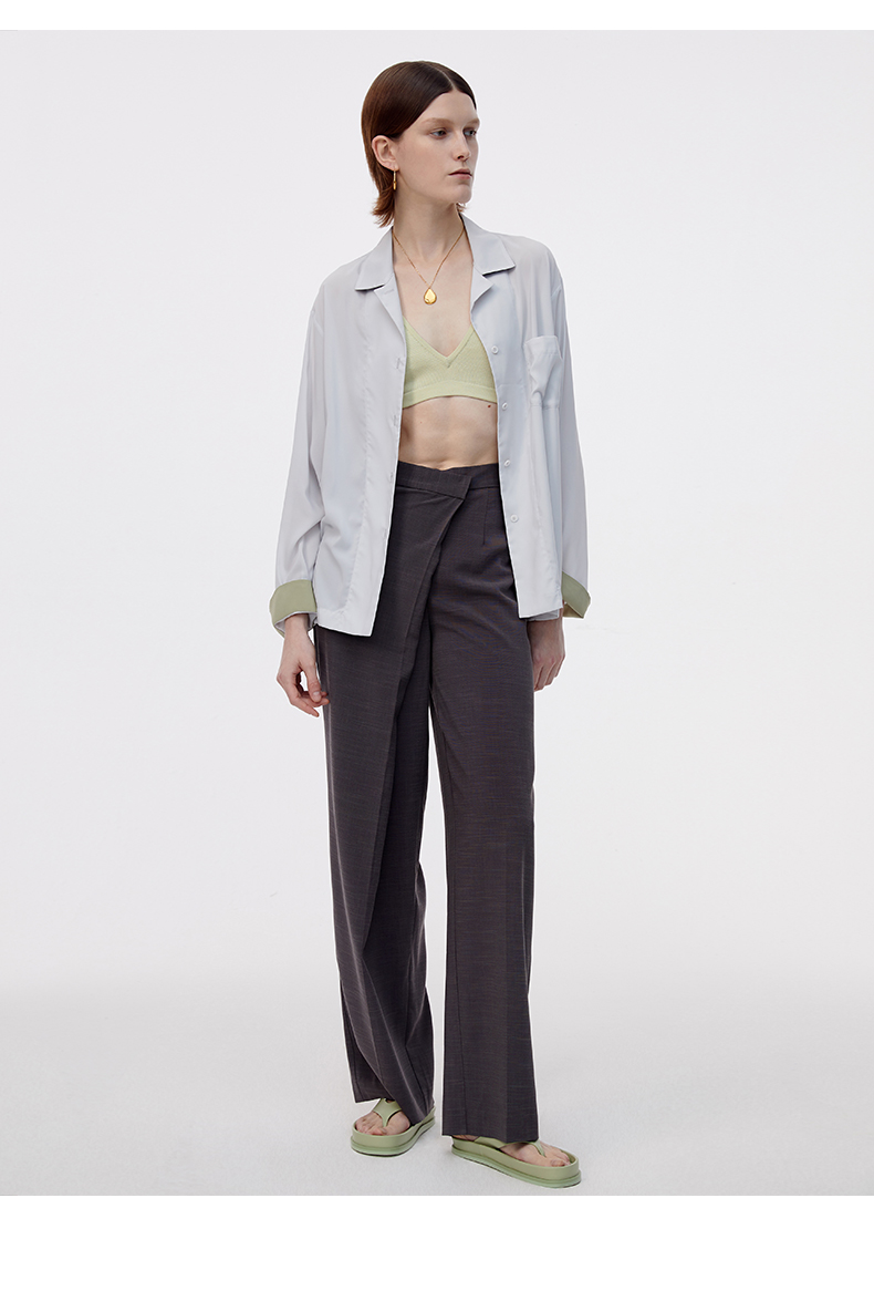 HIDEMI 缎面褶皱衬衫设计感百褶连衣裙 巧克力棕/微光绿