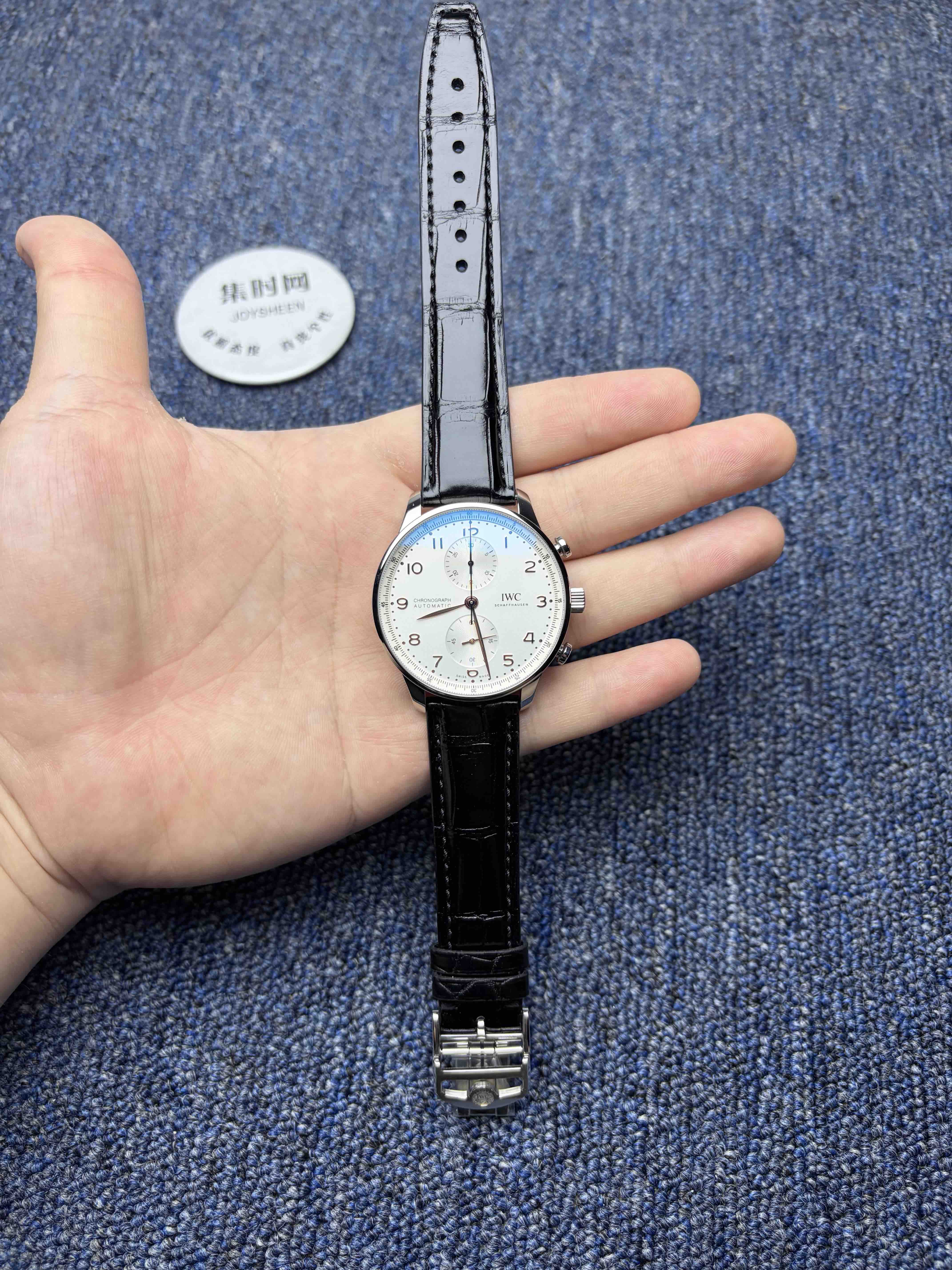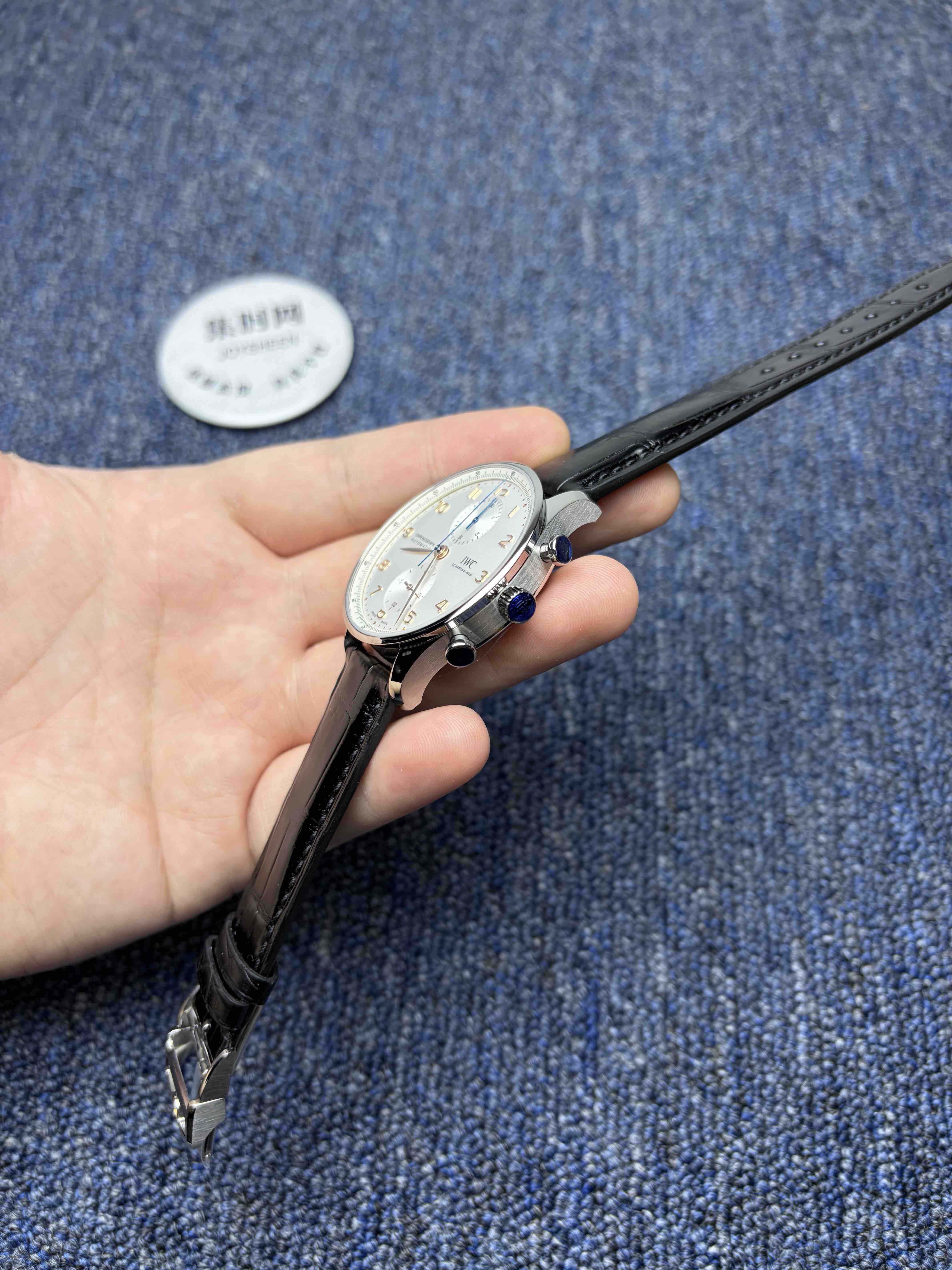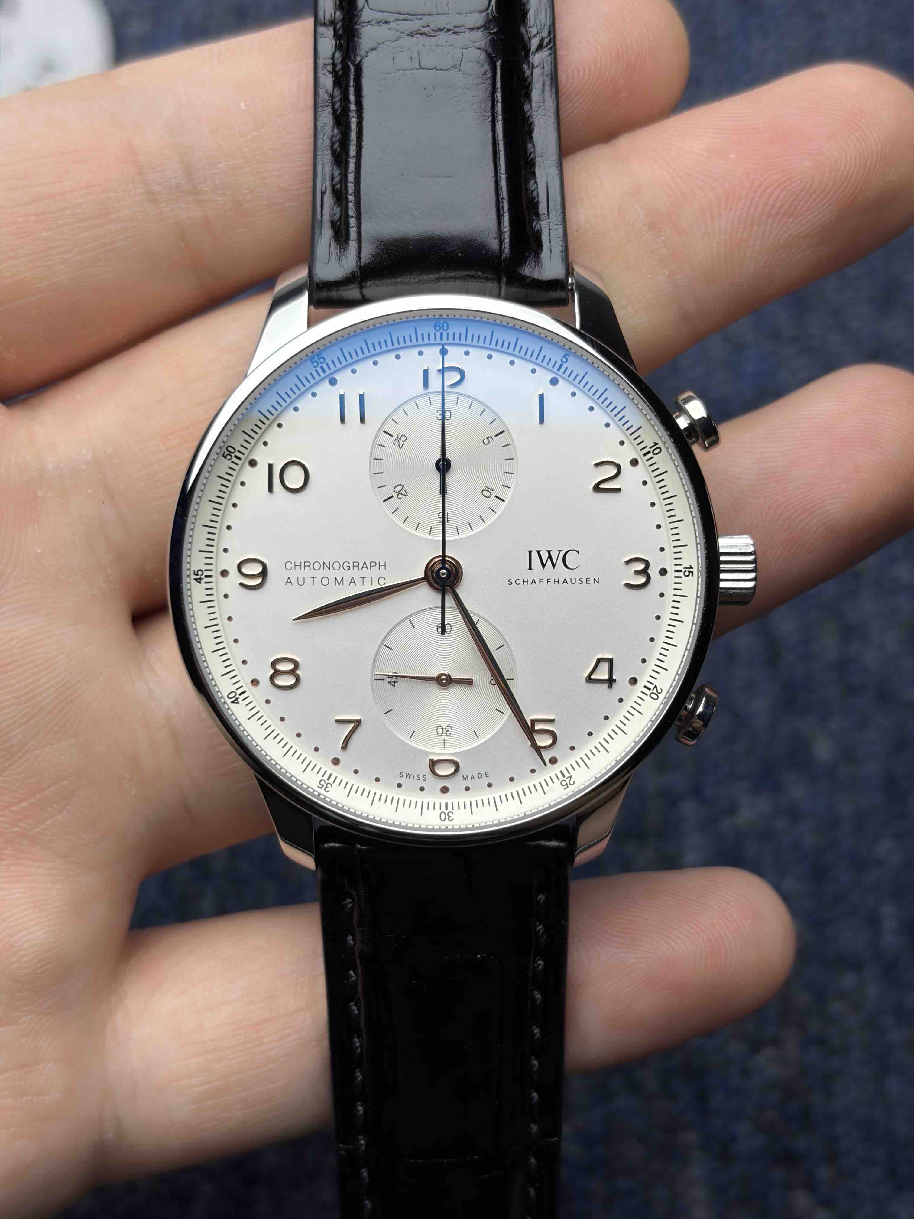 2️⃣表盘:通过正品开模,葡萄牙计时的表盘是其灵魂所在。标志性的对称式双眼子表盘布局(3点30分计时盘,9点小秒盘)带来了完美平衡的视觉感受。与原版一致,表盘外缘的铁路轨道分钟刻度圈源自航海仪器,兼具复古美感与高可读性。修长的阿拉伯数字时标与柳叶形指针在镀银或深邃蓝色的盘面上显得格外优雅清晰,整体设计简洁而经典。