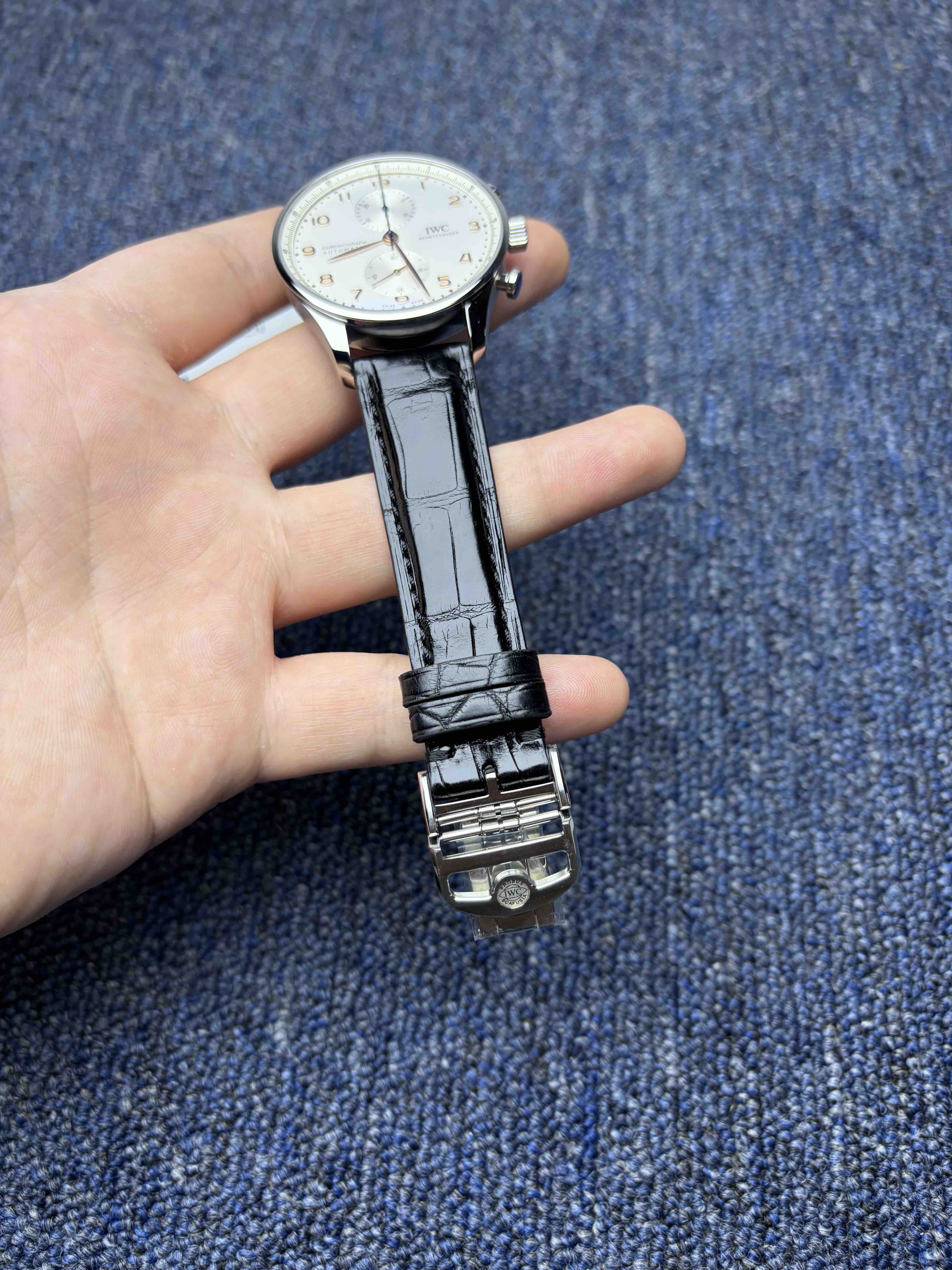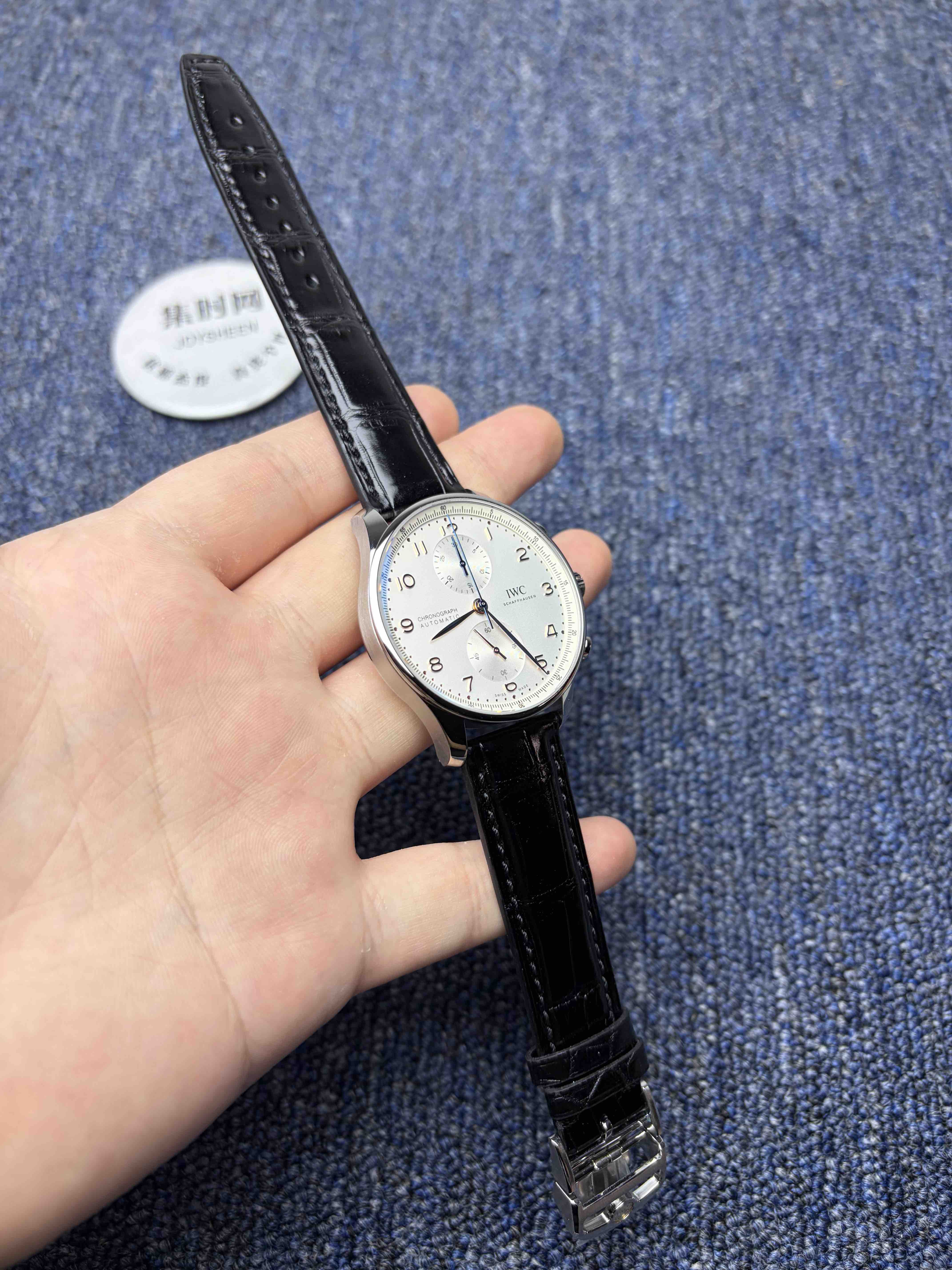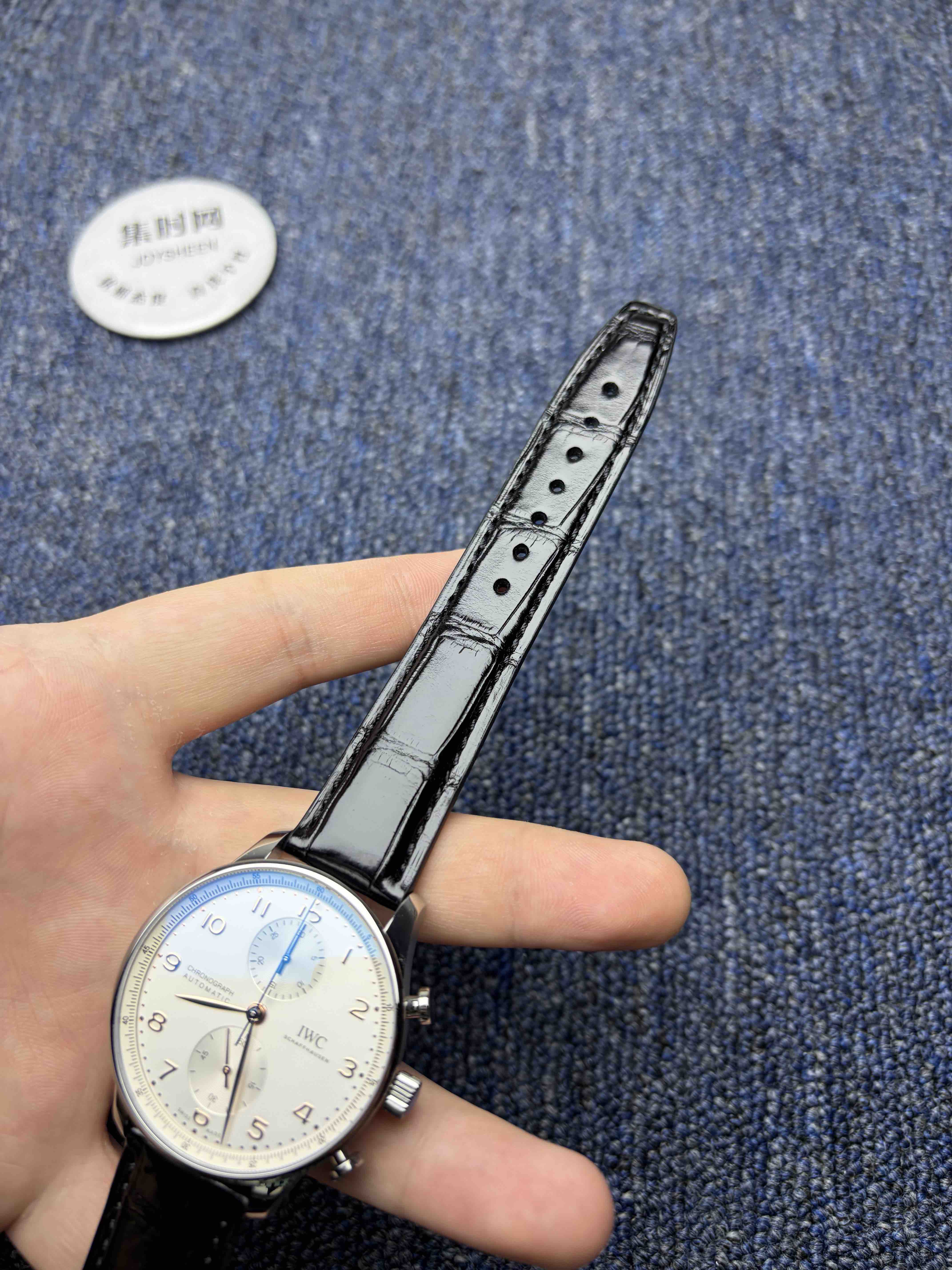 2️⃣表盘:通过正品开模,葡萄牙计时的表盘是其灵魂所在。标志性的对称式双眼子表盘布局(3点30分计时盘,9点小秒盘)带来了完美平衡的视觉感受。与原版一致,表盘外缘的铁路轨道分钟刻度圈源自航海仪器,兼具复古美感与高可读性。修长的阿拉伯数字时标与柳叶形指针在镀银或深邃蓝色的盘面上显得格外优雅清晰,整体设计简洁而经典。
