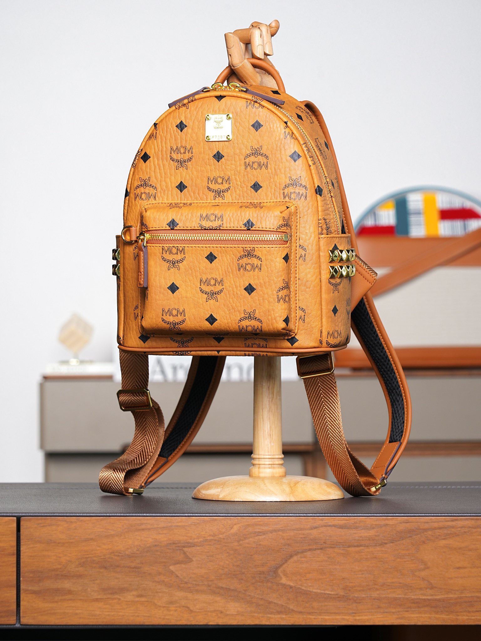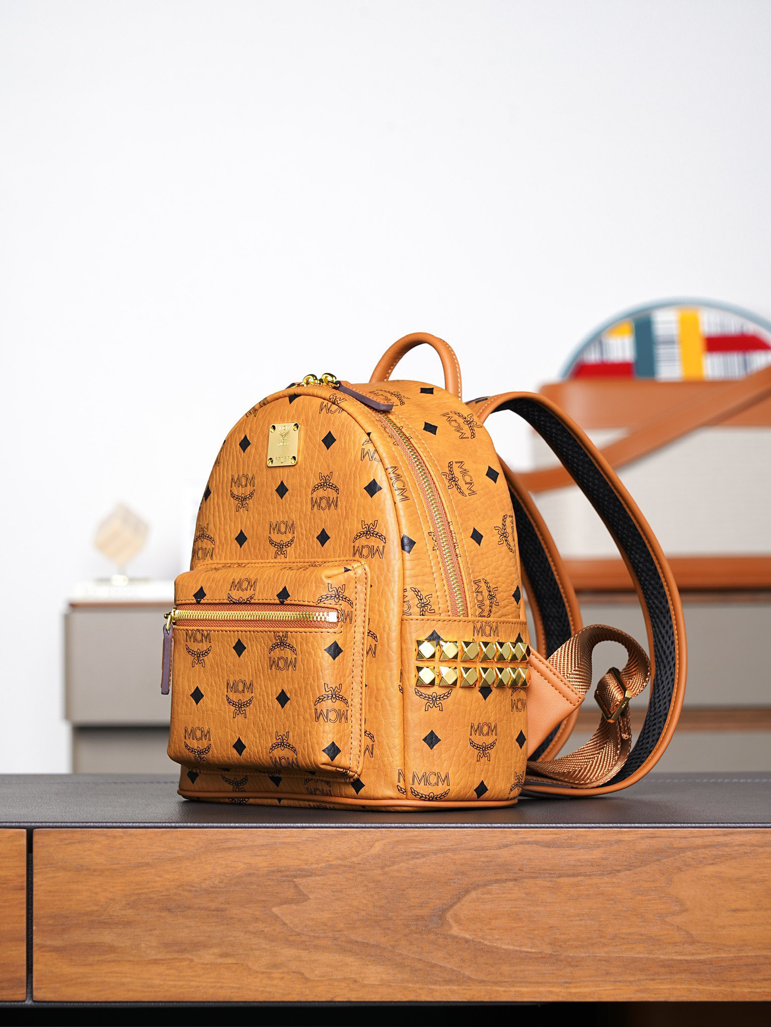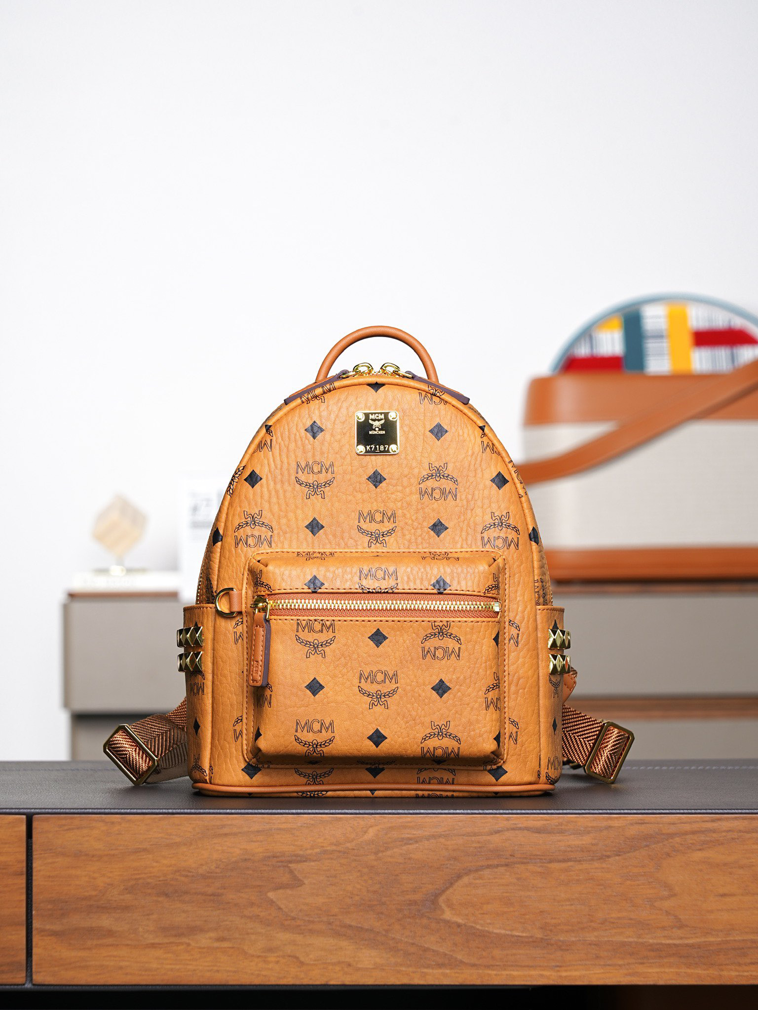秋冬特惠💰850 原单MCM 原厂皮 干邑色迷你号 铆钉双肩背包MMK6SVE37CO001 经典干邑色