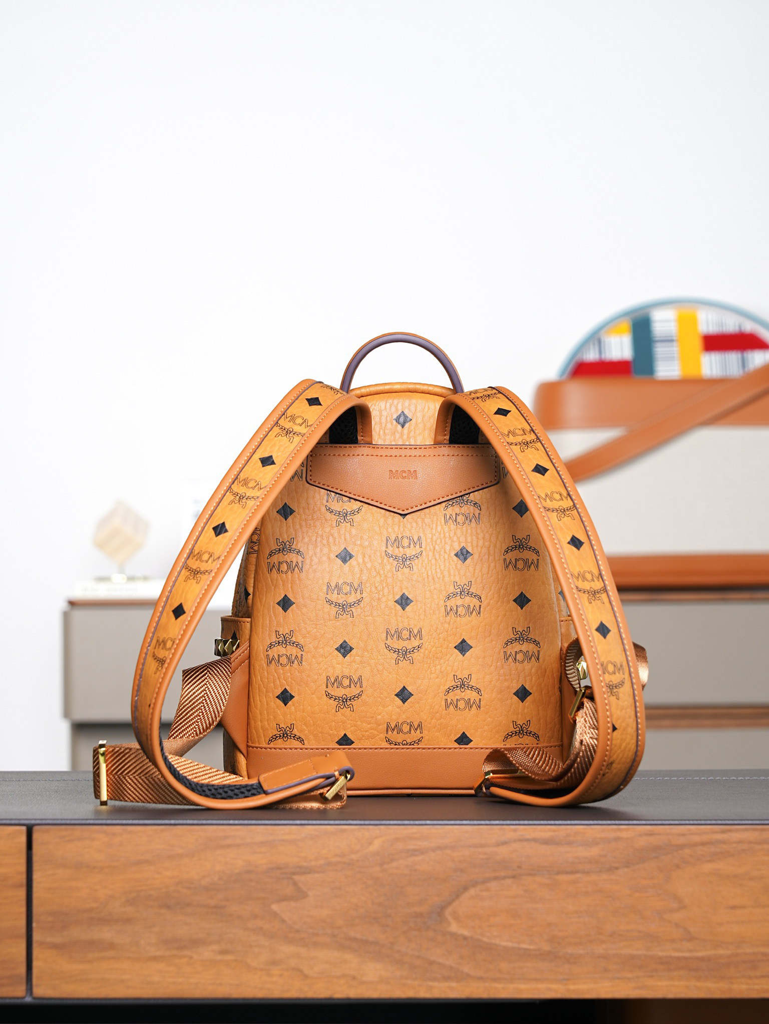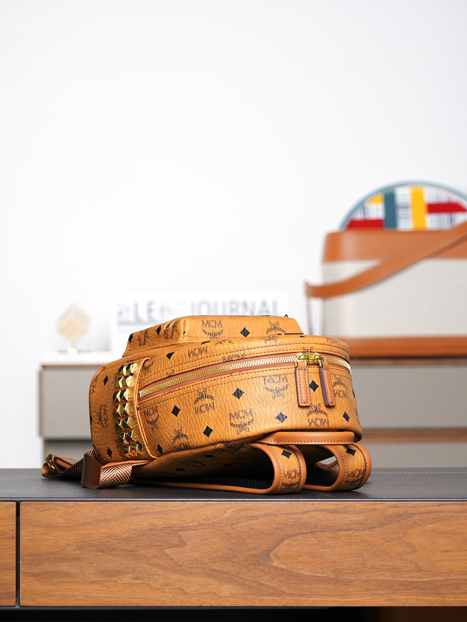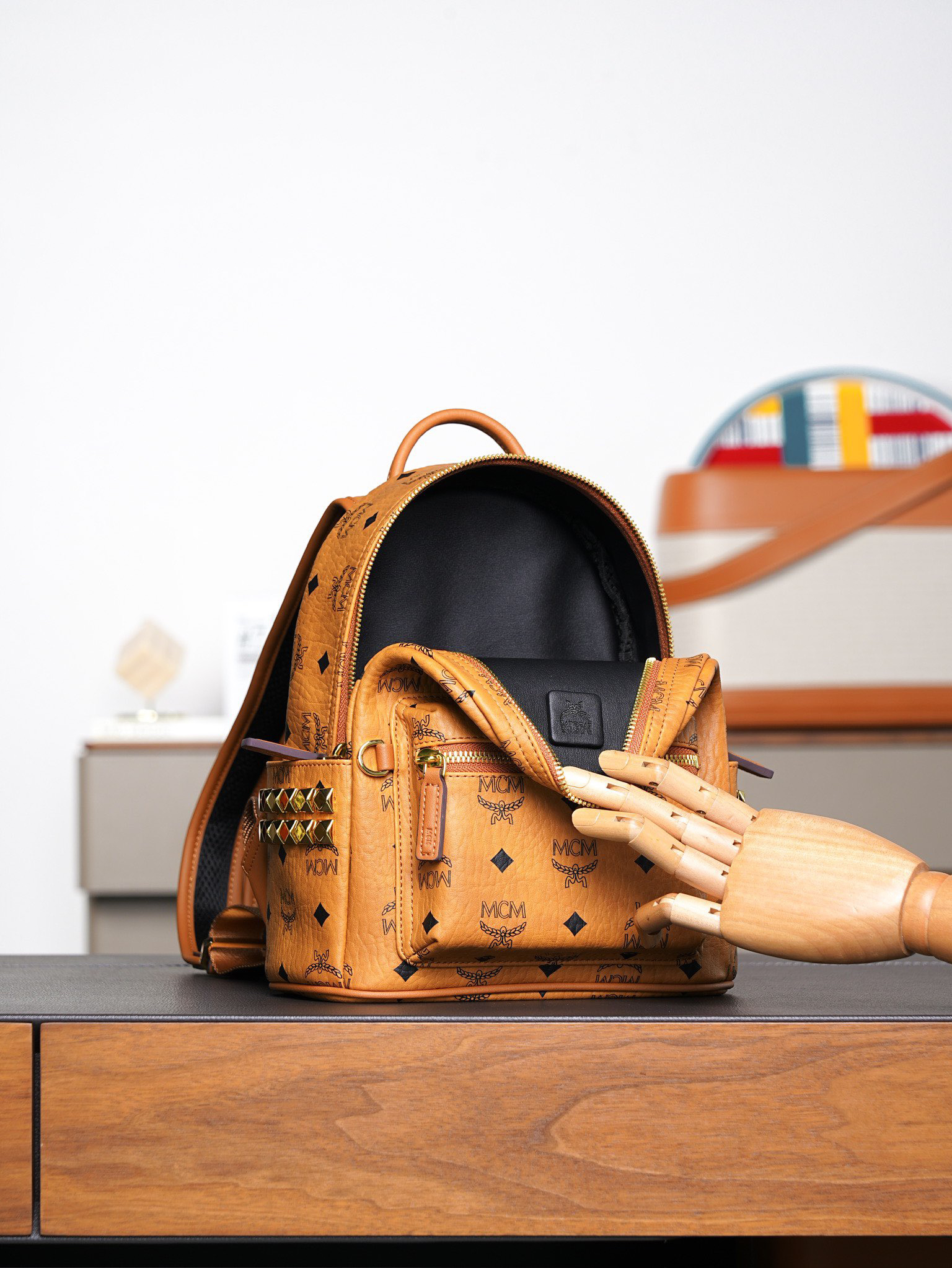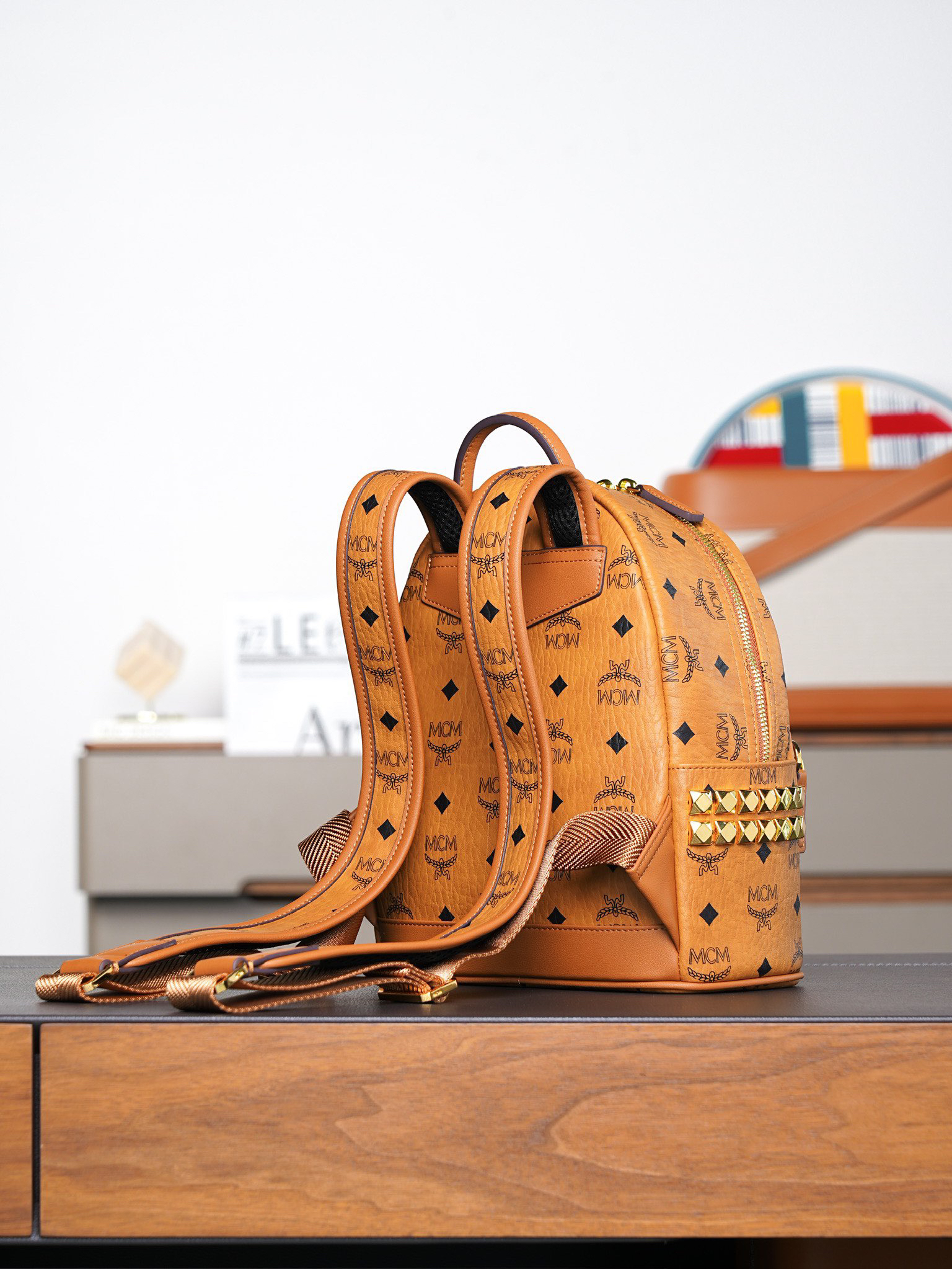 秋冬特惠💰850 原单MCM 原厂皮 干邑色迷你号 铆钉双肩背包MMK6SVE37CO001 经典干邑色
