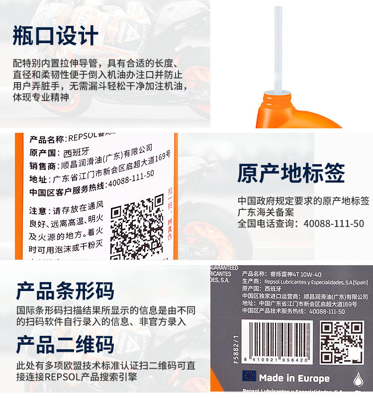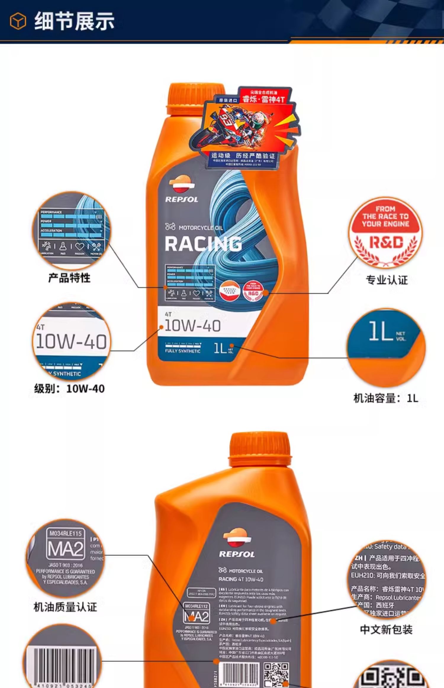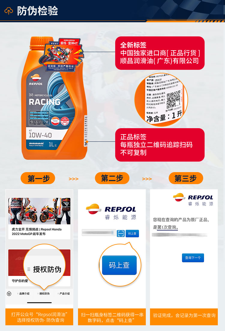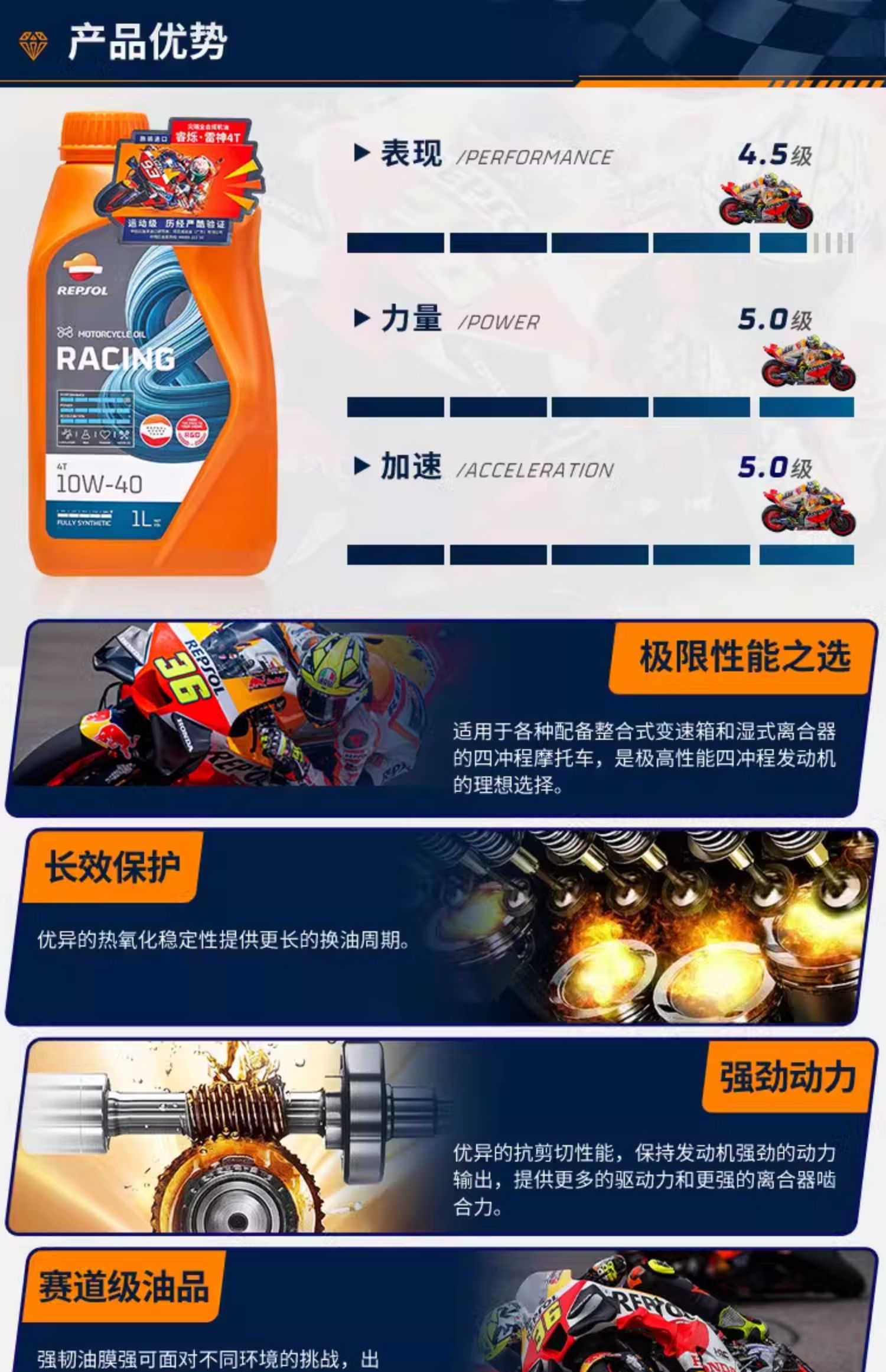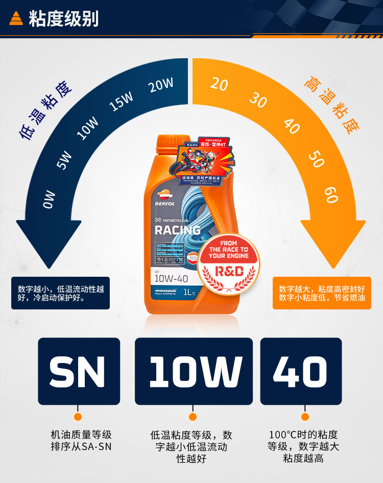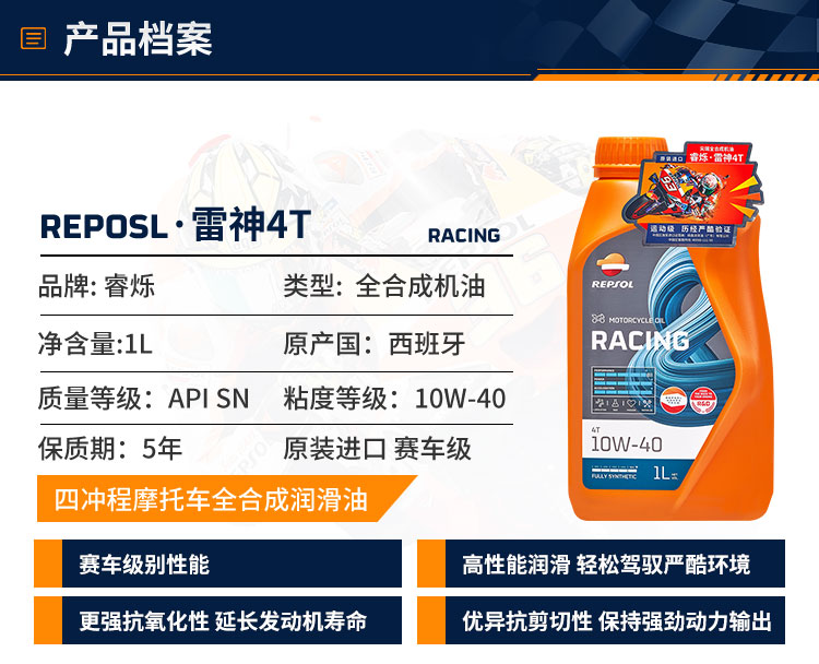 repsol睿烁威爽雷神10W-40摩托车机油 赛道级RACING全合成SN