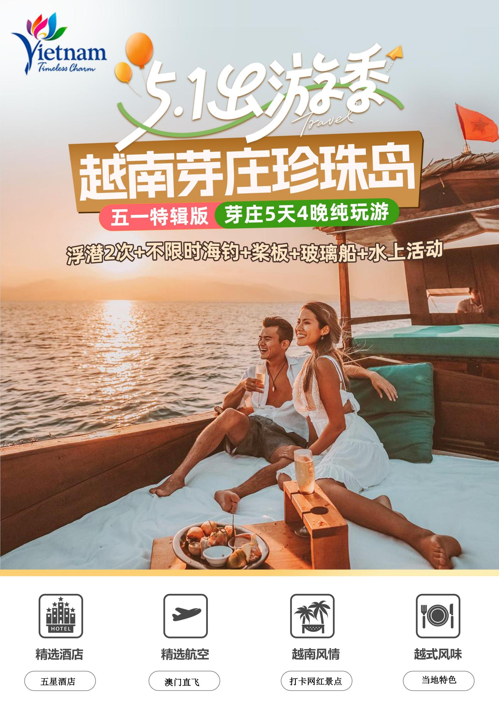 【五一】<越南芽庄出海+珍珠岛5天团>澳门直飞,深圳起止