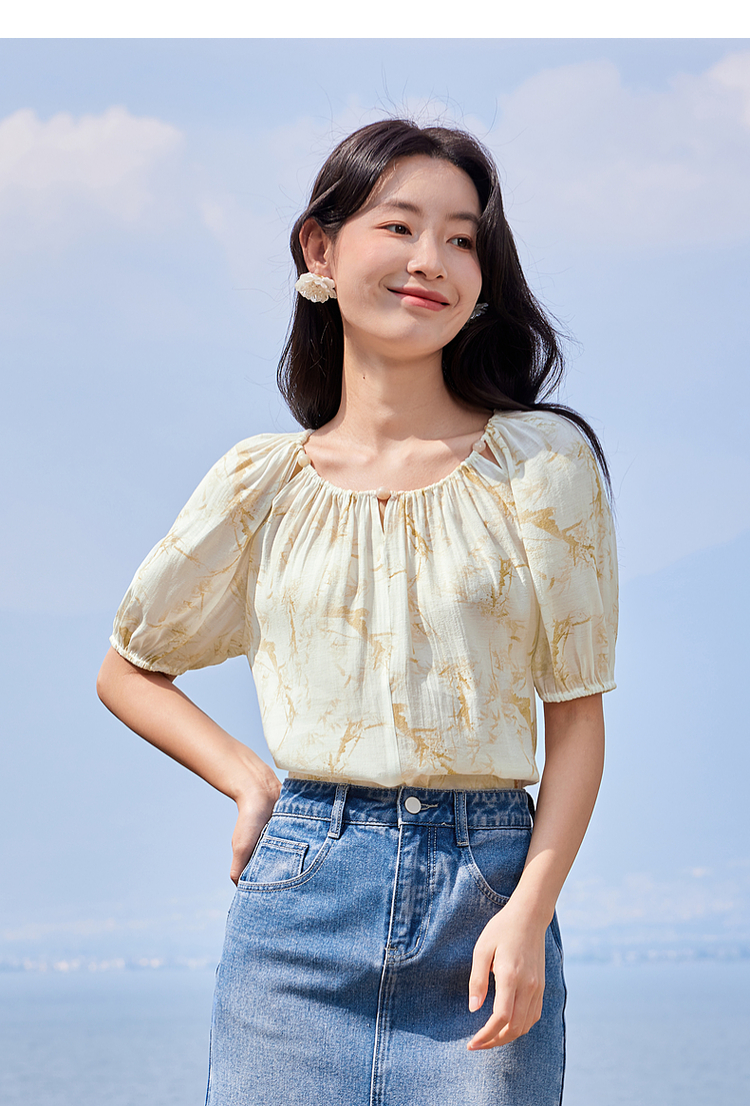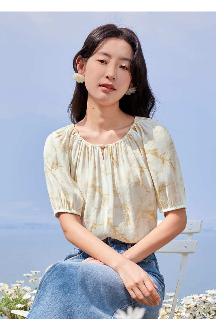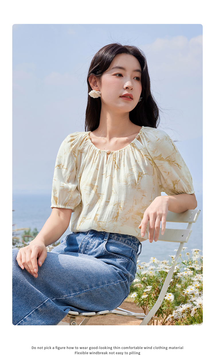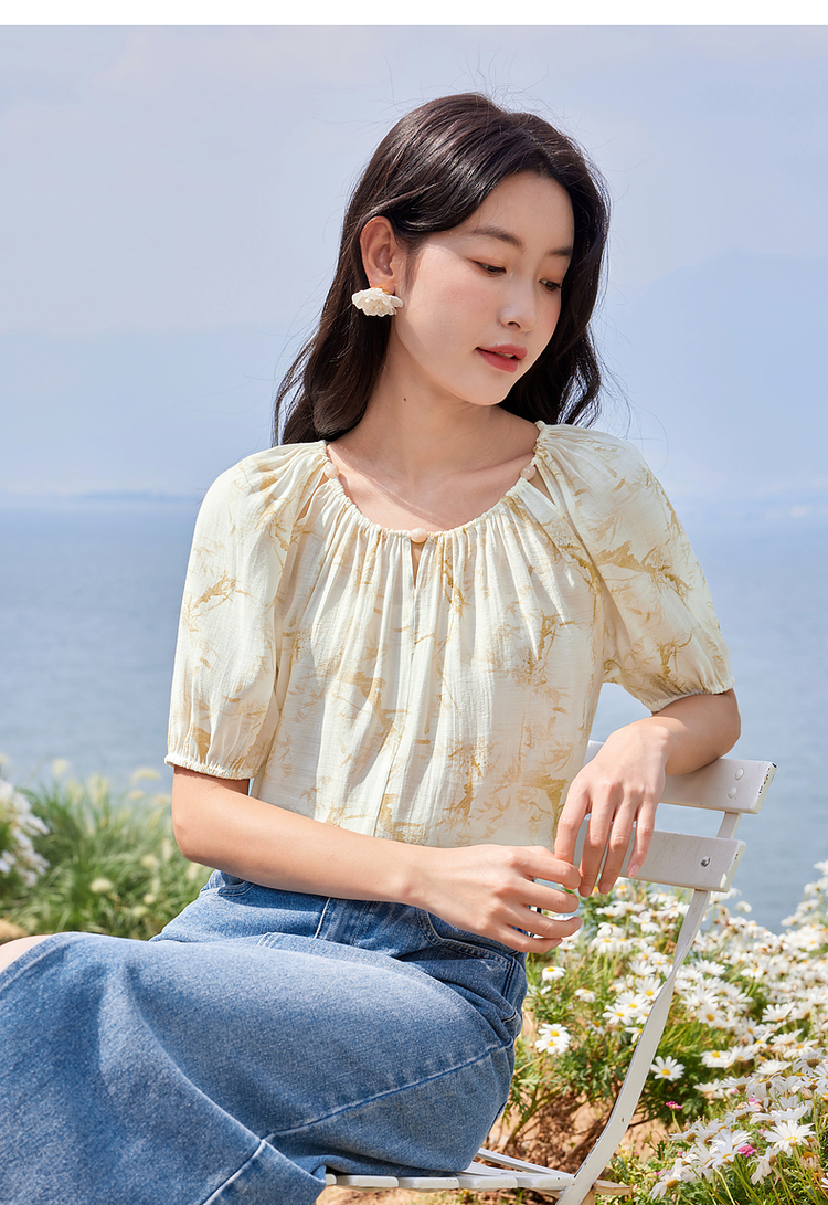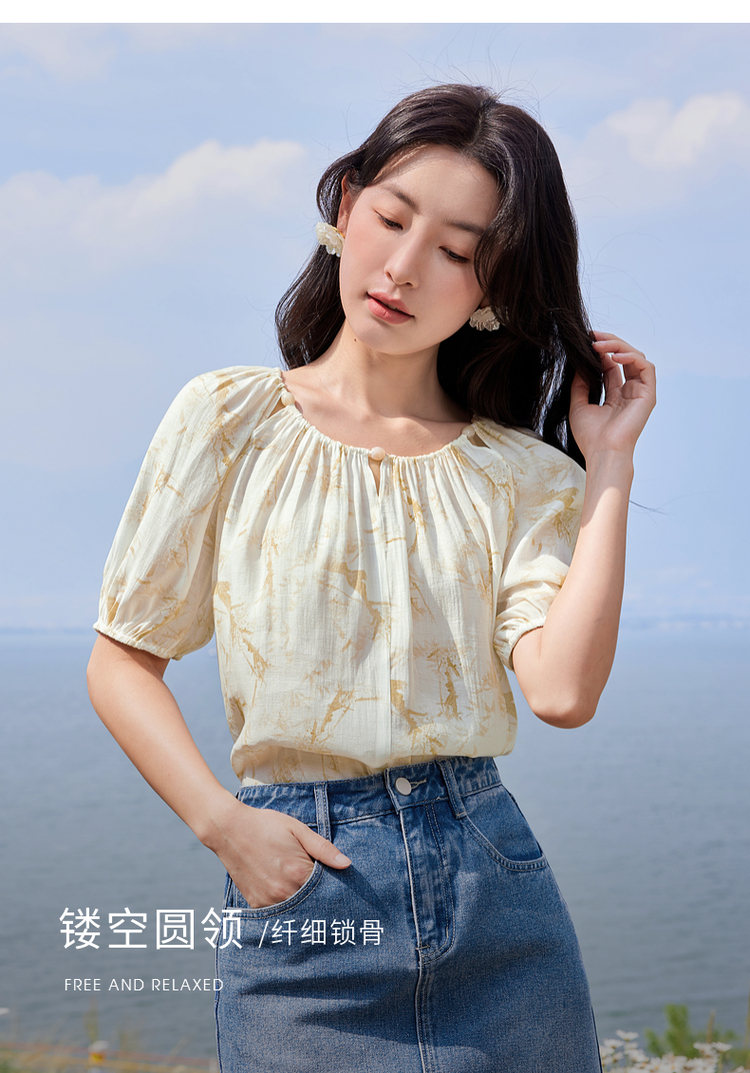 【专属特价】熙世界水墨晕染碎花雪纺衫2025夏季新款泡泡袖法式减龄气质上衣
