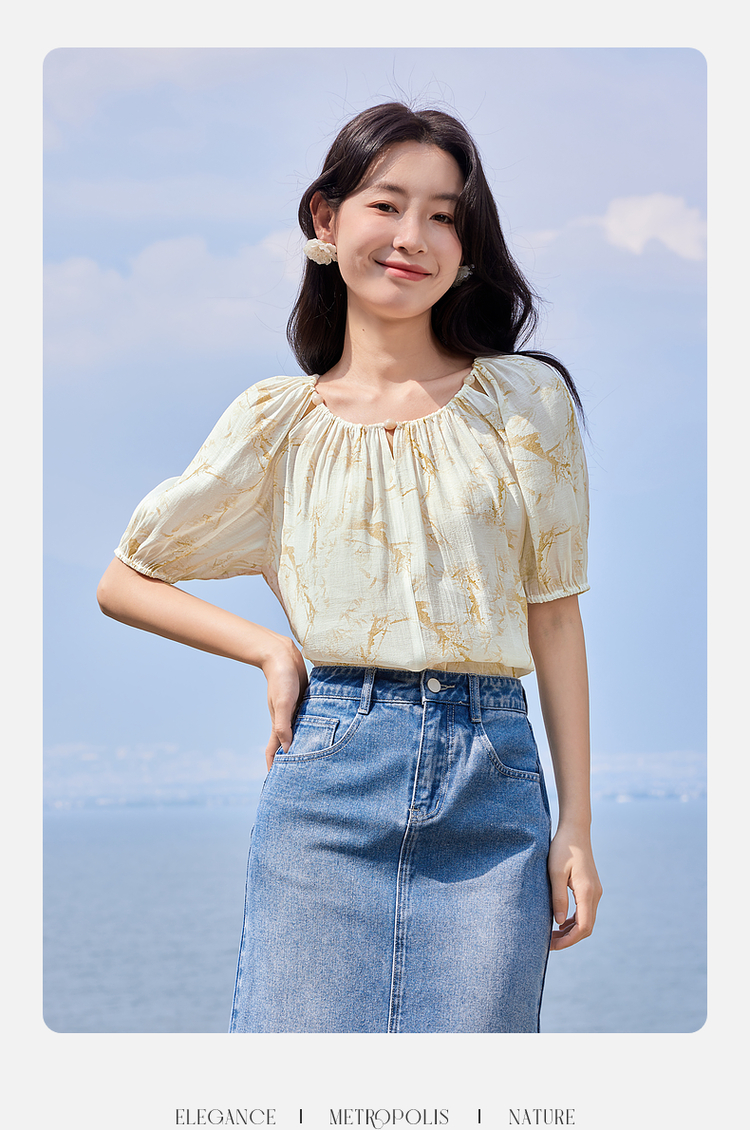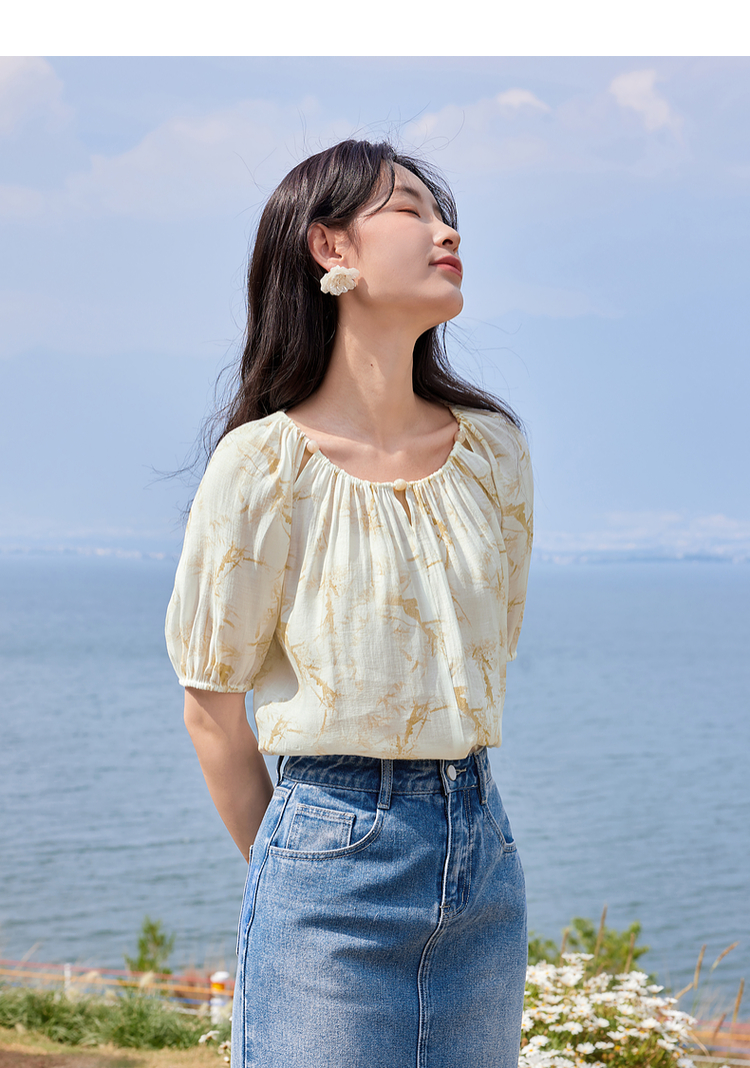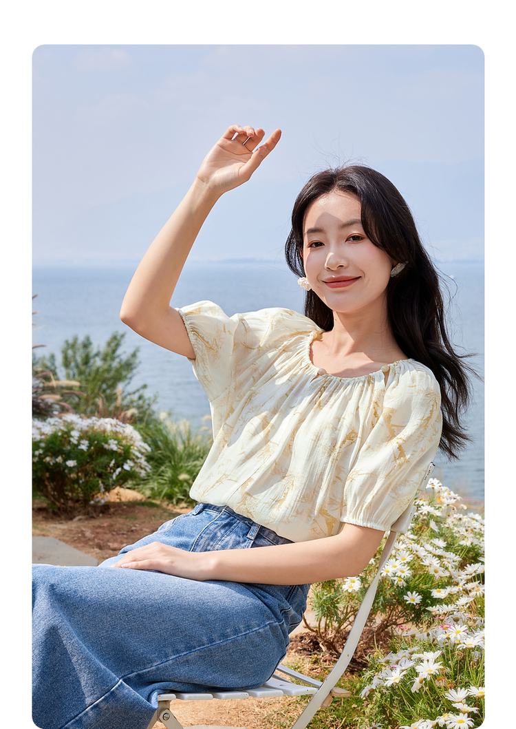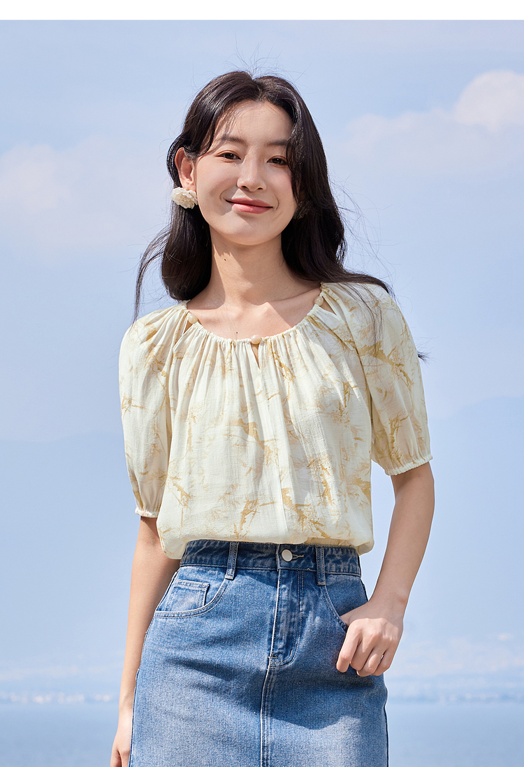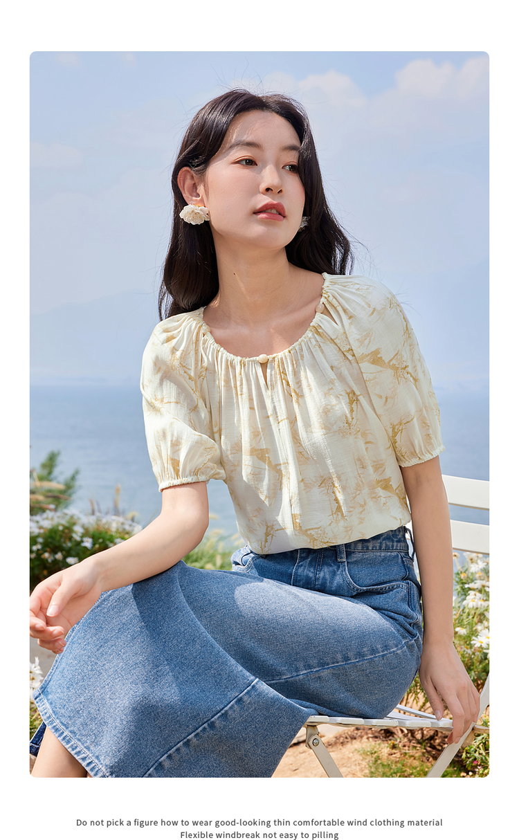 【专属特价】熙世界水墨晕染碎花雪纺衫2025夏季新款泡泡袖法式减龄气质上衣