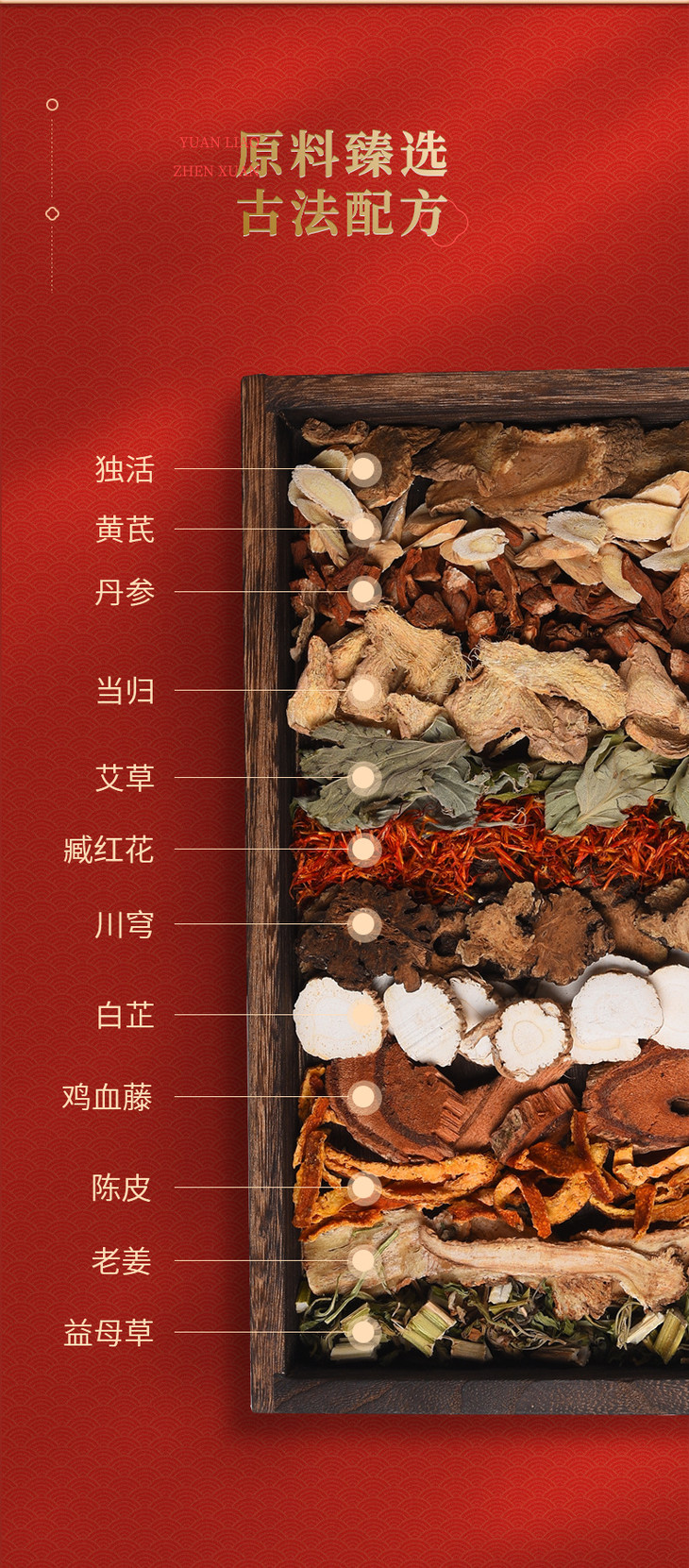 成分:丹参、老姜、川芎、艾草、黄芪、红花、益母草、当归、白芷、独活、鸡血藤、陈皮