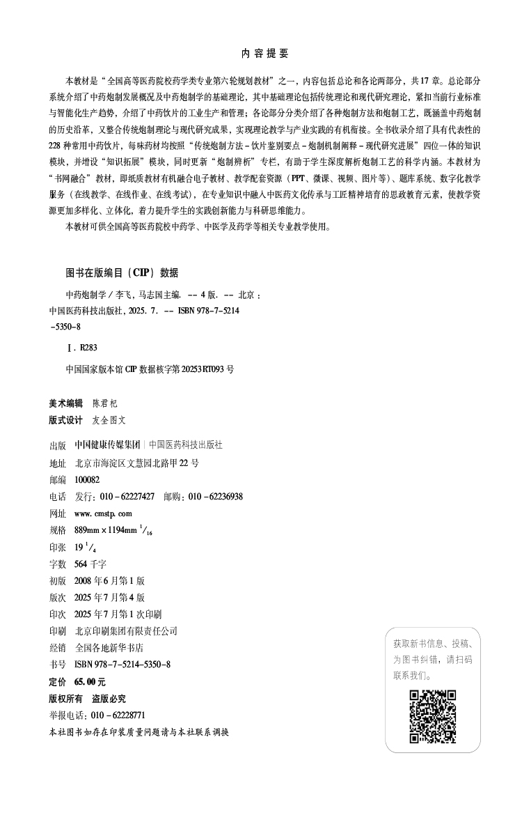 中药炮制学 第4四版 (全国高等医药院校药学类专业第六轮规划教材) 李飞 马志国 主编 供中药学及相关专业用 中国医药科技出版社