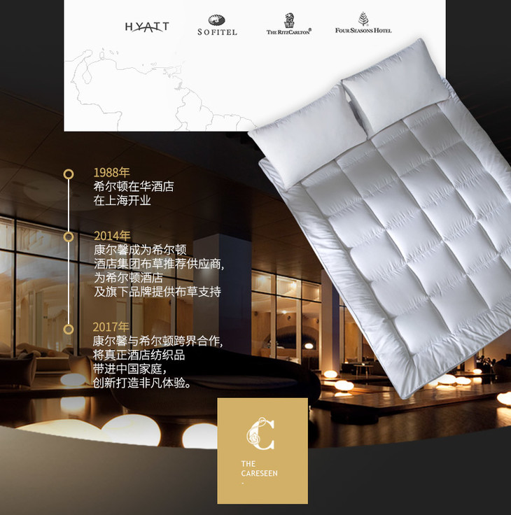 源自五星级酒店的奢华家纺品牌,康乃馨首次提出打造“酒店+家纺”的全新概念,将更为严格的五星级酒店纺织品品质标准与家纺相结合,完美诠释“酒店品质家纺”的舒适感受与奢华品味。