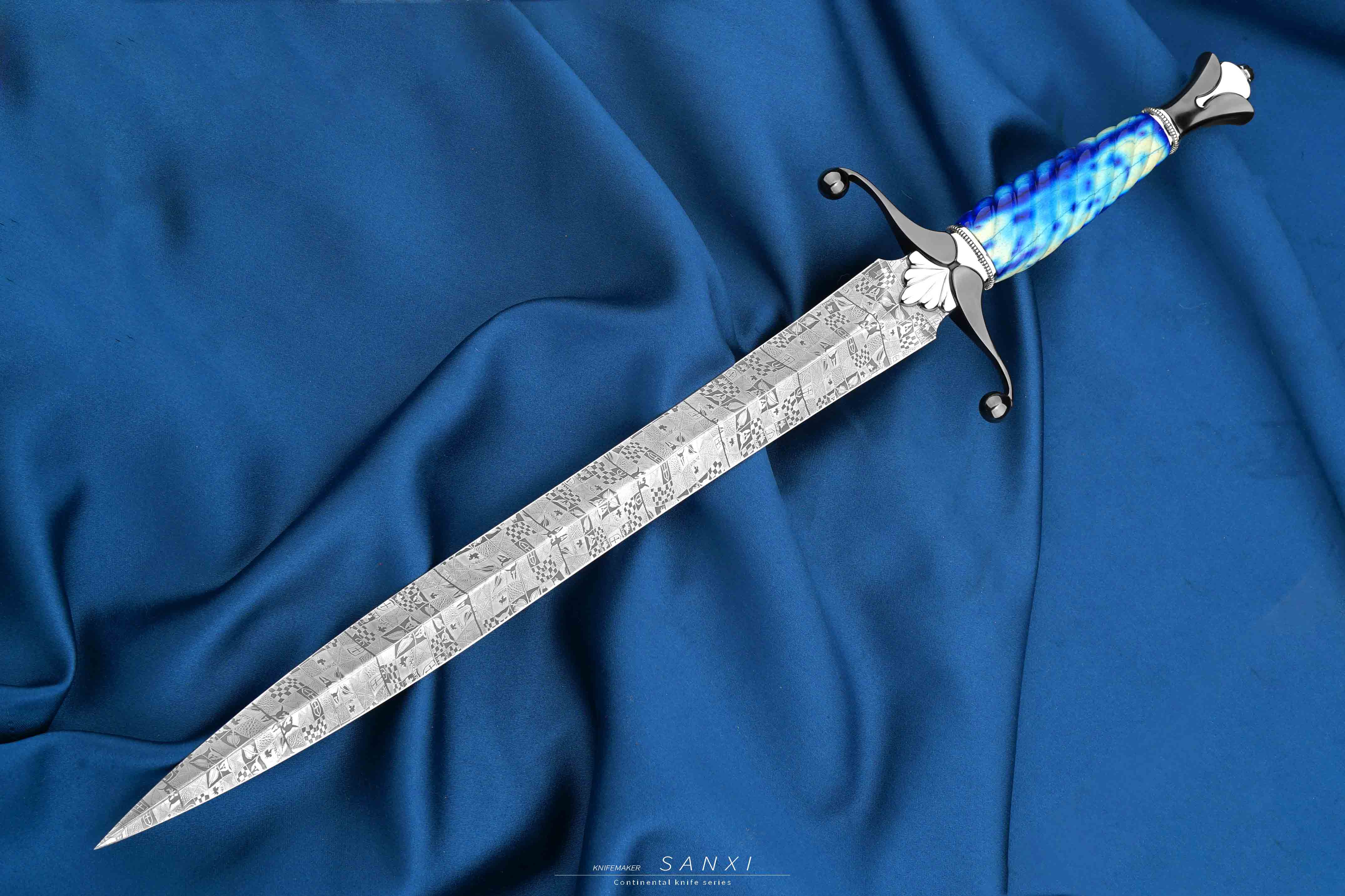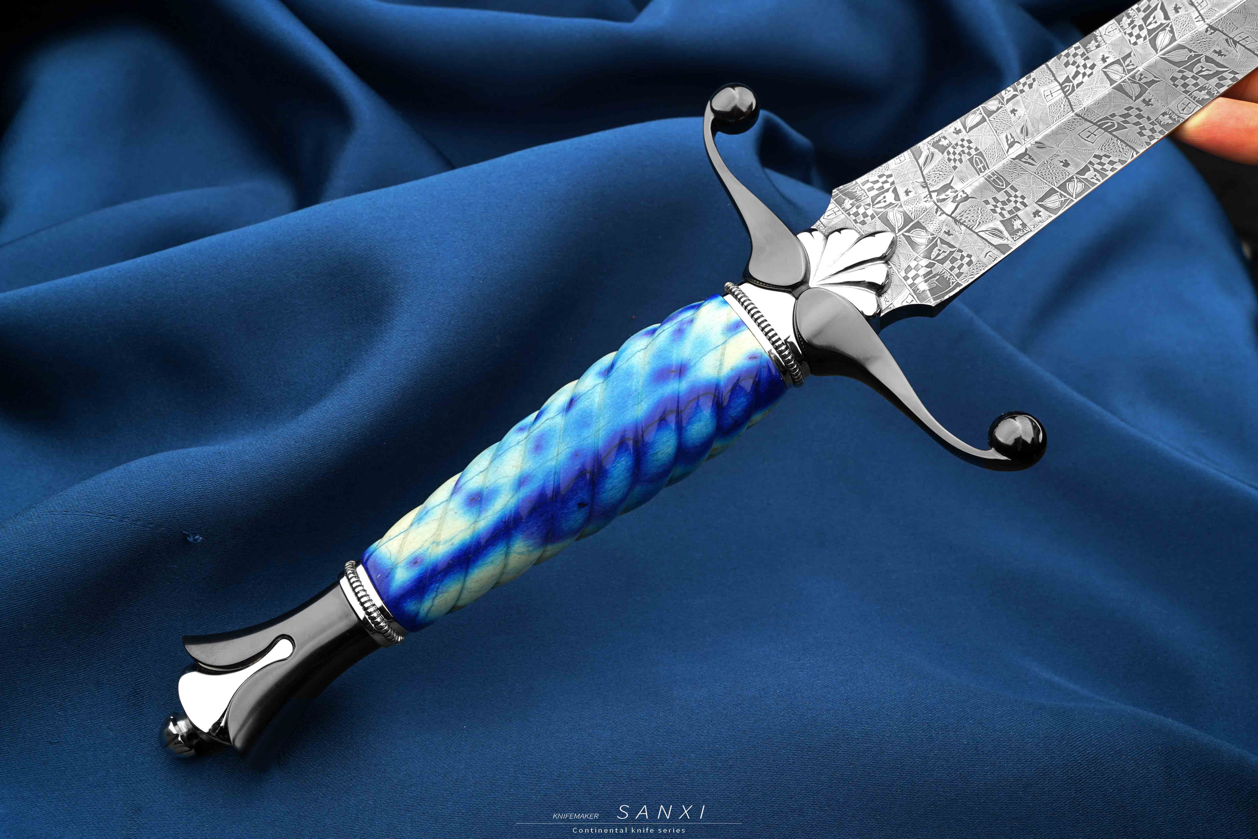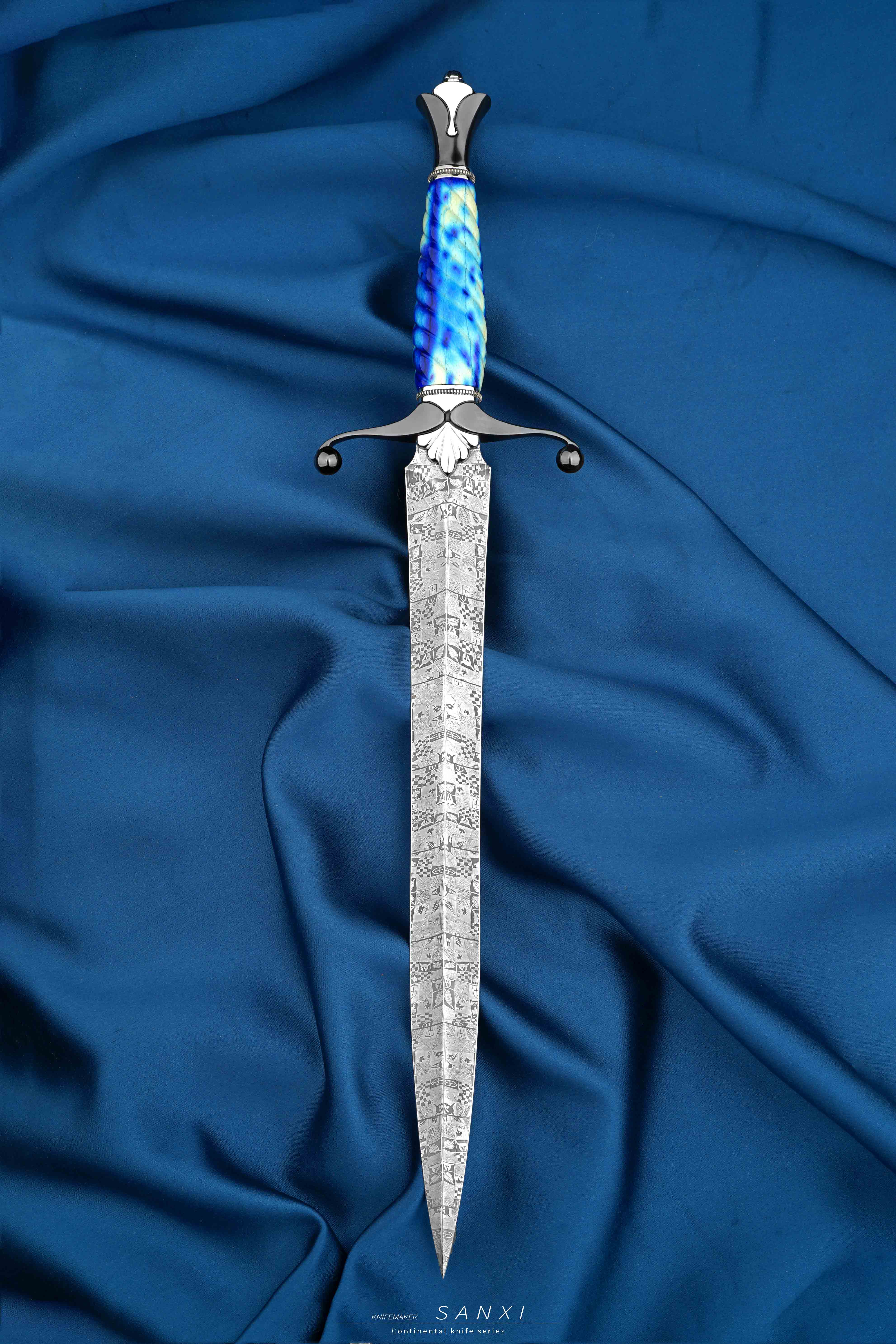 高配大马短剑,这只尺寸加大了,比较值得,复杂锻打多利亚勇士大马士革钢,用了一块上好的玉化猛犸,润度看的到