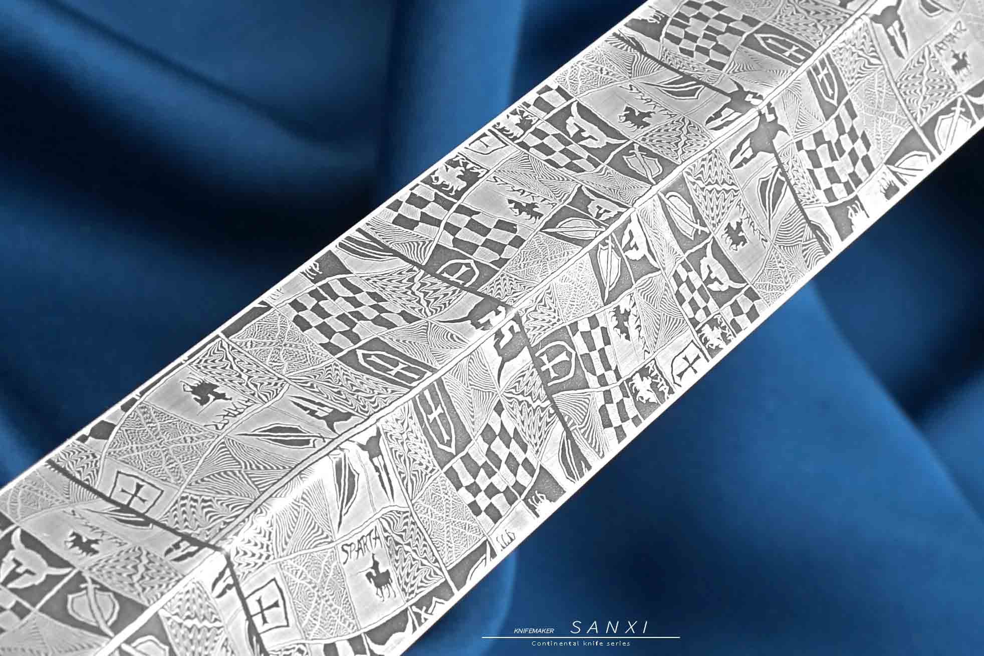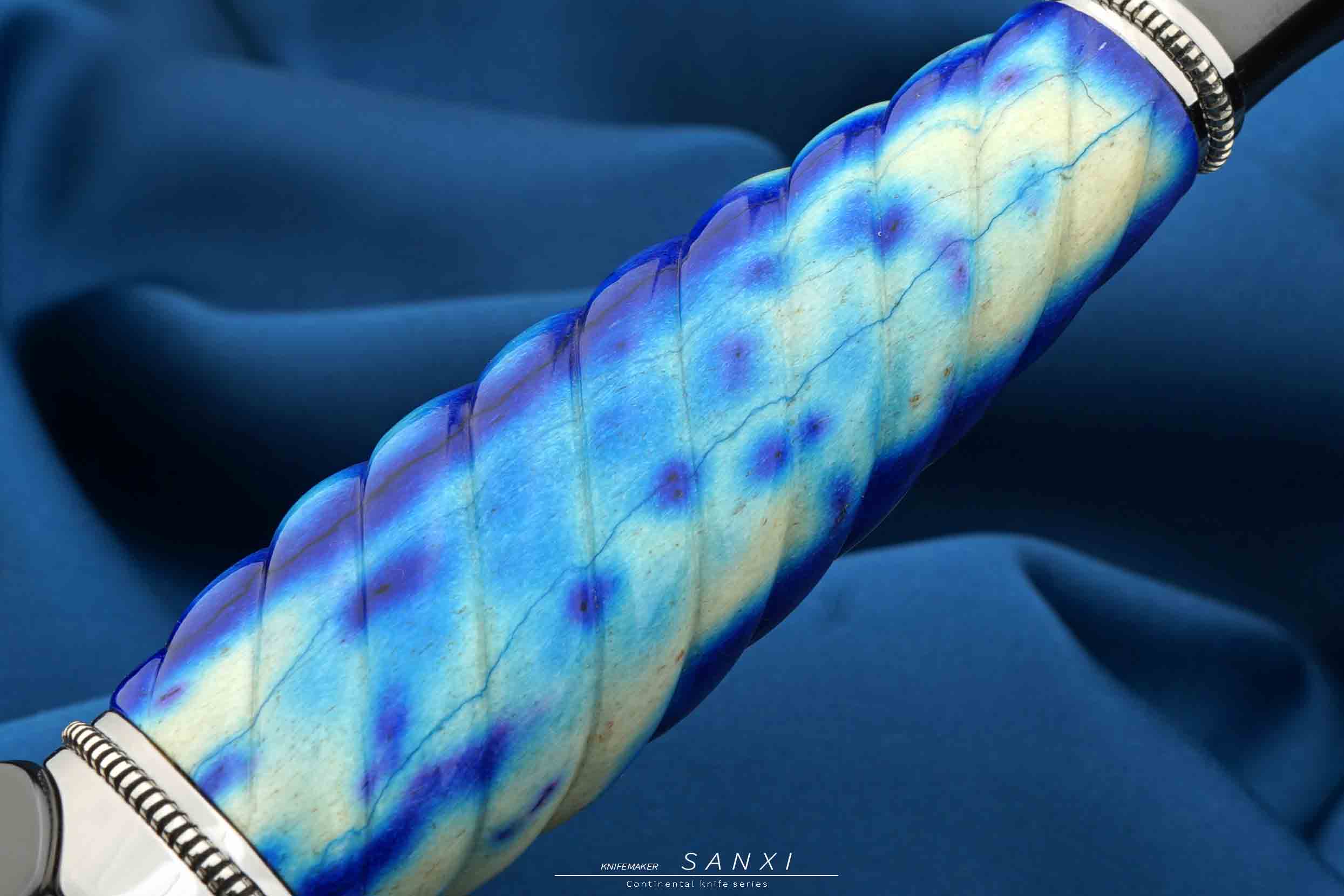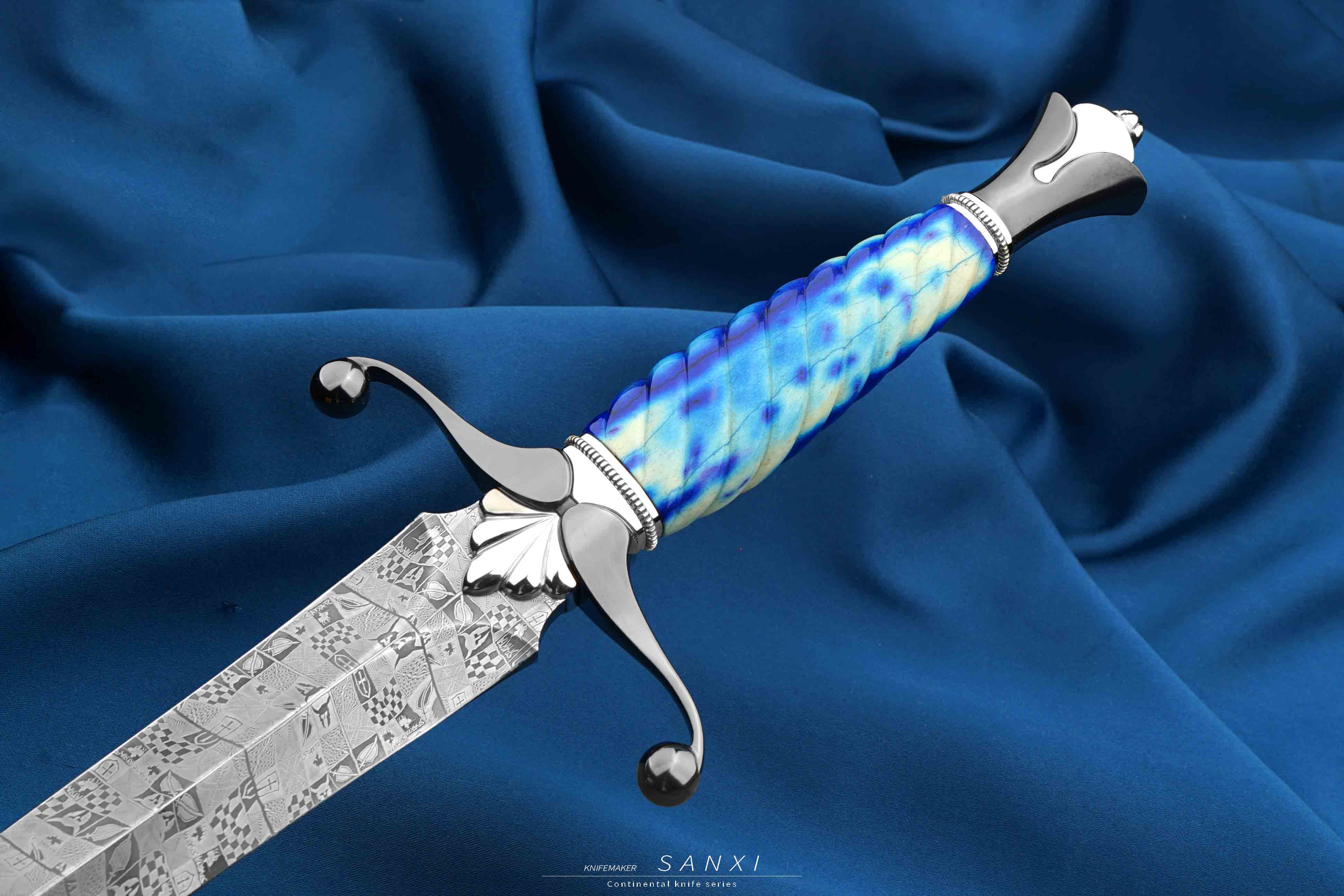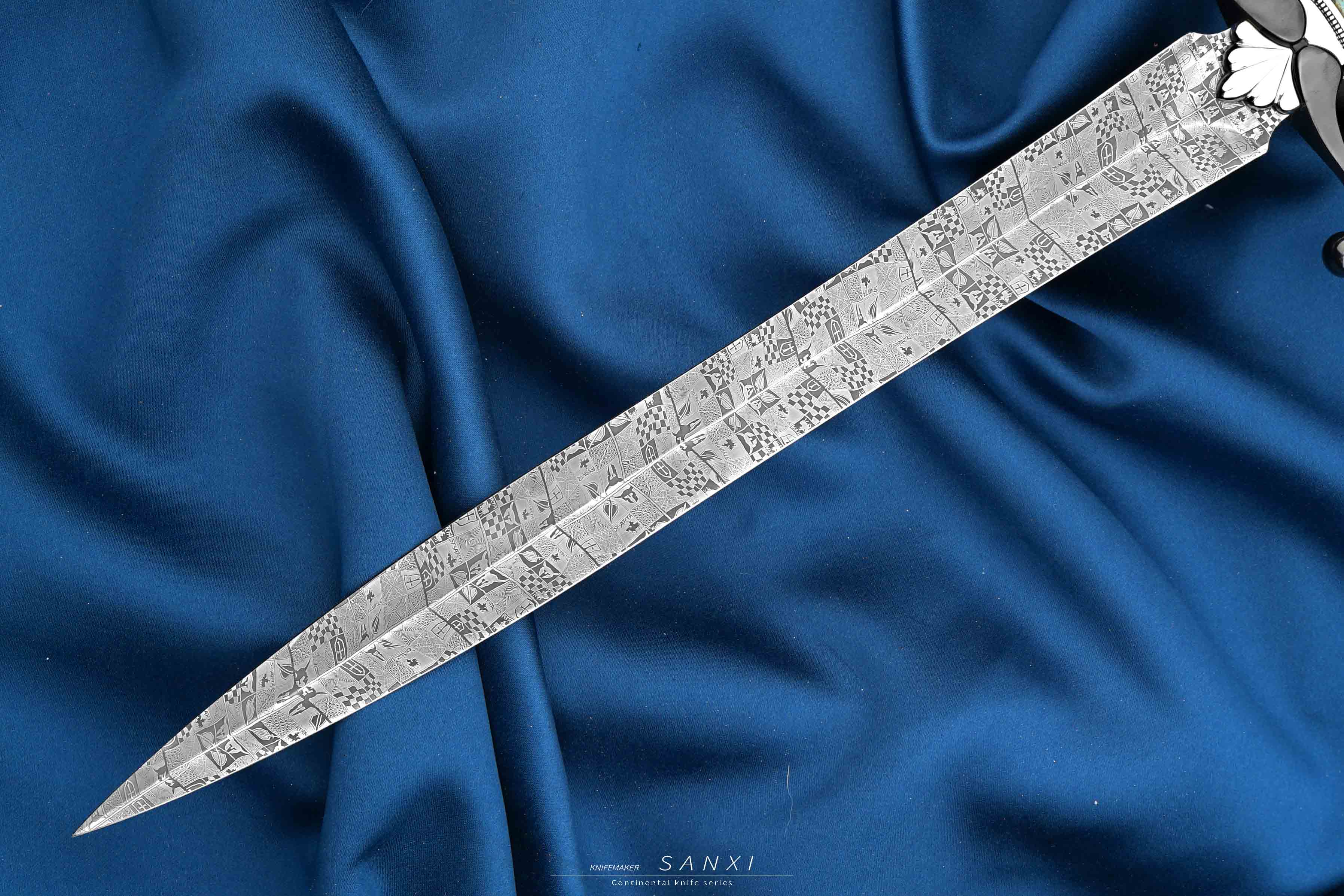高配大马短剑,这只尺寸加大了,比较值得,复杂锻打多利亚勇士大马士革钢,用了一块上好的玉化猛犸,润度看的到