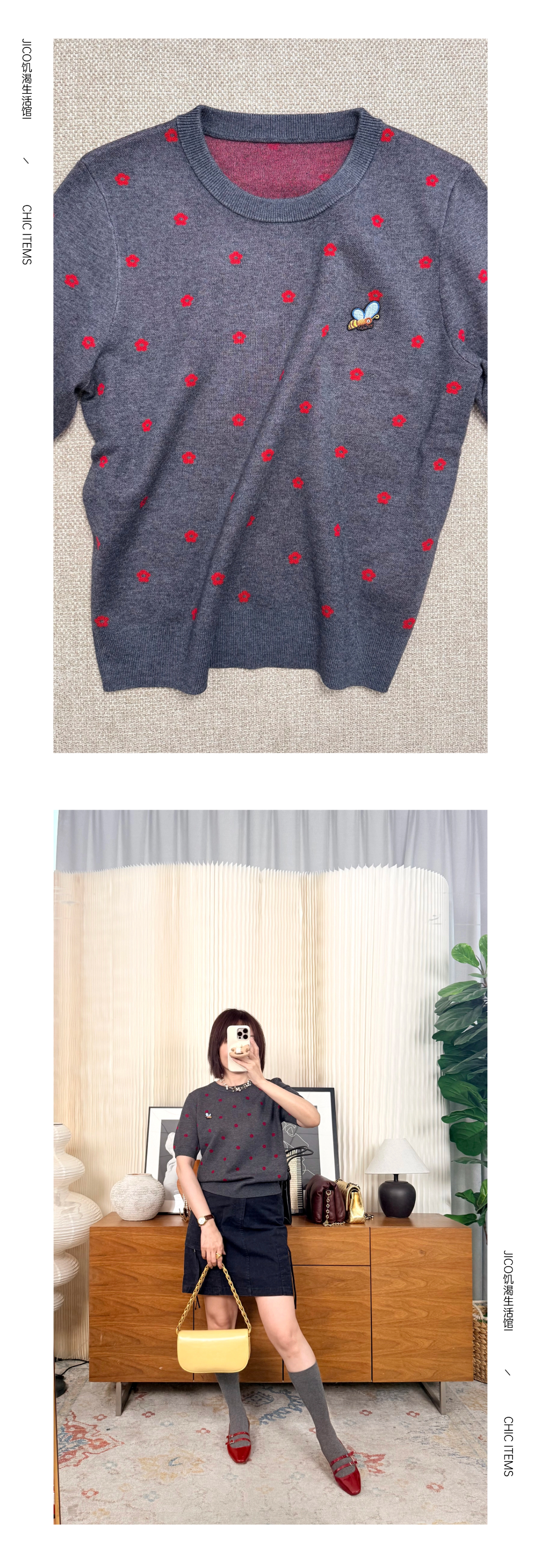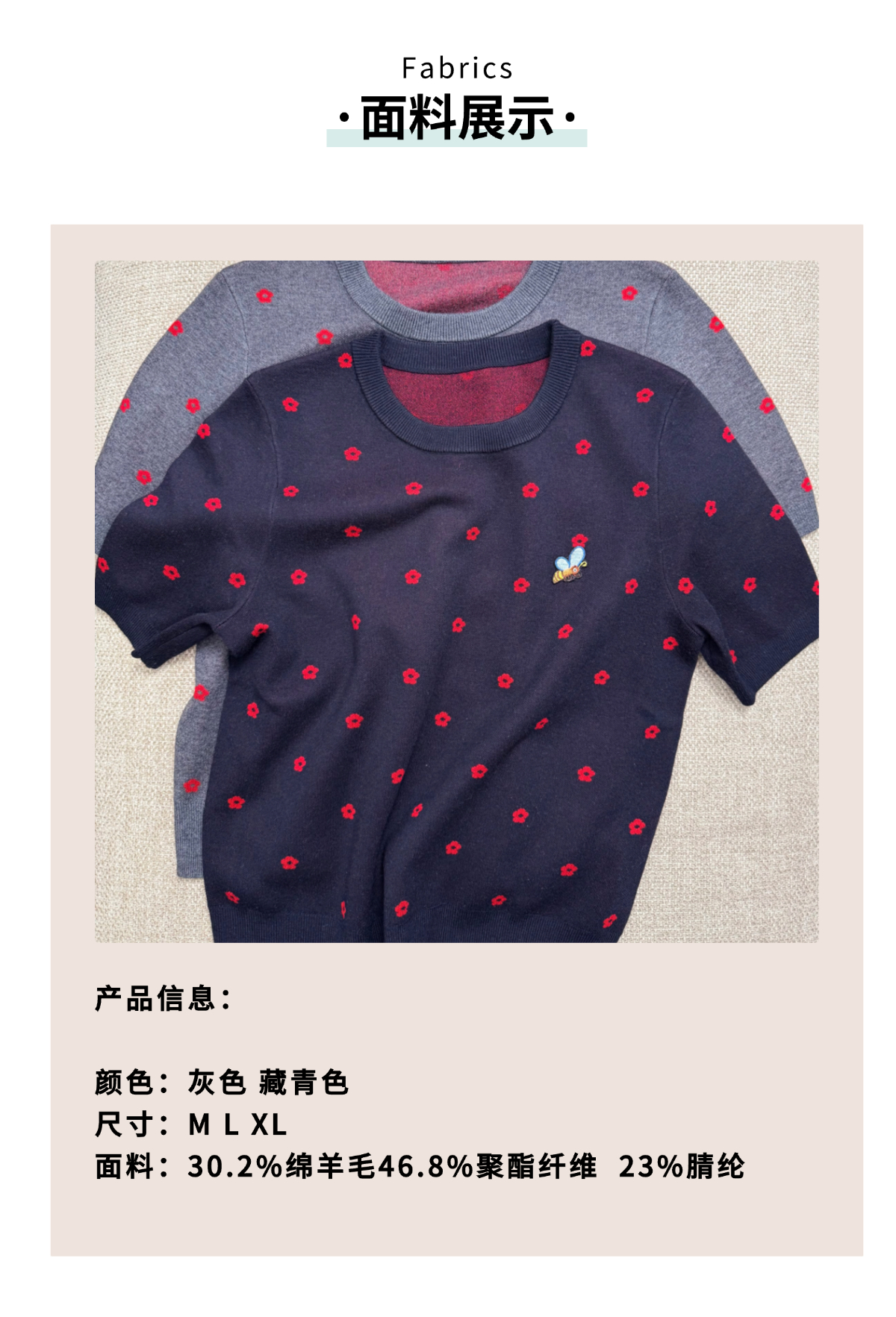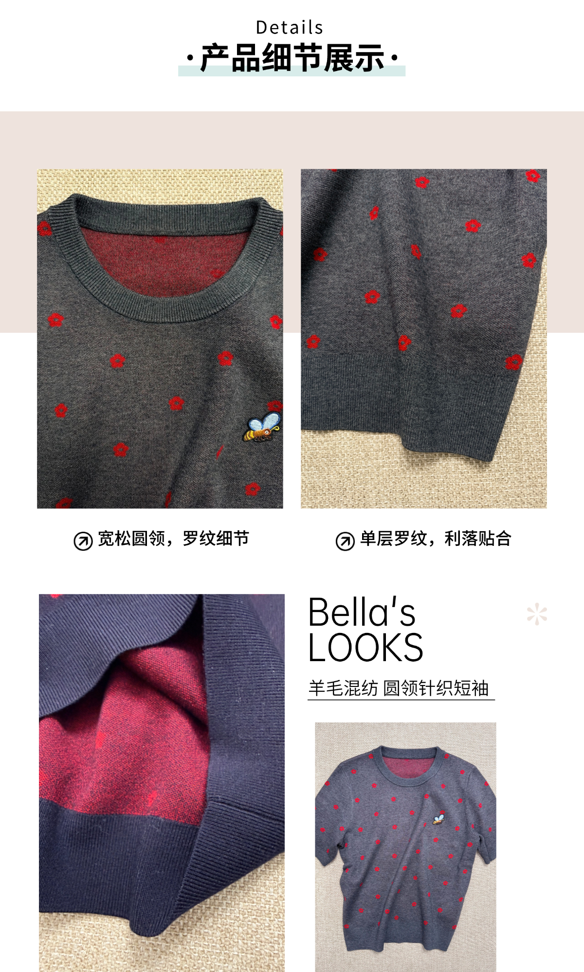 那些花儿 小禾同款羊毛混纺 圆领针织短袖T 蜜蜂刺绣宽松版型 双面织法 克重重磅