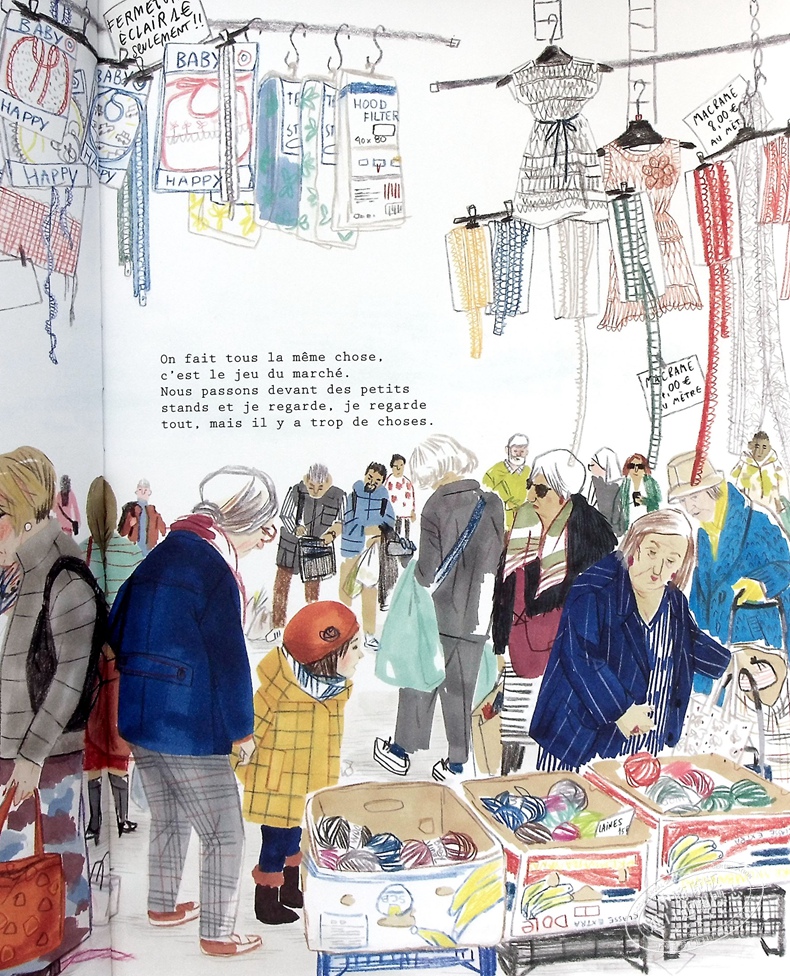 Le marché se déploie au coeur de la ville, avec ses stands, ses parasols, ses pancartes en tous genres et l'enthousiasme de ses vendeurs. On y suit cette petite fille et sa grand-mère, exploratrices privilégiées. D'allées en allées, main dans la main, elles sont à la recherche - et le lecteur avec elles - de trésors à dégoter, objets utiles ou gourmandises futiles. Il y a tant à voir, toucher, sentir...