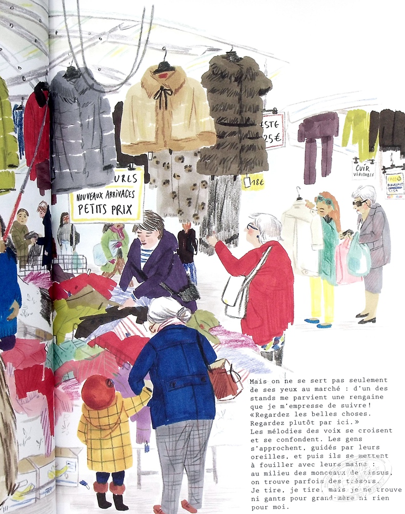 Des stands de vêtements à ceux des objets, des étals de poissons aux stands colorés du maraîcher, le marché, véritable terrain de jeux à explorer, déploie ses couleurs, ses odeurs et sa mélodie bien à lui. Aller au marché devient une aventure en soi qu'on a le privilège de découvrir quand on rate l'école ! Le jeune lecteur aura plaisir à découvrir, nommer, compter les objets parfois loufoques qu'on trouve au marché et à chercher avec la jeune narratrice les gants convoités par sa grand-mère !