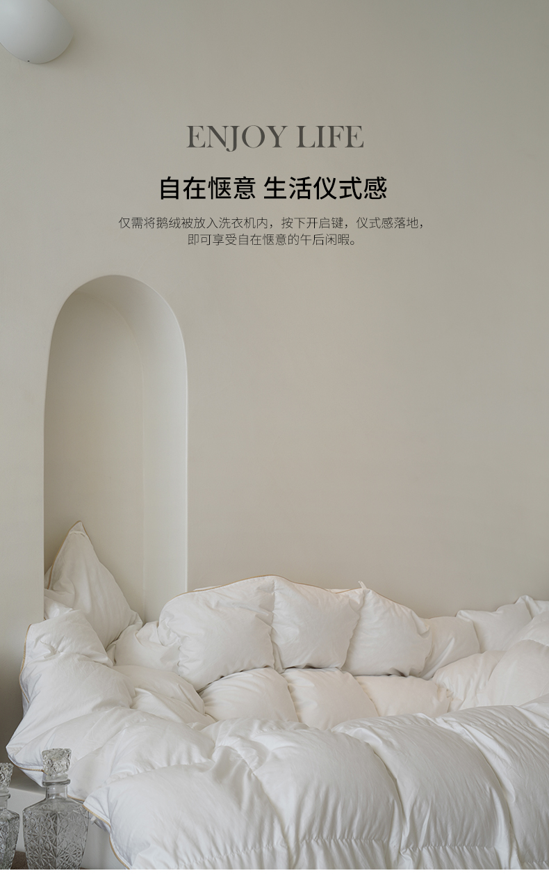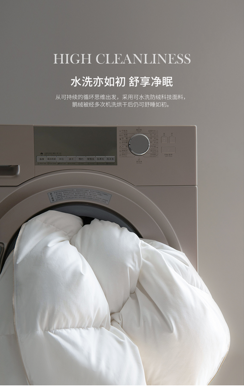 有些人有可能担心鹅绒被会不会有味道,大家可以放心,因为鹅绒进入工厂后会经历33道水洗、烘干、再冷却,经过分毛后臻选出的鹅绒含量达到95。