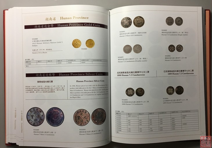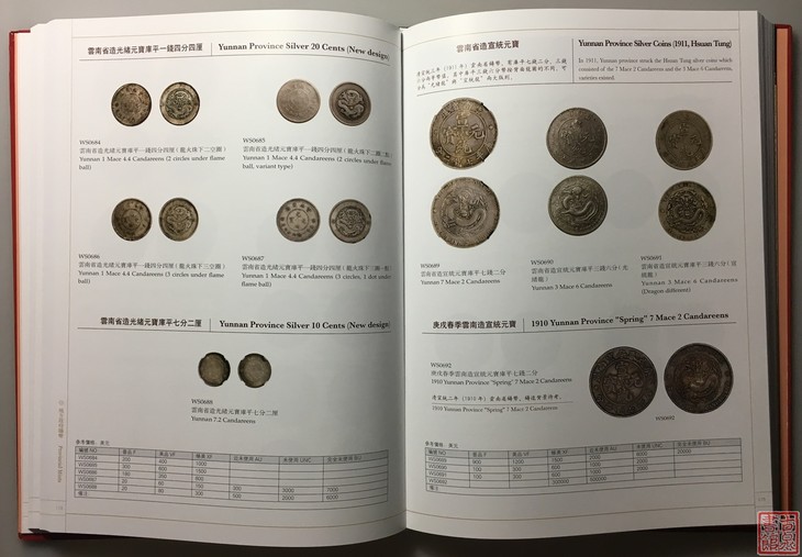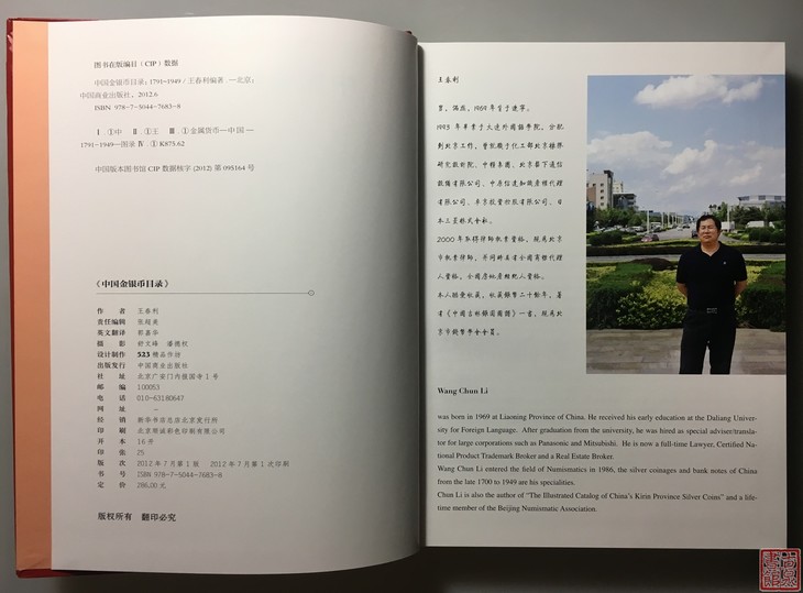 国内第一部彩色印刷的综合性清代、民国金银币目录书《中国金银币目录》1791-1949(清代、民国篇)(ISBN-7-5044-7683-8),由王春利编著,该书收录清代民国银币1463枚,并附录臆造币及在华流 外国银元主币125枚,共计1588枚。书中图片大部分为国内外知名藏家的实物进行拍摄的,该书为精装设计,大十六开本,全书351页,中英文对照,书中标明的价格为近几年市场及拍卖会成交的价格,有很强的参考性。此书与以往的工具书相比,除全书彩色印刷外,还增加了多年来被广泛认可的版别。如大、小头版别、东三省版别、吉林币版别、西藏币版别、江南币版别、川龙、四川卢比版别、云南半元版别、湖北宣统七钱二分版别等。这些为在综合性工具书中首现。是一本很有价值的工具书。