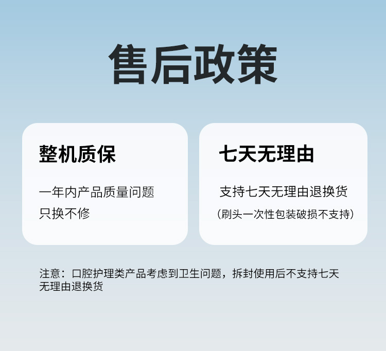 (刷头一次性包装破损不支持)口腔护理类产品考虑到卫生问题,刷头一经拆封视为已使用,不支持七天无理由退换货