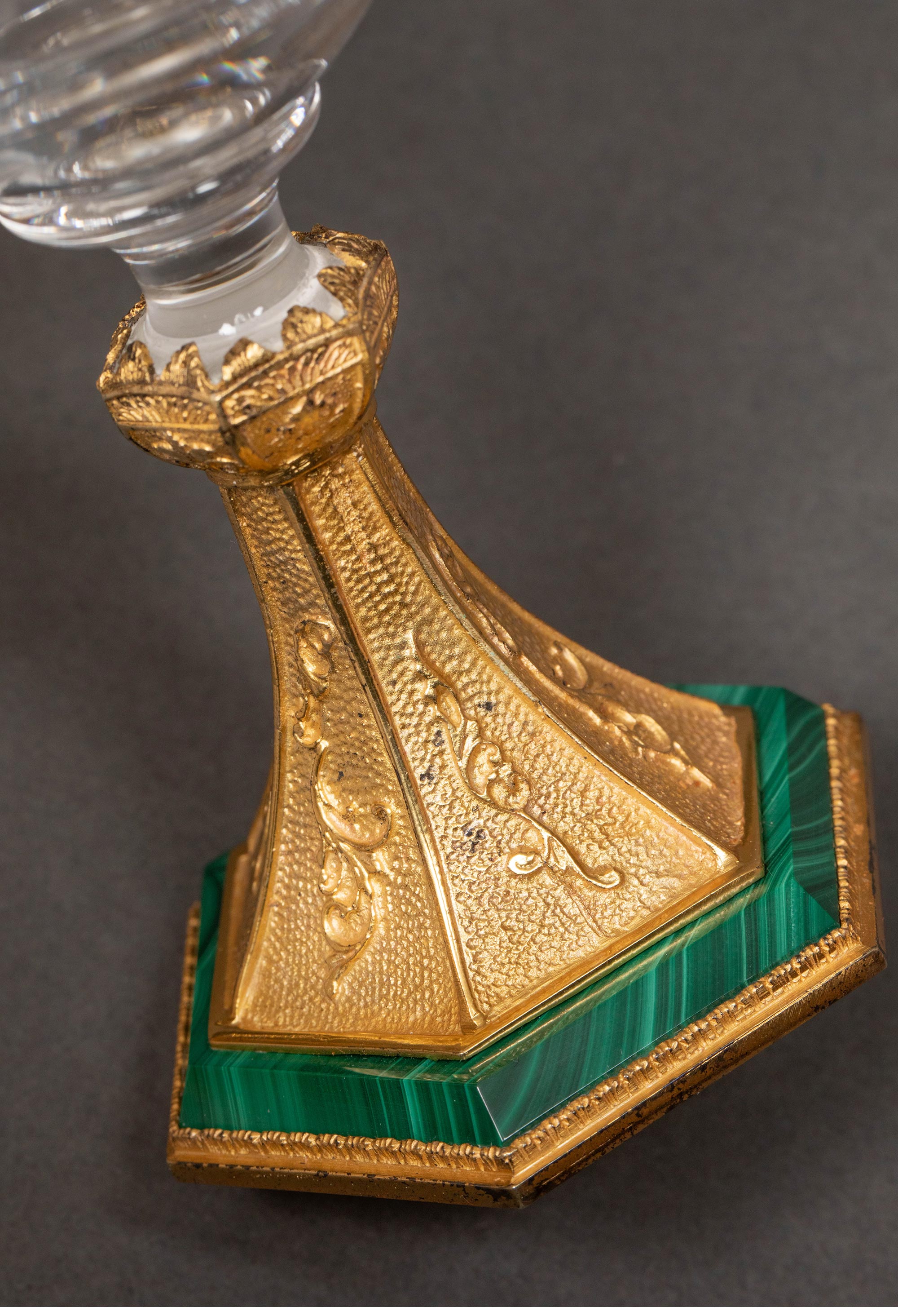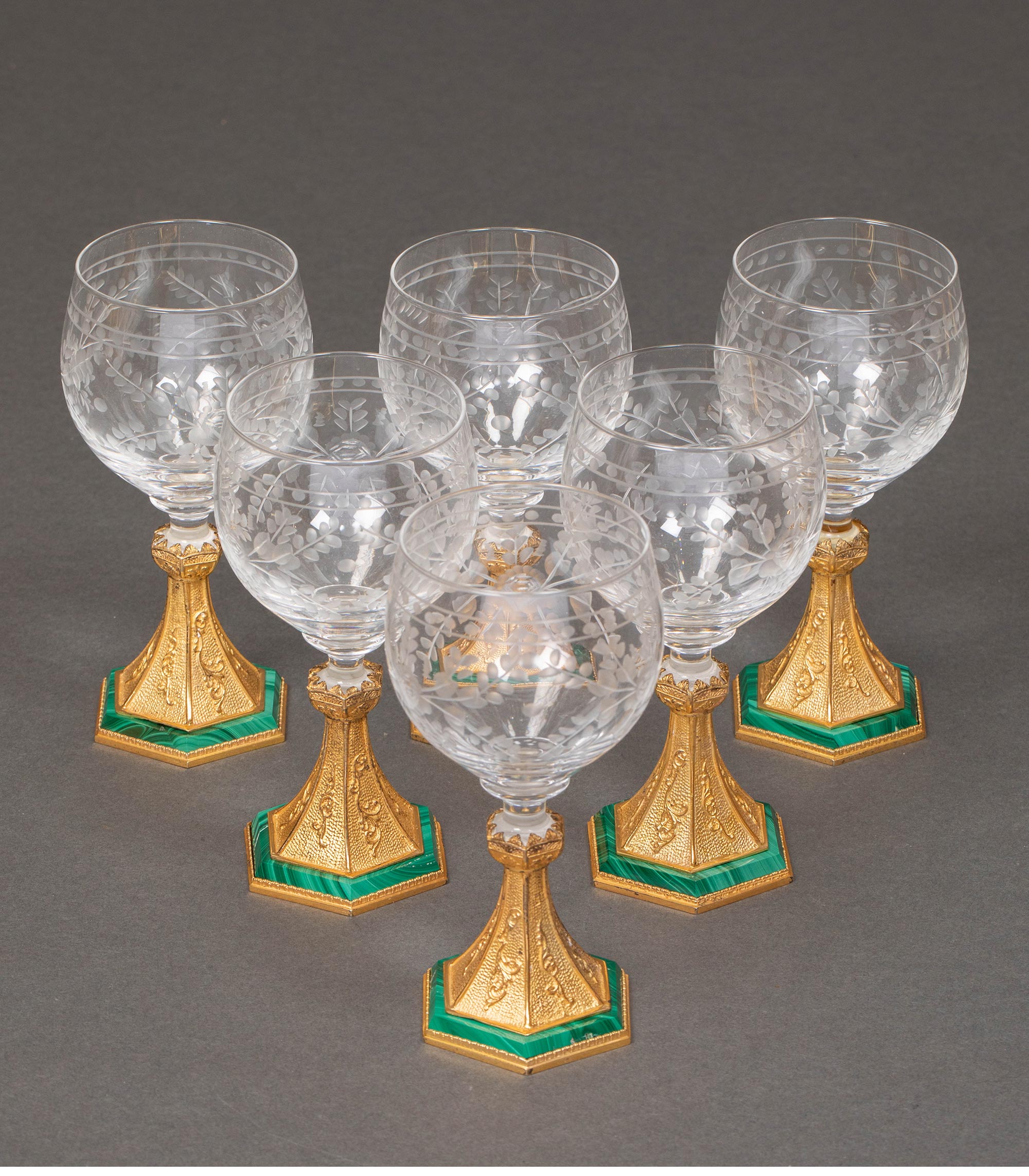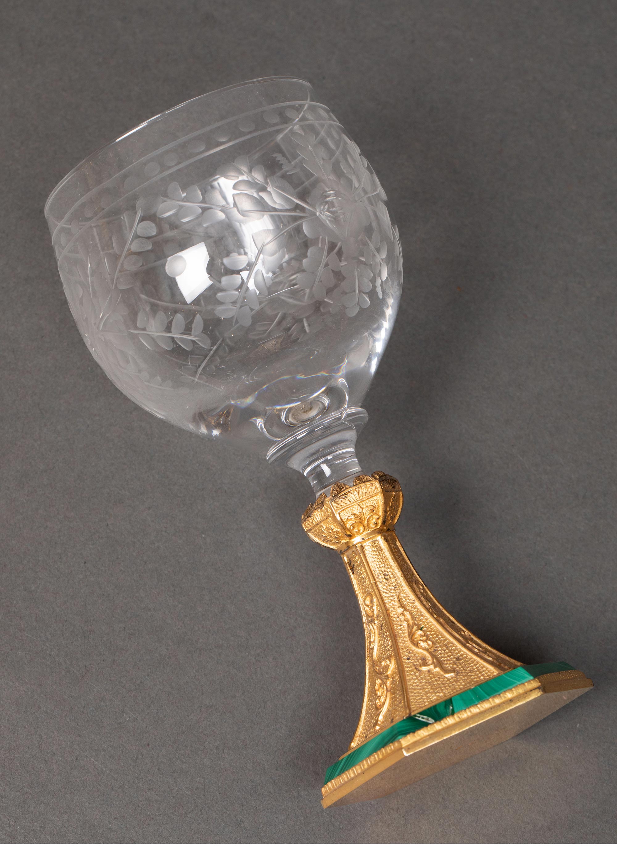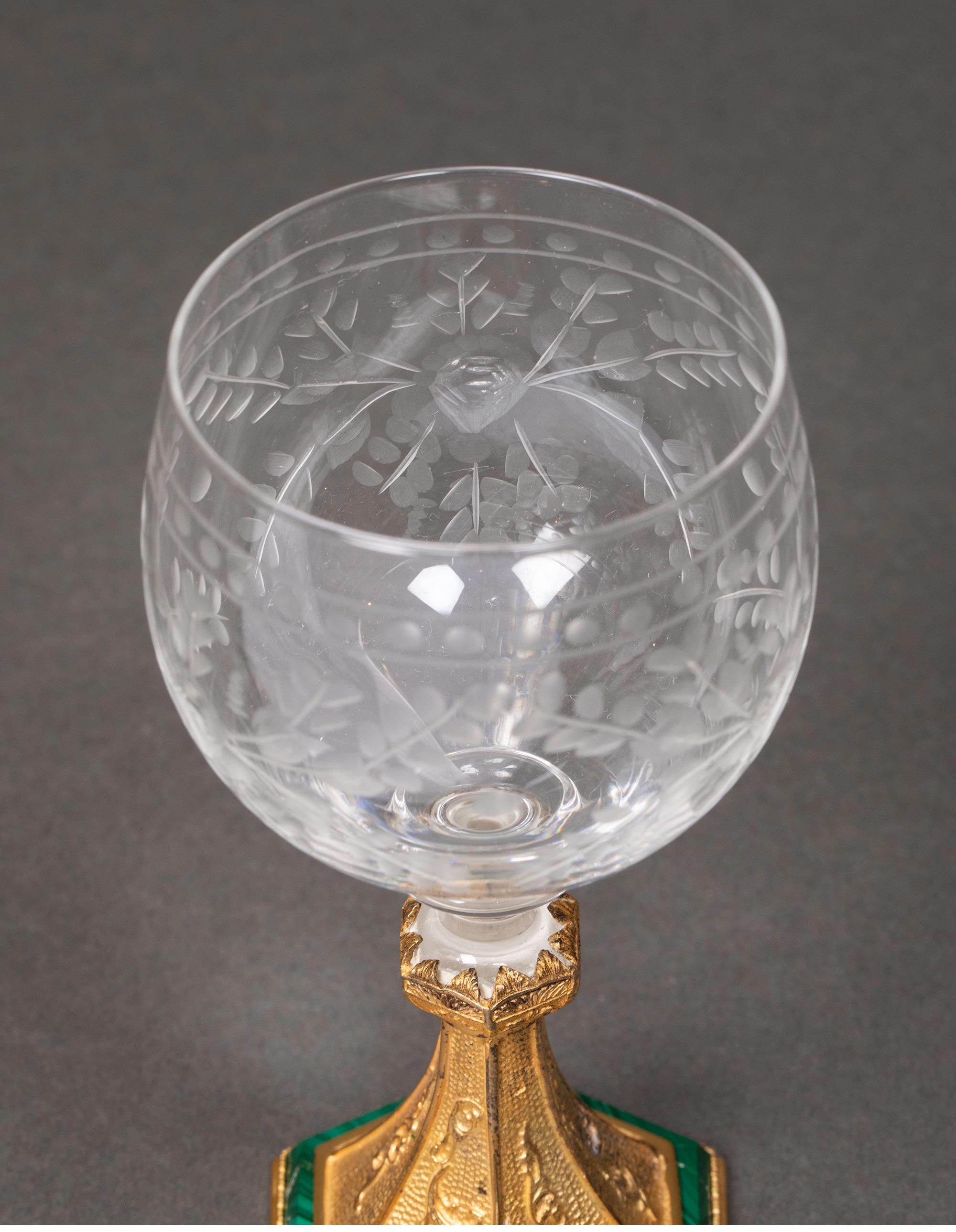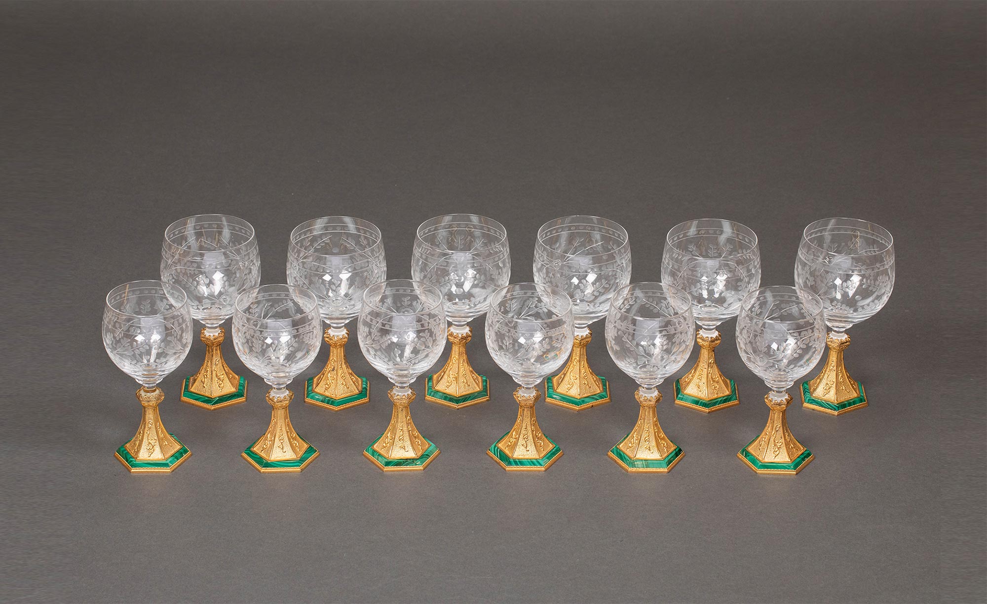 20世纪法国出品新艺术风格银鎏金镶嵌孔雀石底座蚀刻水晶酒杯 12件