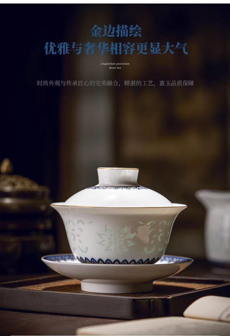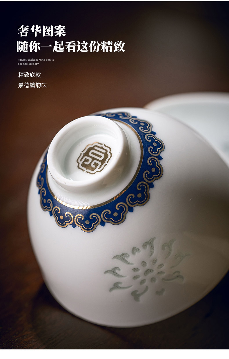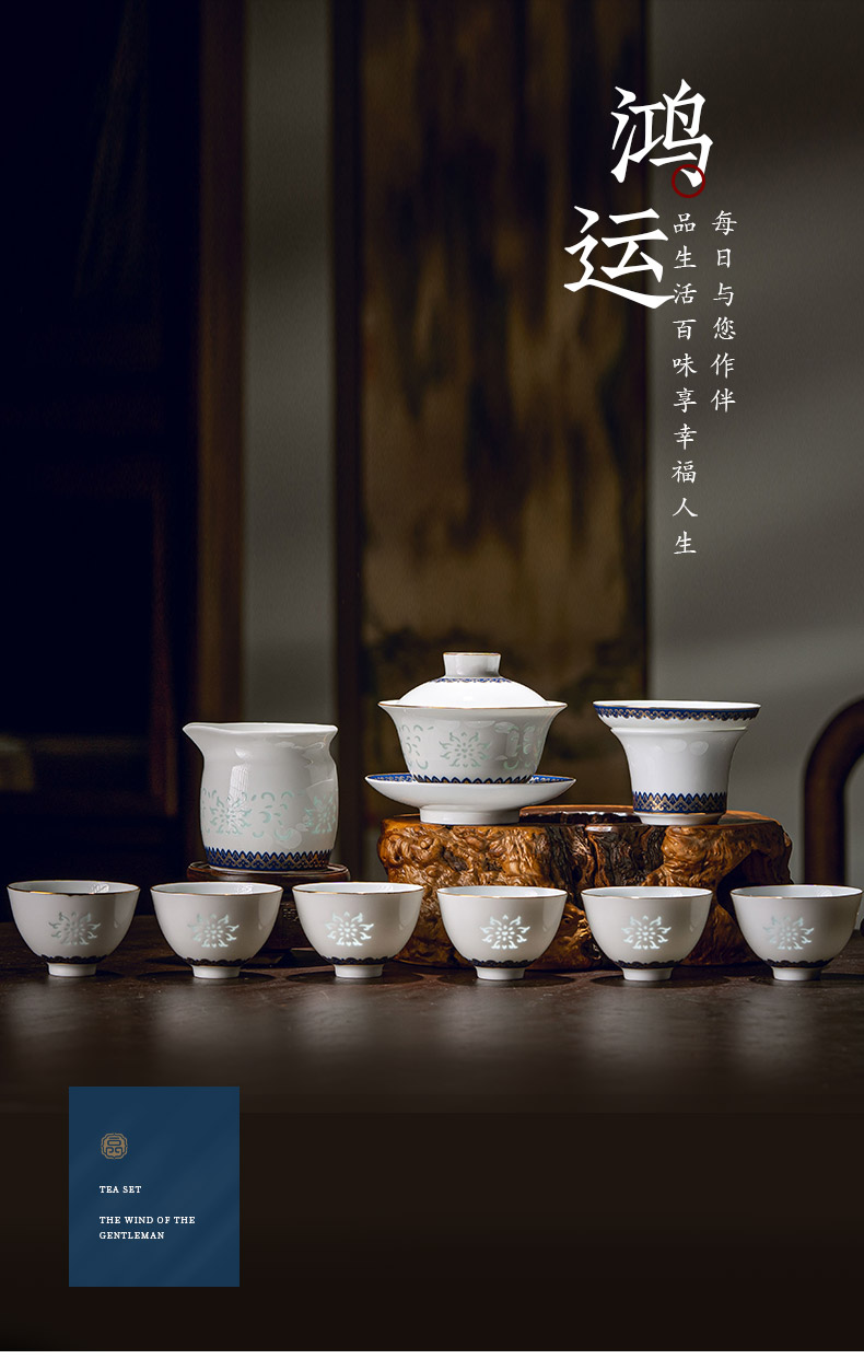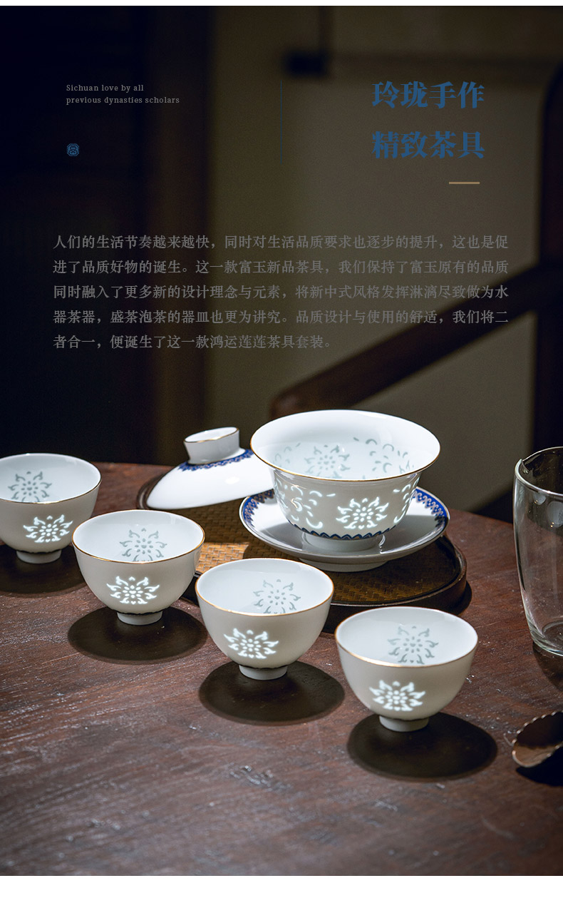 富玉 景德镇玲珑瓷组合功夫茶具鸿运连连盖碗茶具