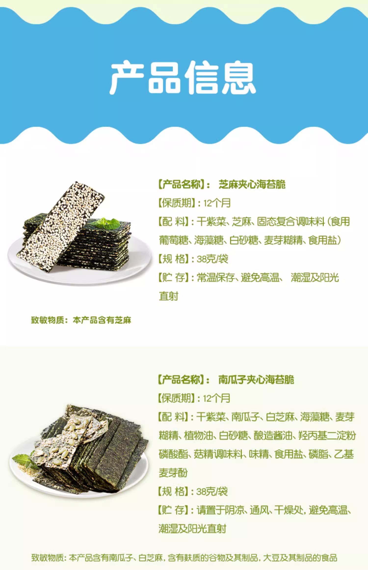 【品牌直发】孕味食足芝麻海苔孕妈芝麻夹心海苔脆芝麻海苔脆大片紫菜 38g/袋
