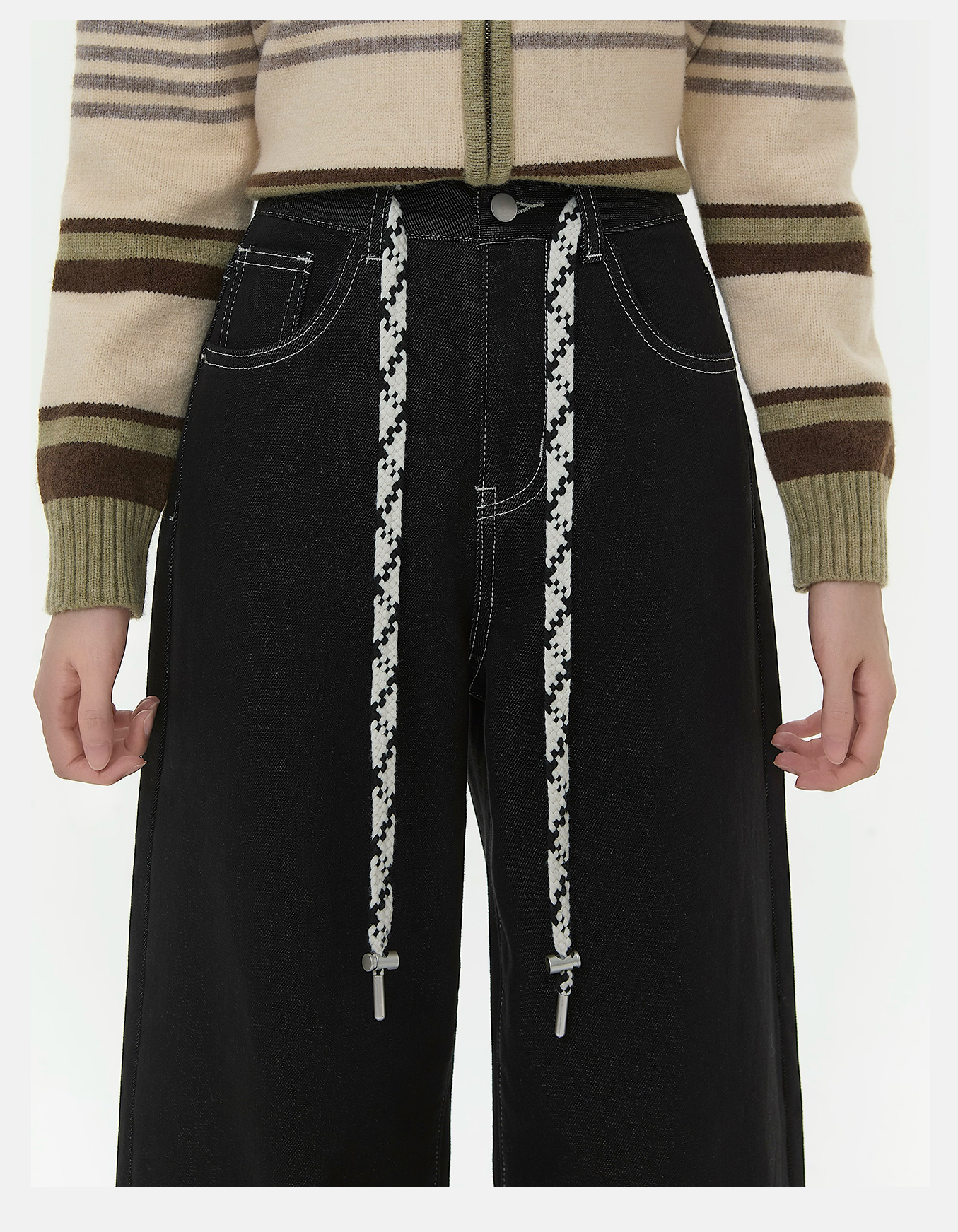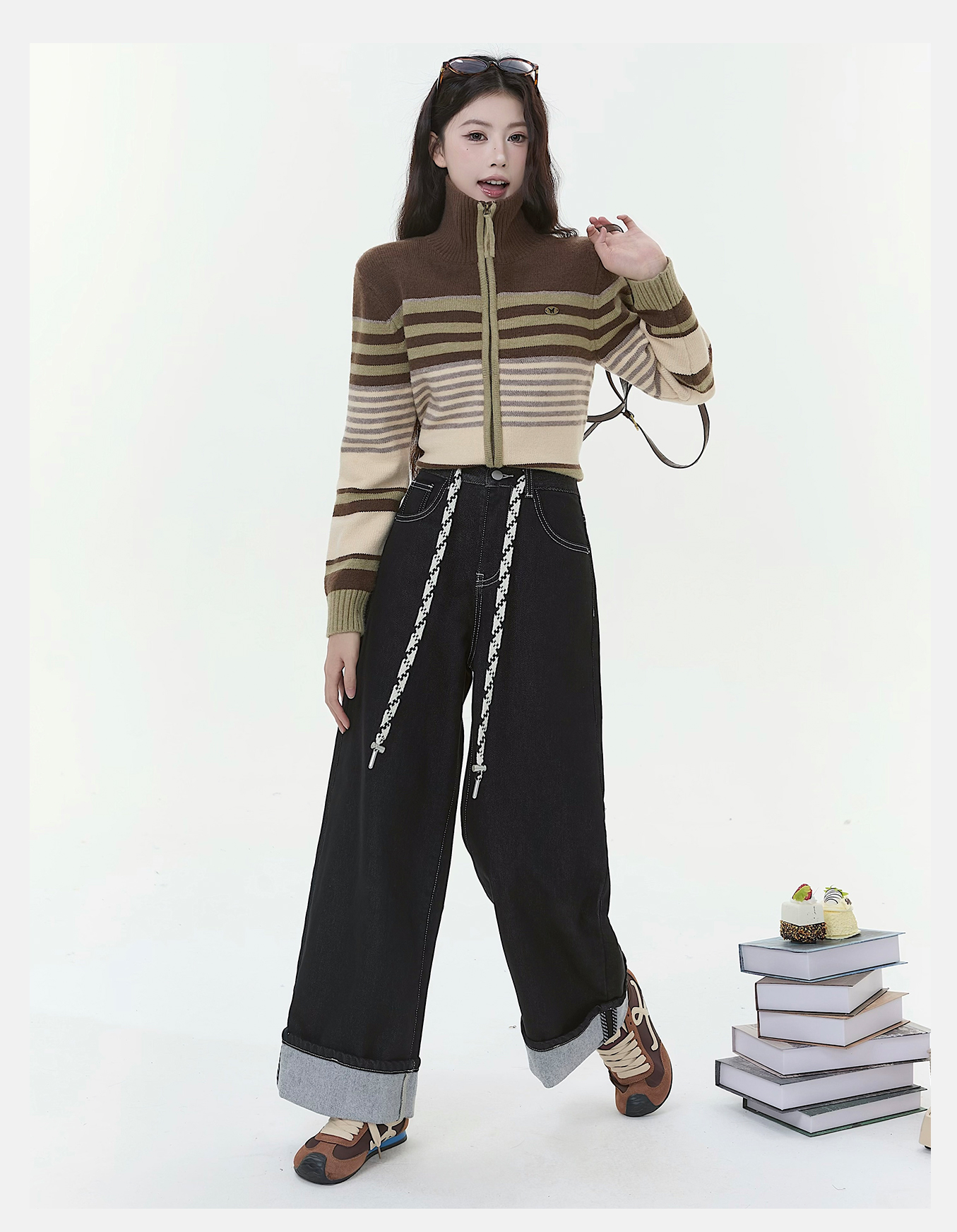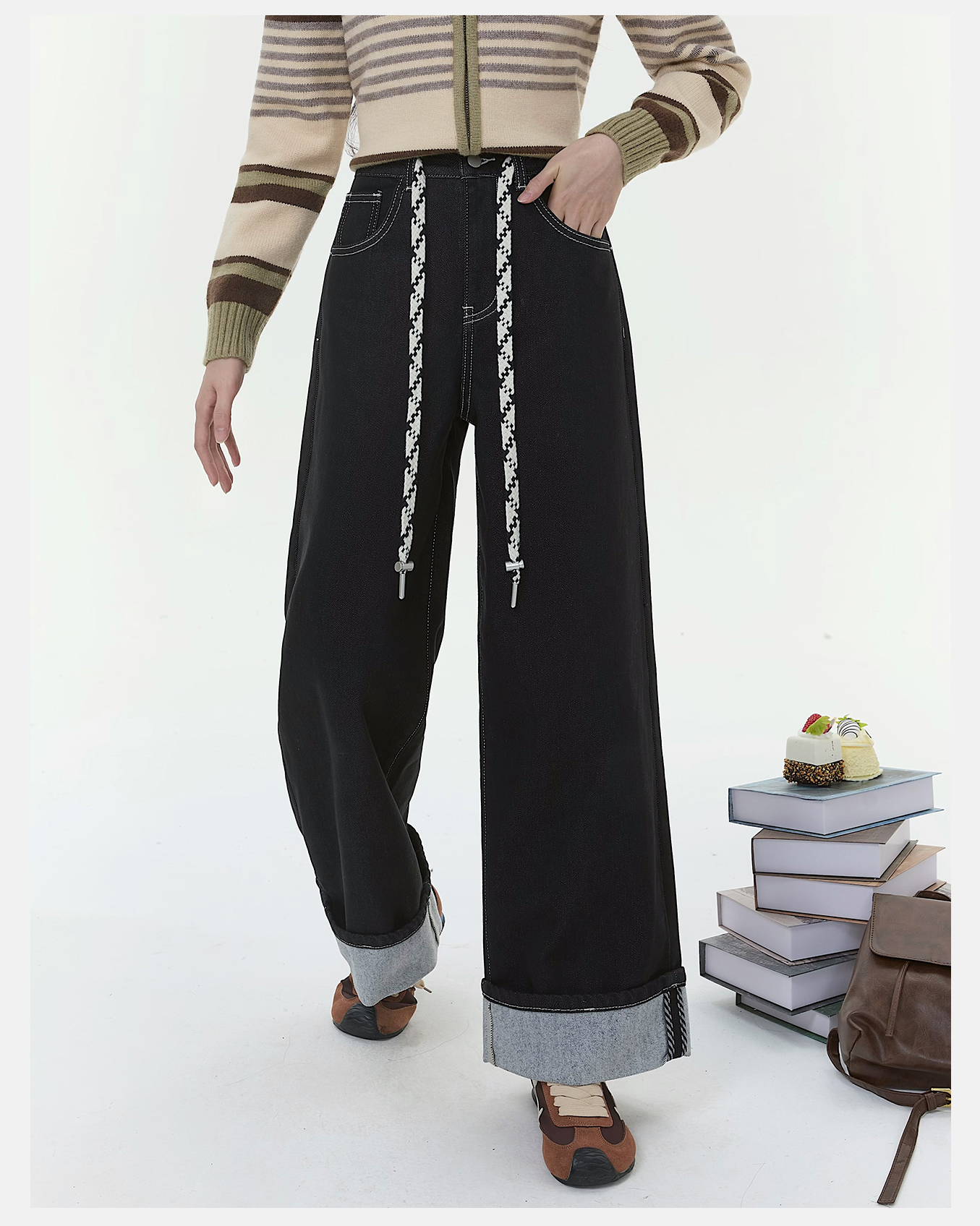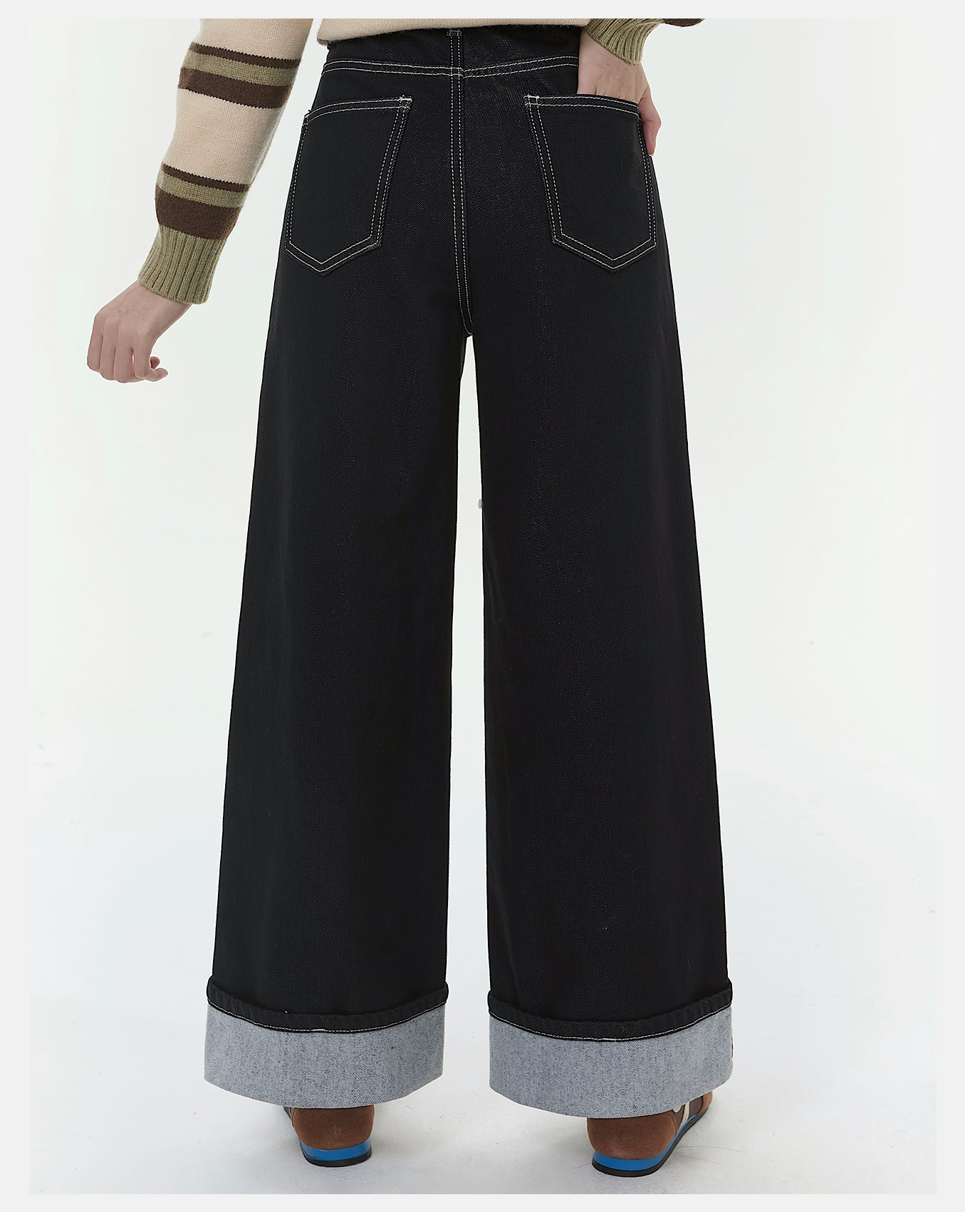 P&X设计师女装2025冬季阔腿加绒翻边复古牛仔长裤 825410159 藏青
