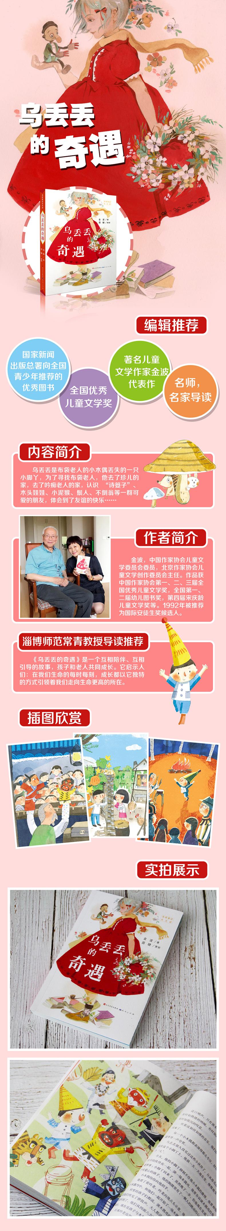 金波著的《乌丢丢的奇遇》讲述的是乌丢丢是布袋老人的小木偶丢失的一只小脚丫,为了寻找布袋老人,他去了珍儿的家,得到了一个身体,接着他闯进了吟痴老人的家中,在这里,他认识了一群可爱的朋友――“诗篓子”、木头娃娃、小泥猴、鬃人、不倒翁……在他们为吟老举行的“重返童年”的晚会中,乌丢丢才真正体会到了快乐。于是,他开始了寻找布袋爷爷和珍儿的旅程……