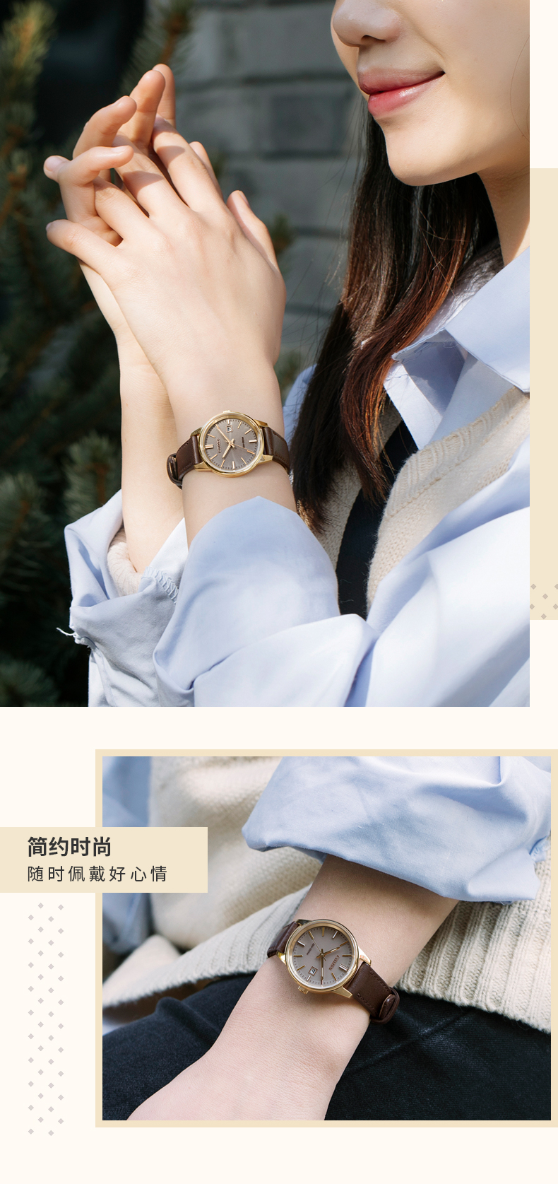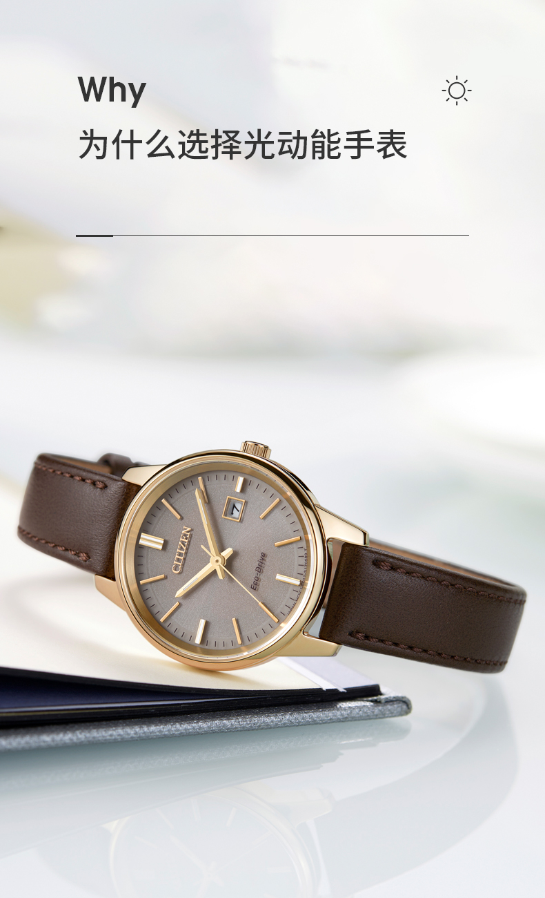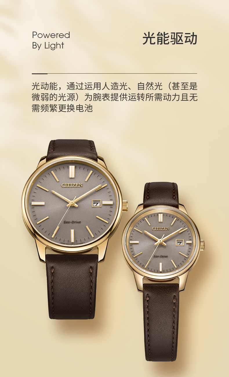 西铁城日本官方正品时尚简约卡其色表盘皮带光动能情侣对表(女表) EW2593-10X