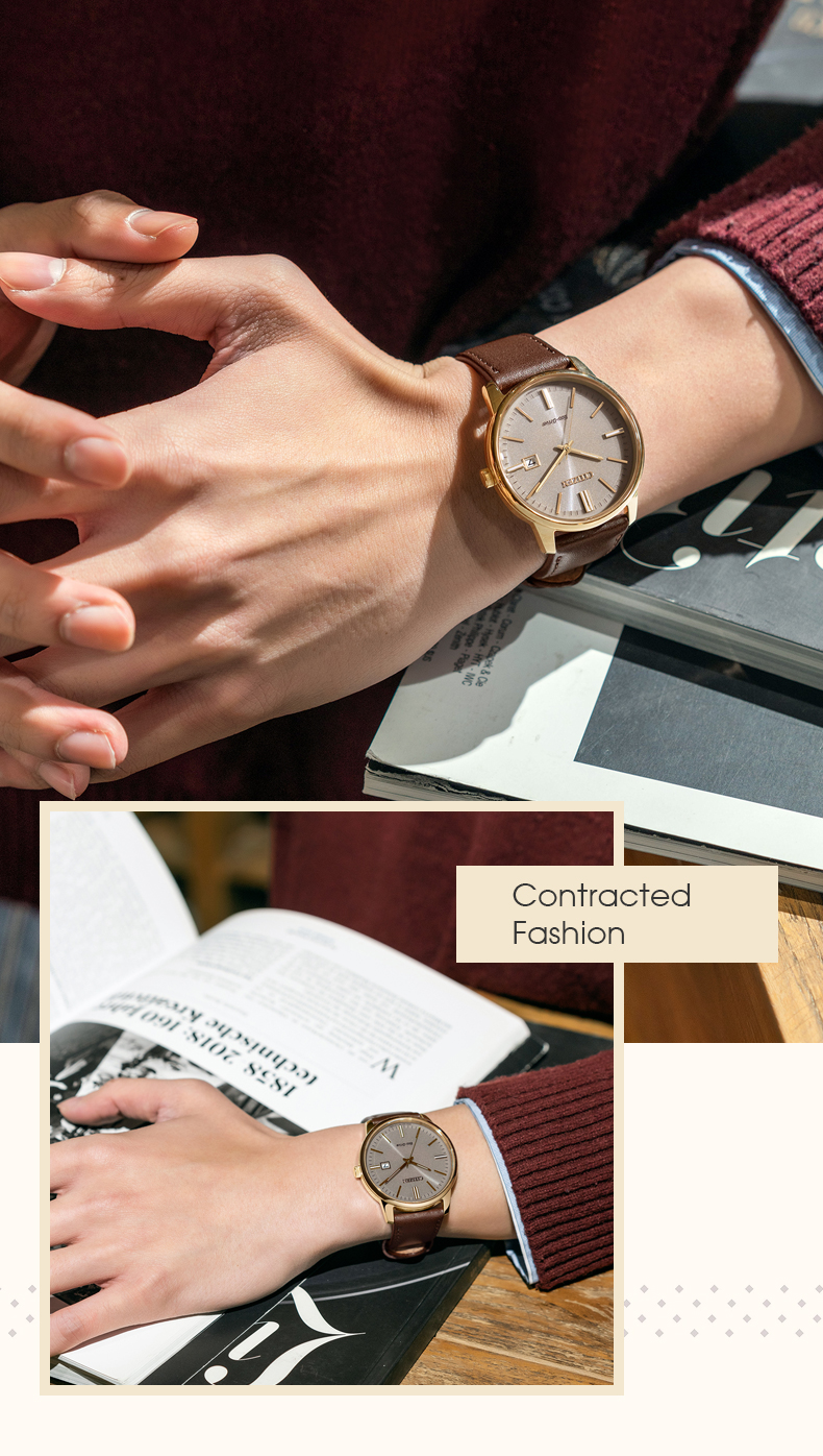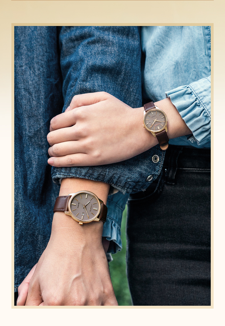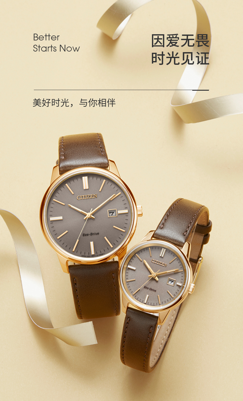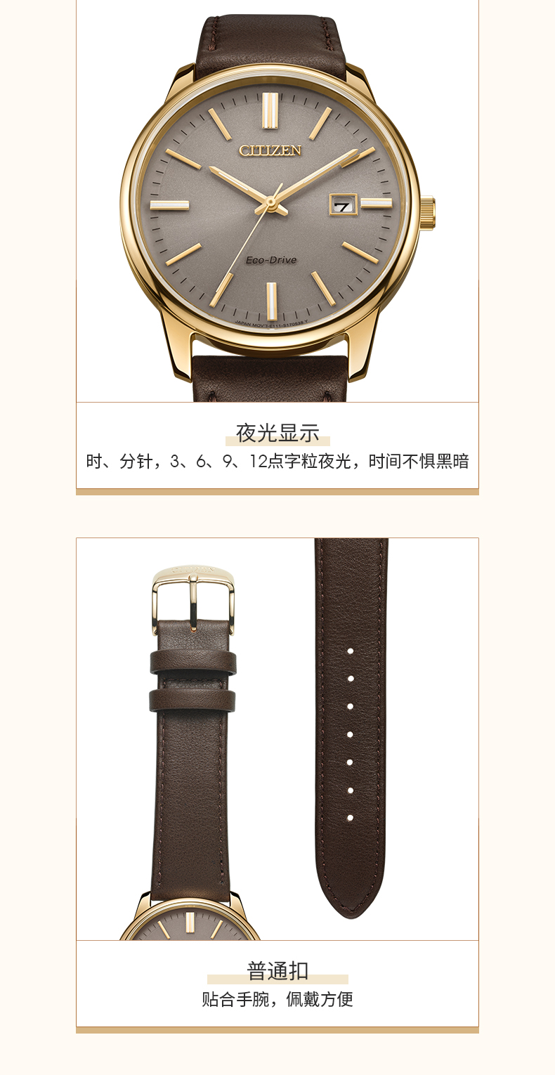 西铁城日本官方正品时尚简约卡其色表盘皮带光动能情侣对表(女表) EW2593-10X