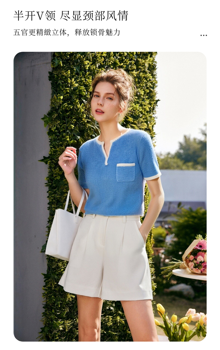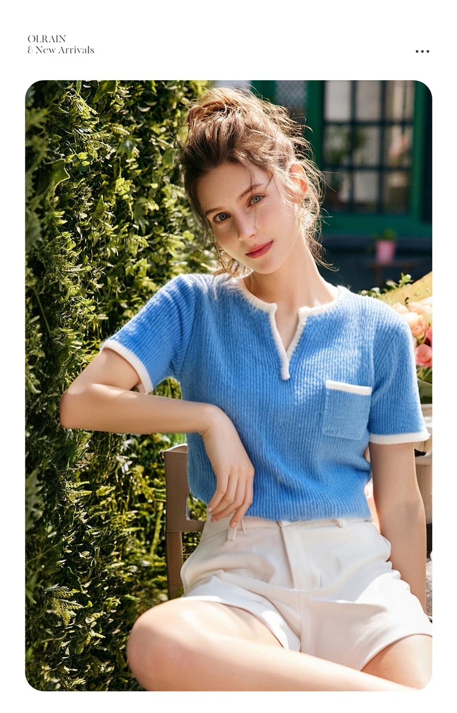 OLrain欧芮儿2025夏季新款蓝色拼色通勤风毛针织半开式V领套头衫