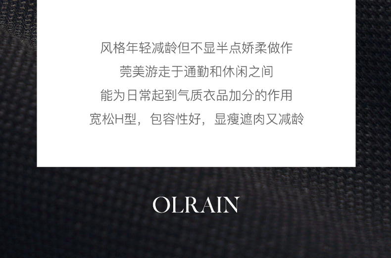 - “精致”是欧芮儿olrain品牌文化的核心,欧芮儿认为,精致的女人,不但要外在动人,更要内在迷人,内外兼修,有魅力、有气质、有内涵,自信而不自傲,优雅而不矫揉,自有万种风情而不轻浮,更不故作矜持。