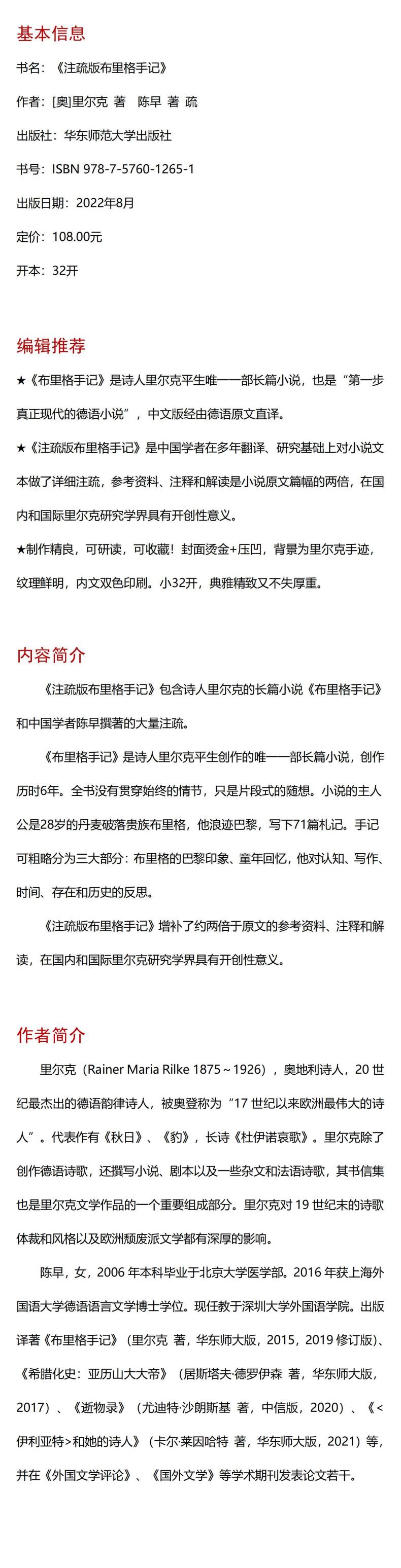 ★《布里格手记》是诗人里尔克平生专享一部长篇小说,也是“第一步真正现代的德语小说”,中文版经由德语原文直译。★《注疏版布里格手记》是中国学者在多年翻译、研究基础上对小说文本做了详细注疏,参考资料、注释和解读是小说原文篇幅的两倍,在国内和国际里尔克研究学界具有开创性意义。★制作精良,可研读,可收藏!封面烫金+压凹,背景为里尔克手迹,纹理鲜明,内文双色印刷。小32开,典雅精致又不失厚重。