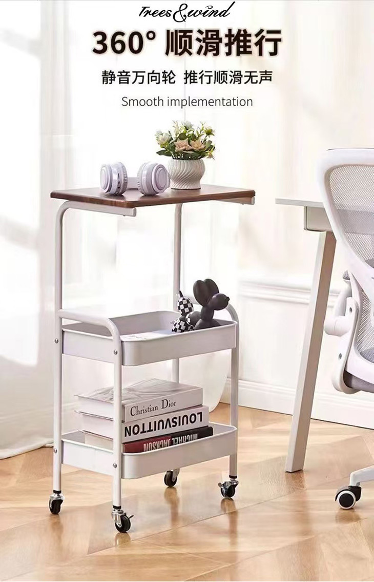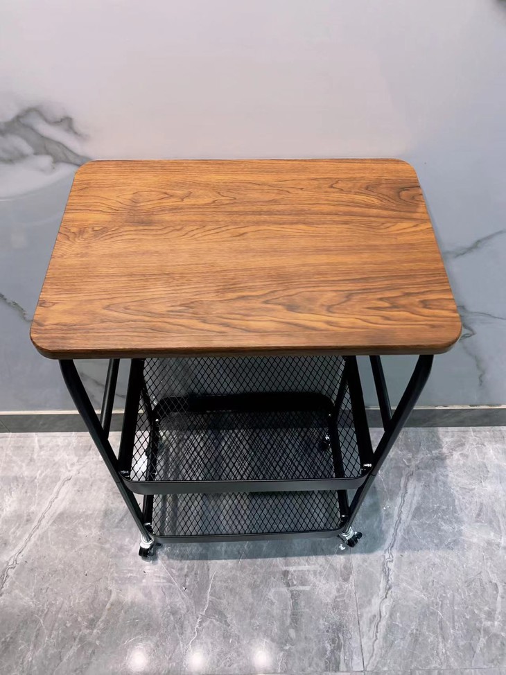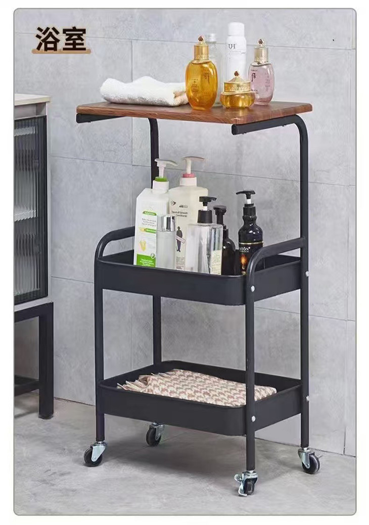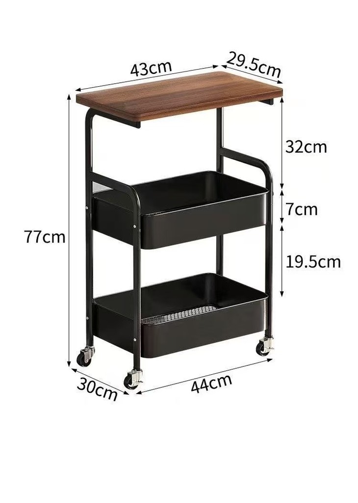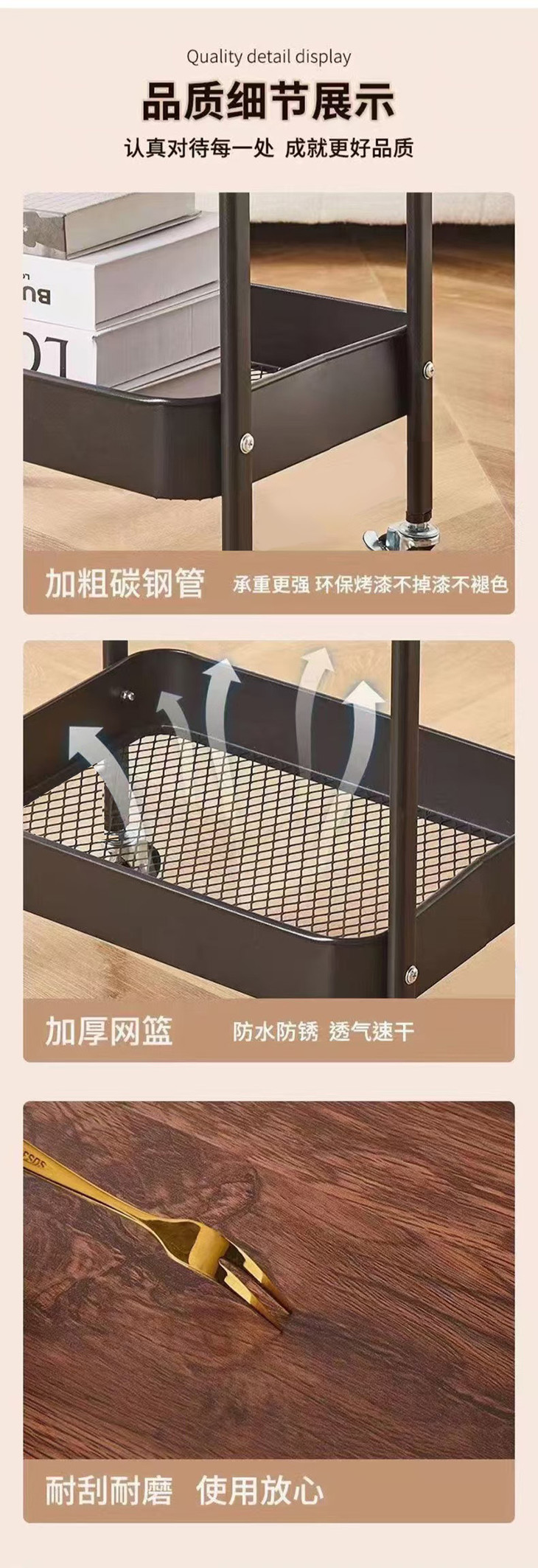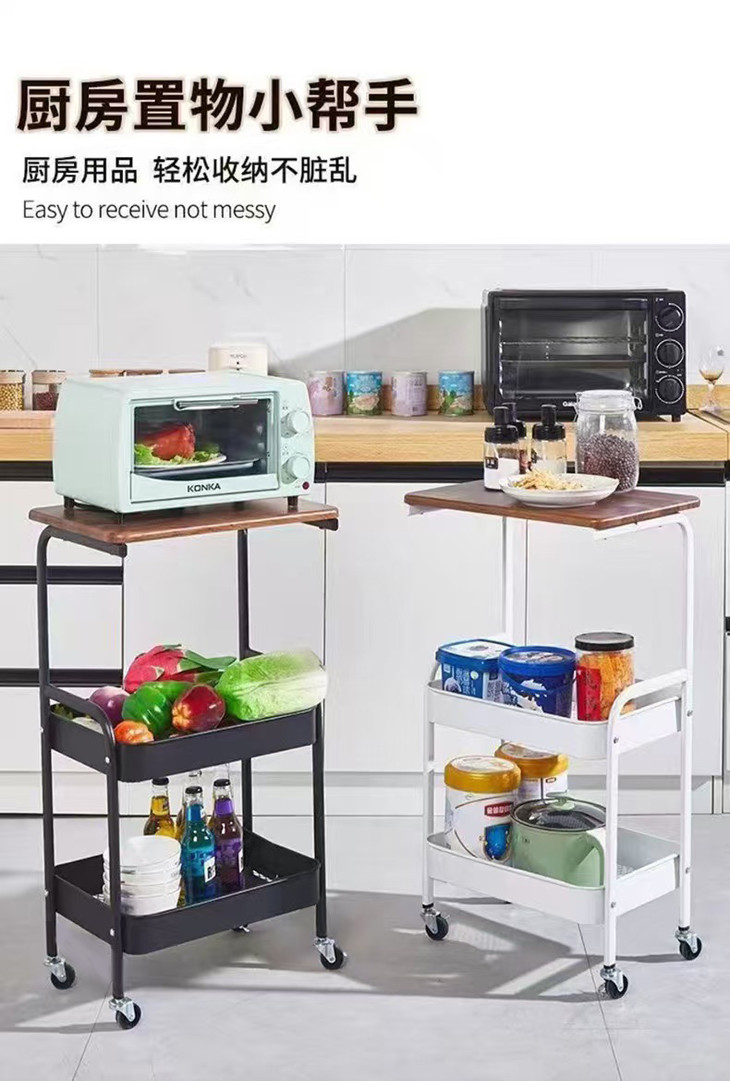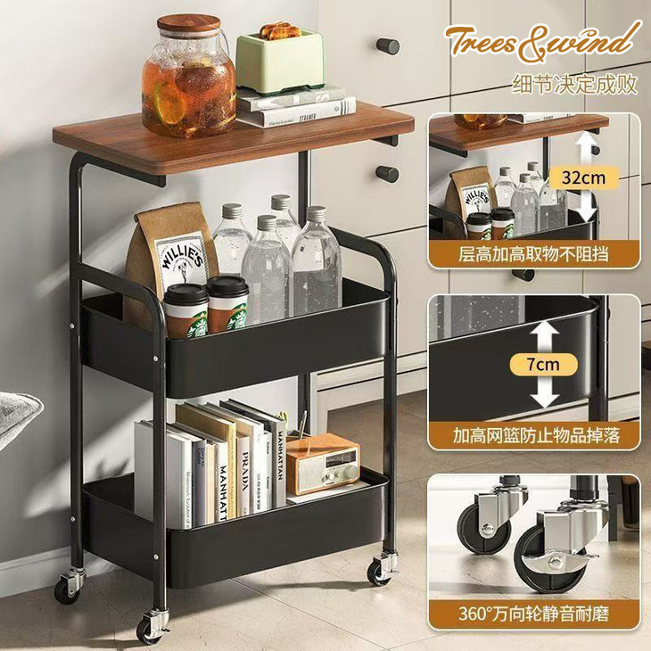 wind这款多层推车置物架 双层大容量置物筐 + 防水耐磨的胡桃木色桌面板 半空支架设计✔ 🔹万向滚轮 | 🔹沥水网篮 🔹碳钢材质 | 🔹顶层桌板 容量够大✔ 承重够强✔ 耐磨耐热✔ 平板好放置✔