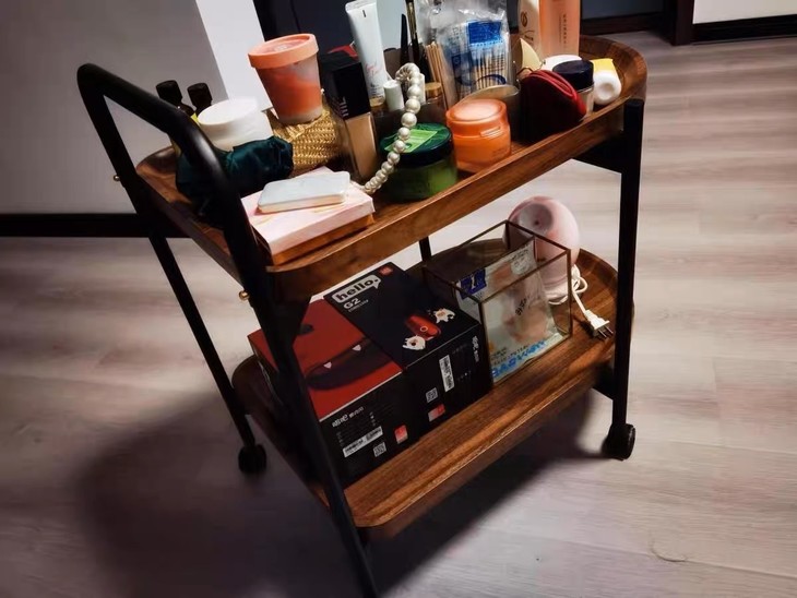 还有梳妆台补充推车 下层塞放各种囤货 面膜、护肤、彩妆 顶层桌板搭配分隔收纳盒码放口红眼影盘