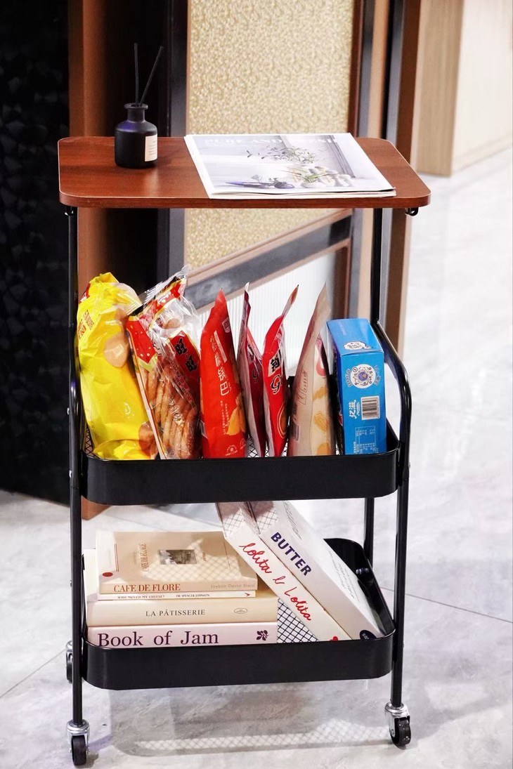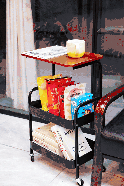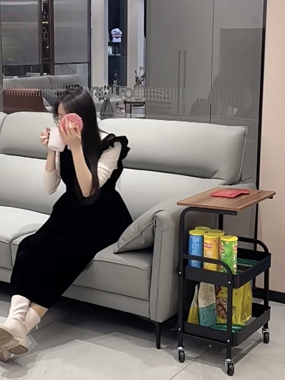 拿它当客厅零食补给舱的时候 从沙发边上摸到这个推车 开瓶饮料放在桌板上 再打开一包薯片 边刷剧 边窝在沙发里 手臂一伸零食到手 往下一伸再来一包 👍