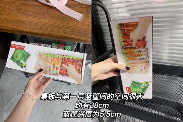 🔹上一层零食杂物随意丢,触手可及 无论是用作边几还是梳妆台旁收纳 桌板拓展+第一层篮筐放随手物品 “半空支架”设计的间隔很合理 空间够大✔ 真的会比一个纯边几方便不少