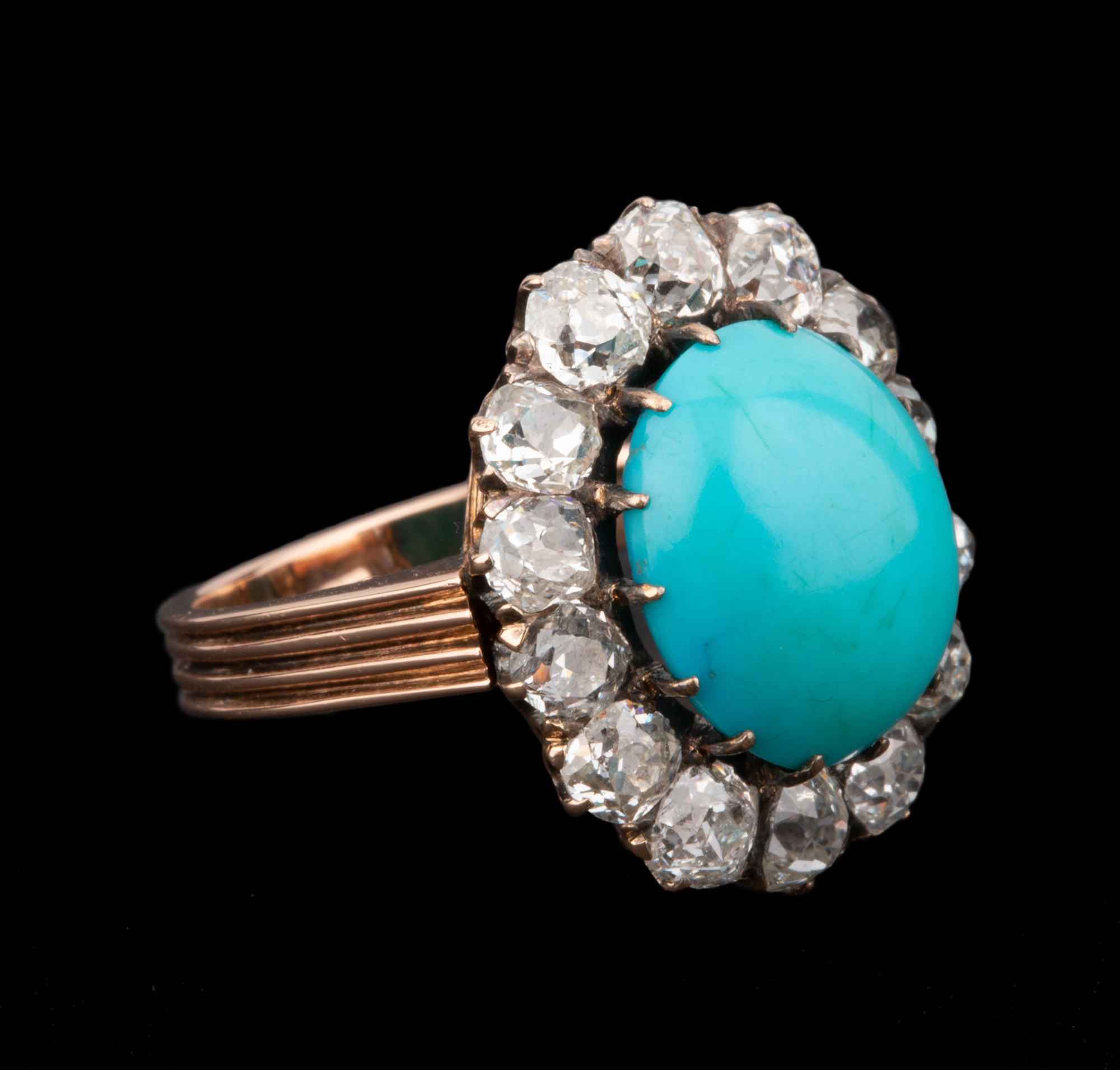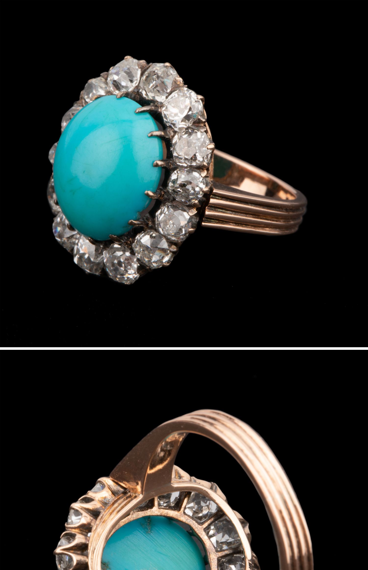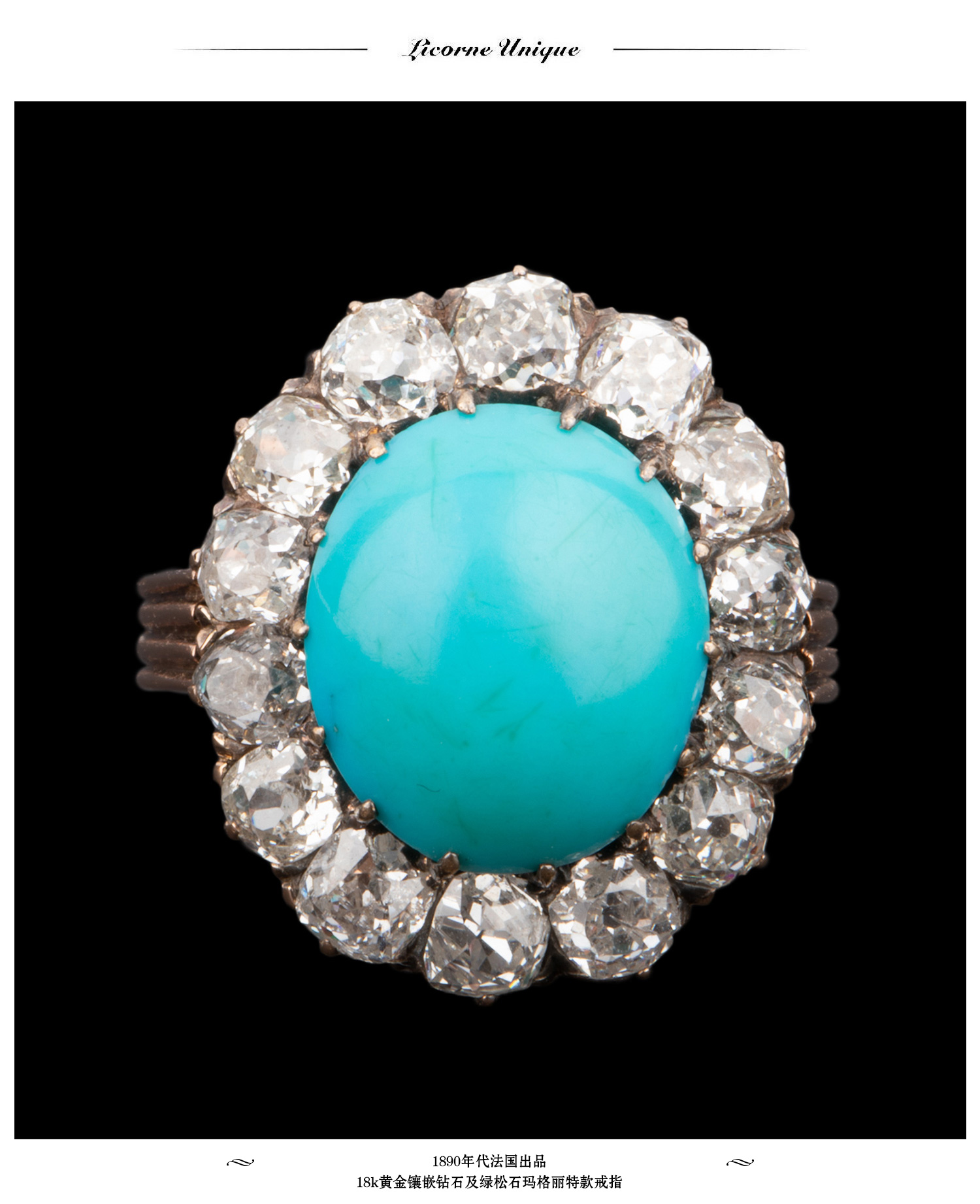 独角鹿西洋古董首饰法国18K黄金镶嵌钻石及绿松石玛格丽特款戒指