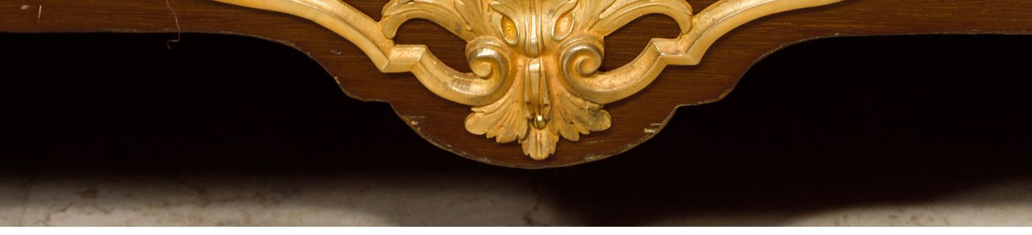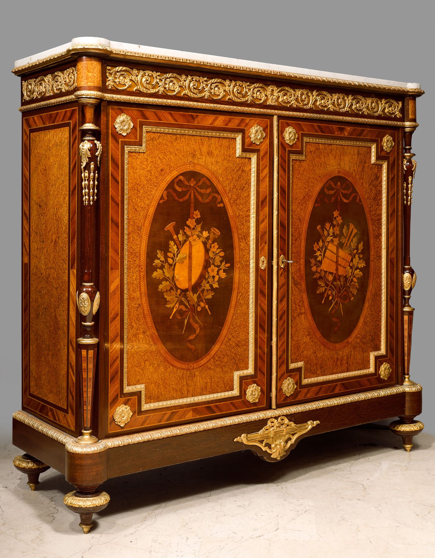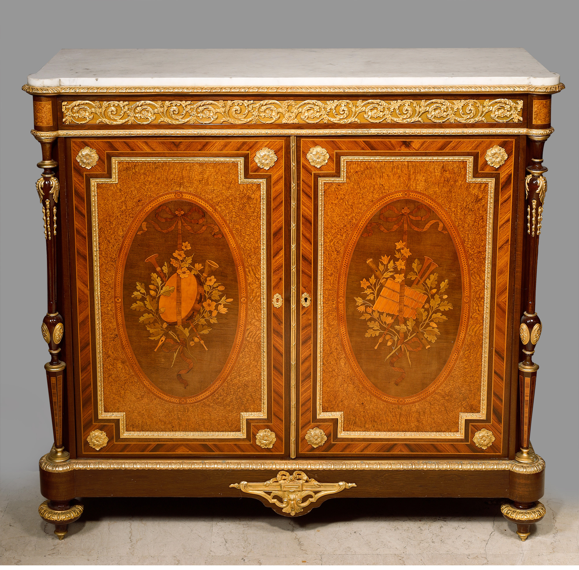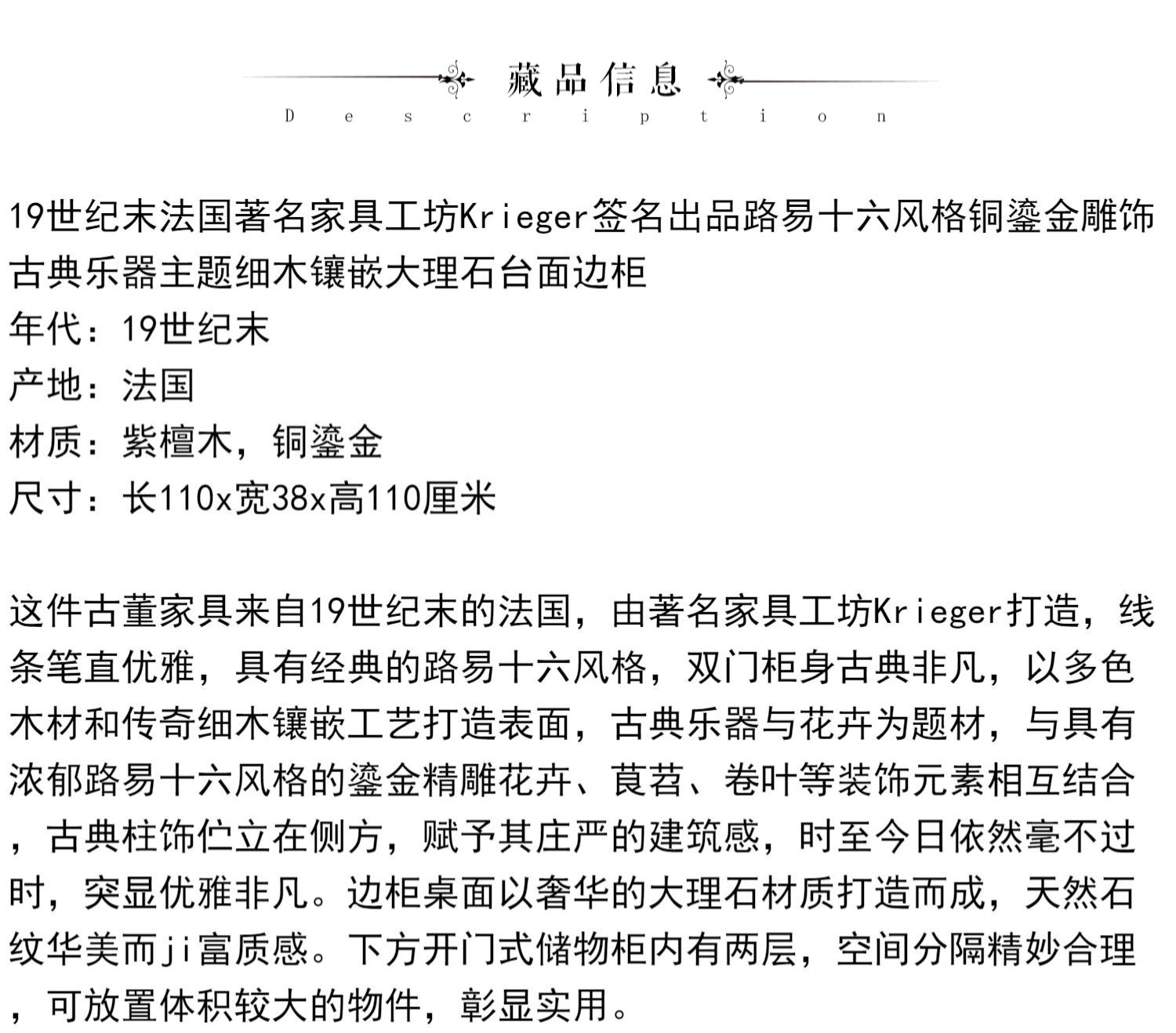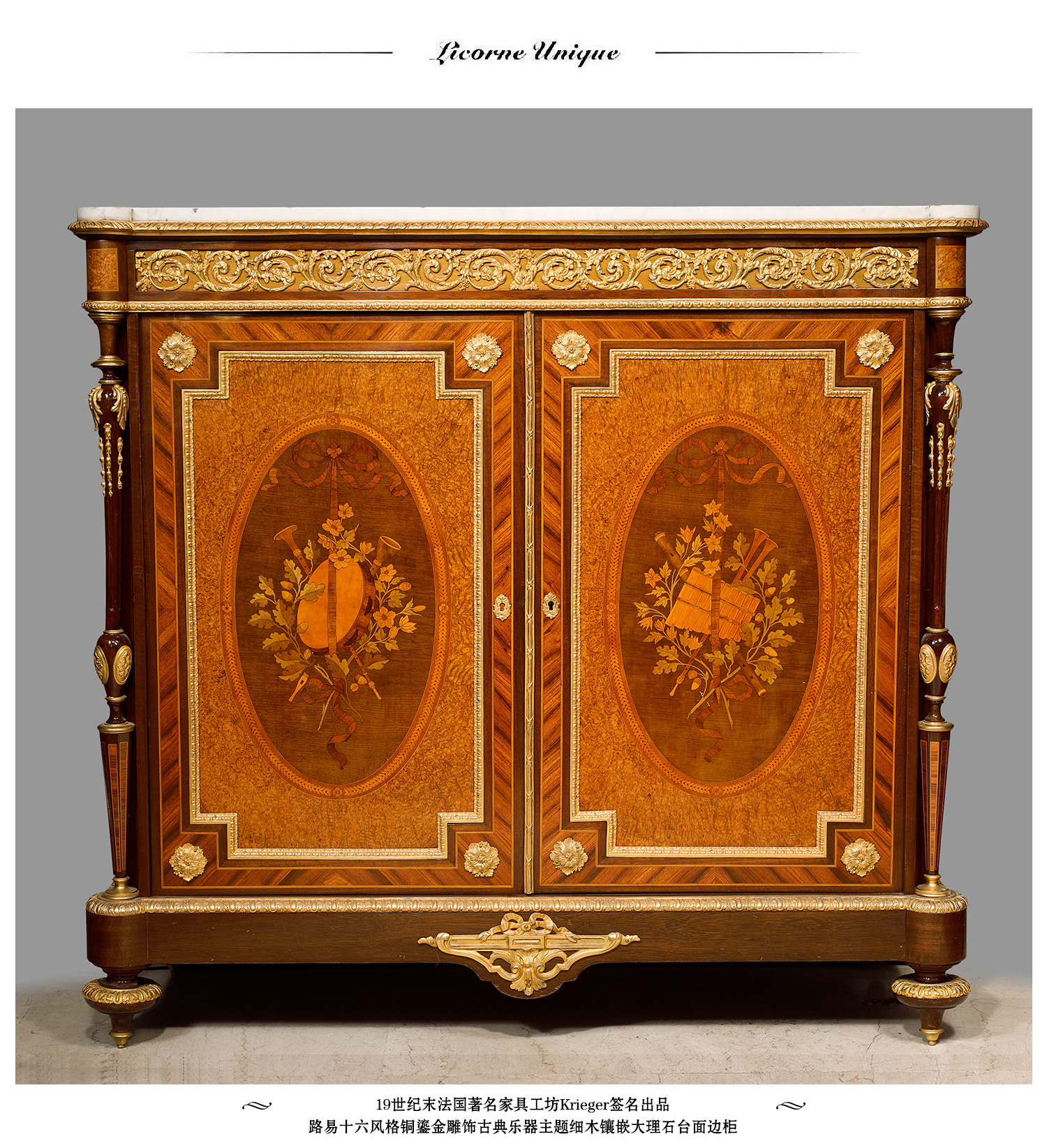 独角鹿西洋古董家具路易十六风格铜鎏金细木镶嵌大理石台面边柜