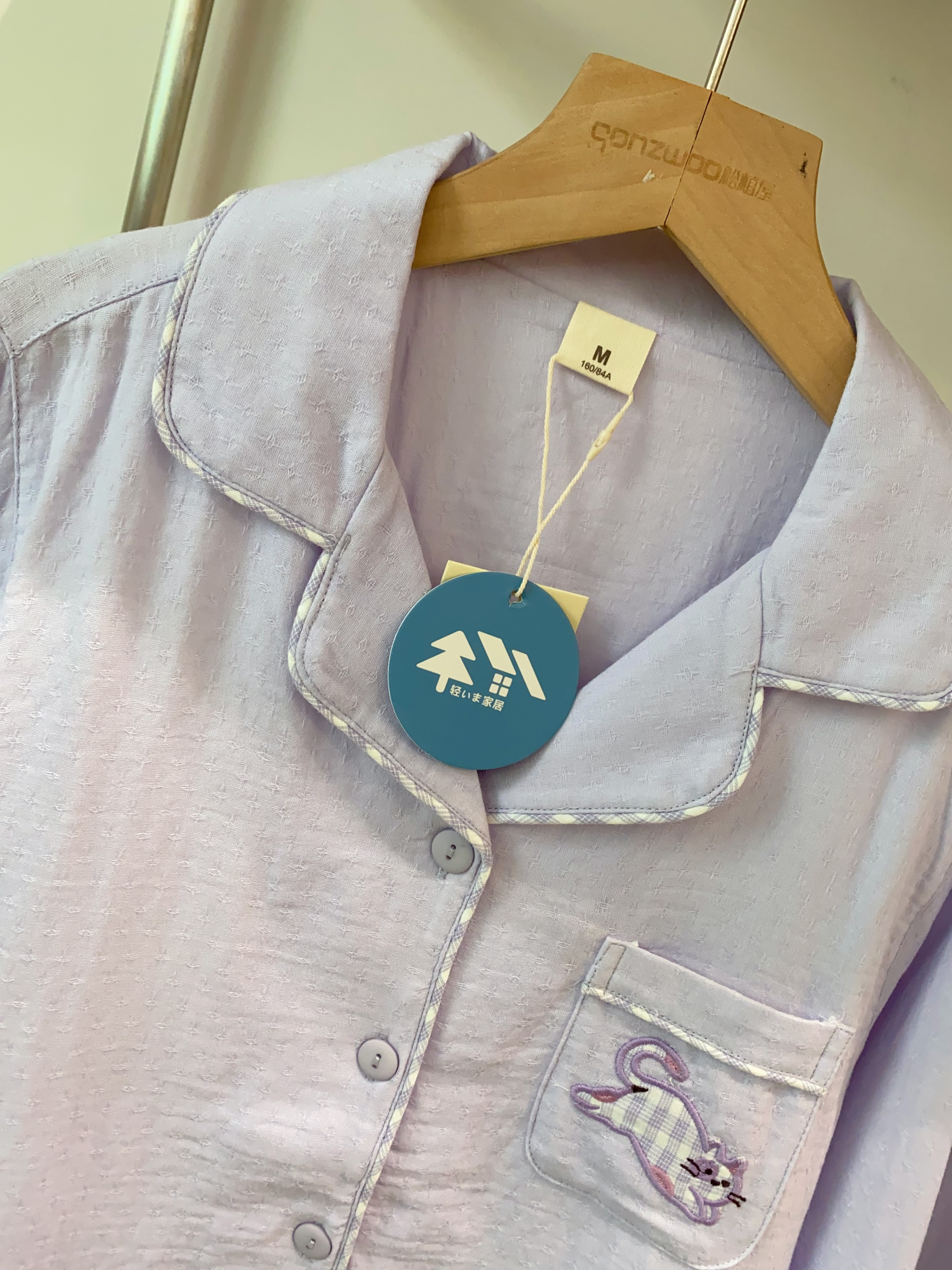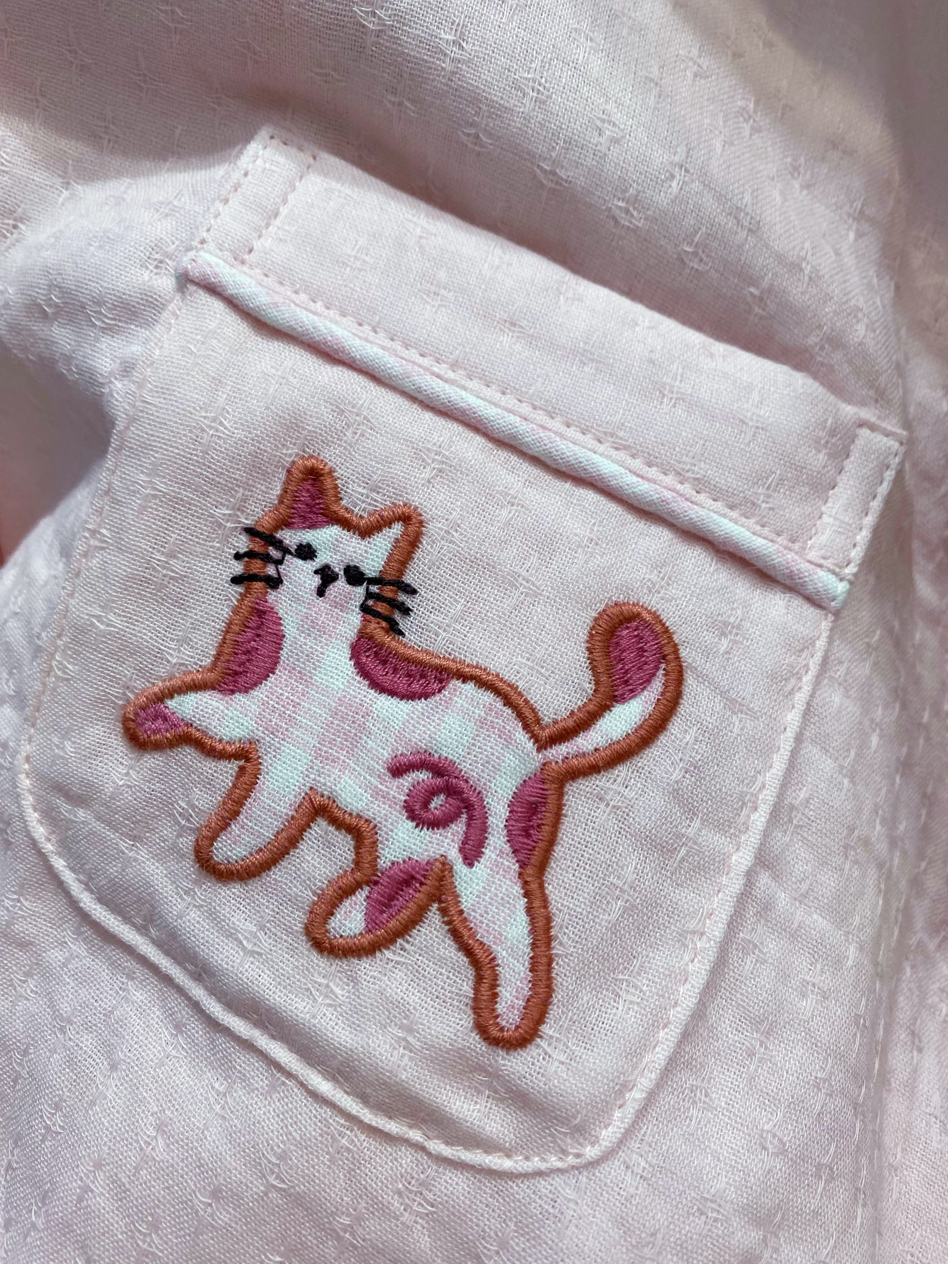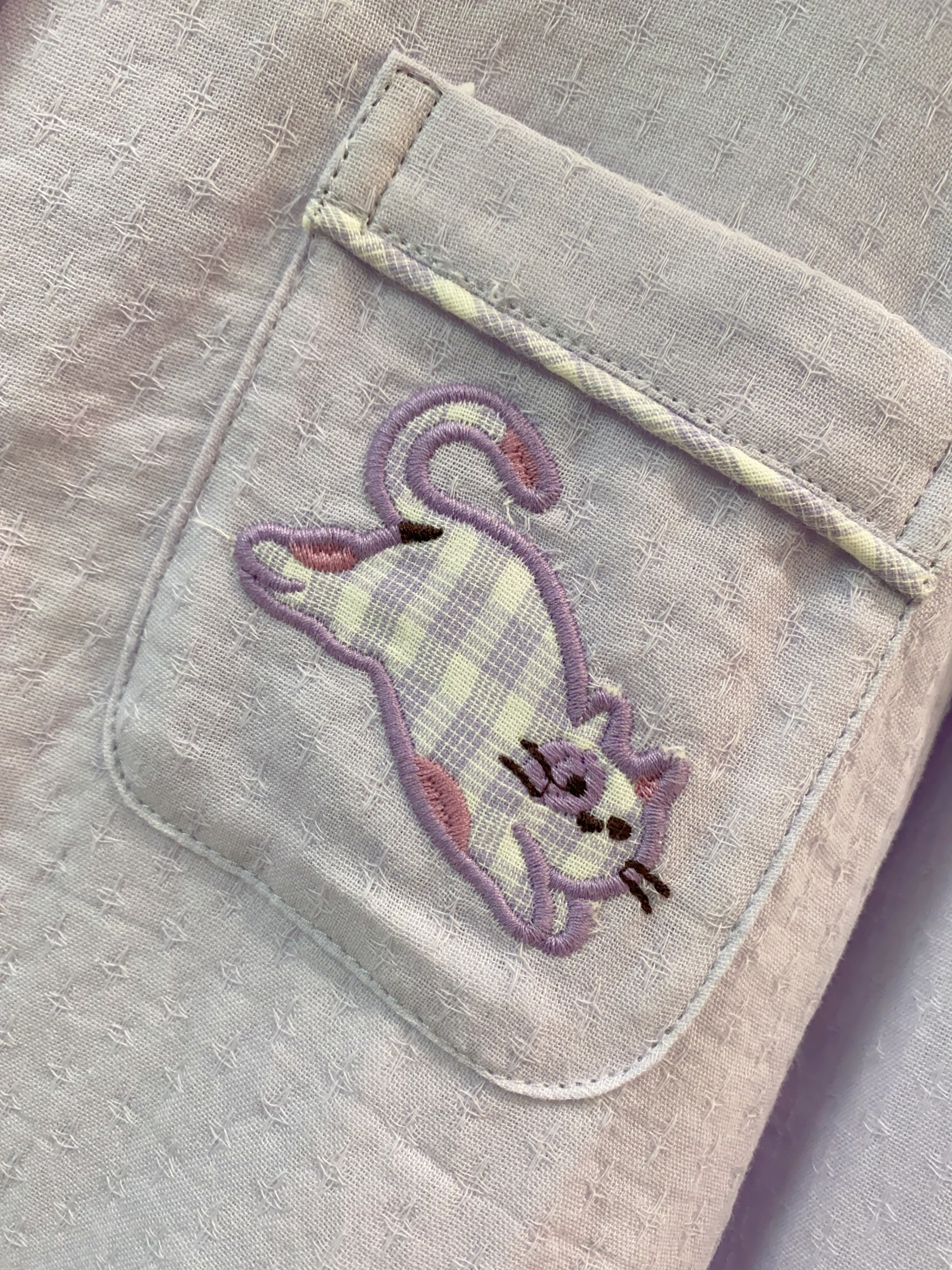100%全棉双层纱面料,透气亲肤,口袋上的格纹小猫刺绣,宅家也要做精致小仙女
