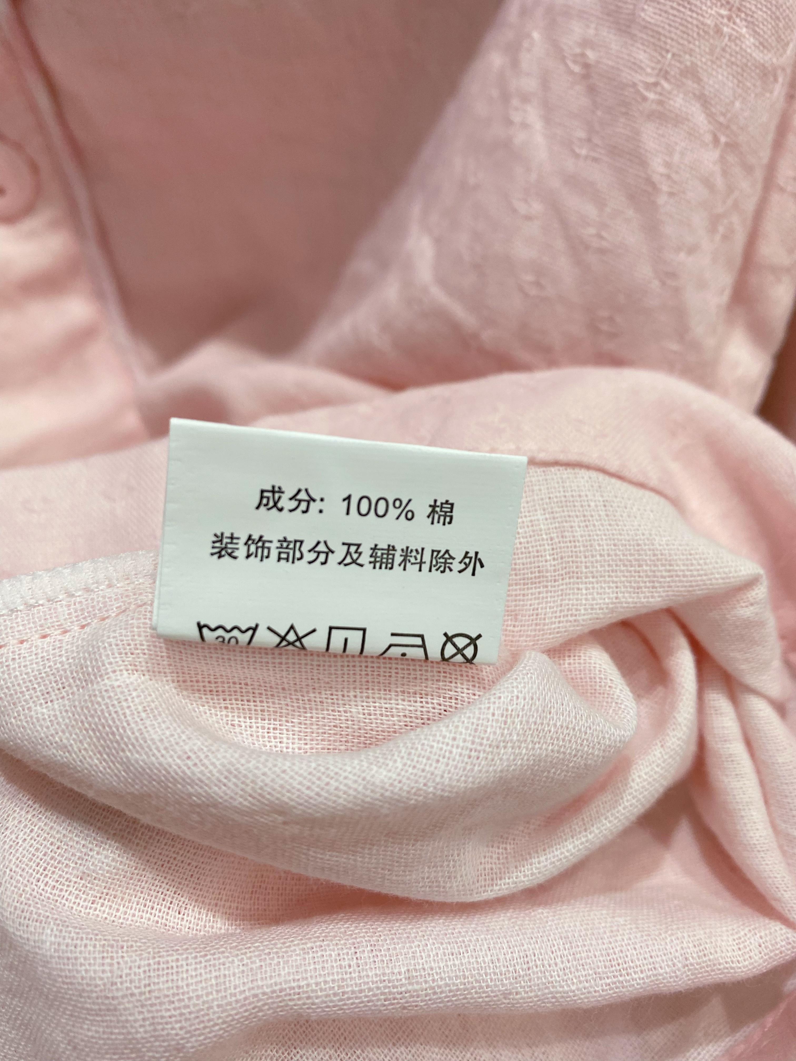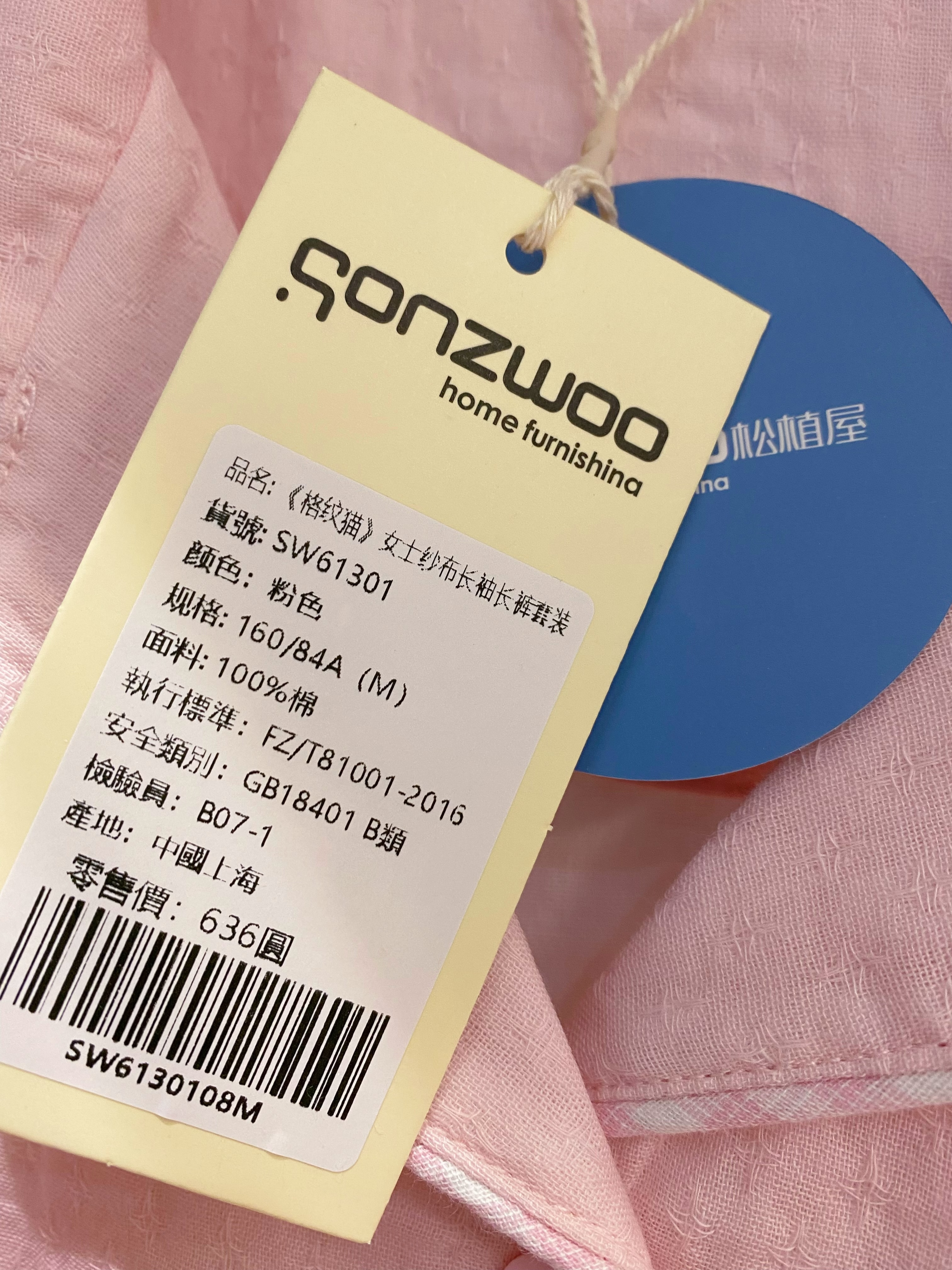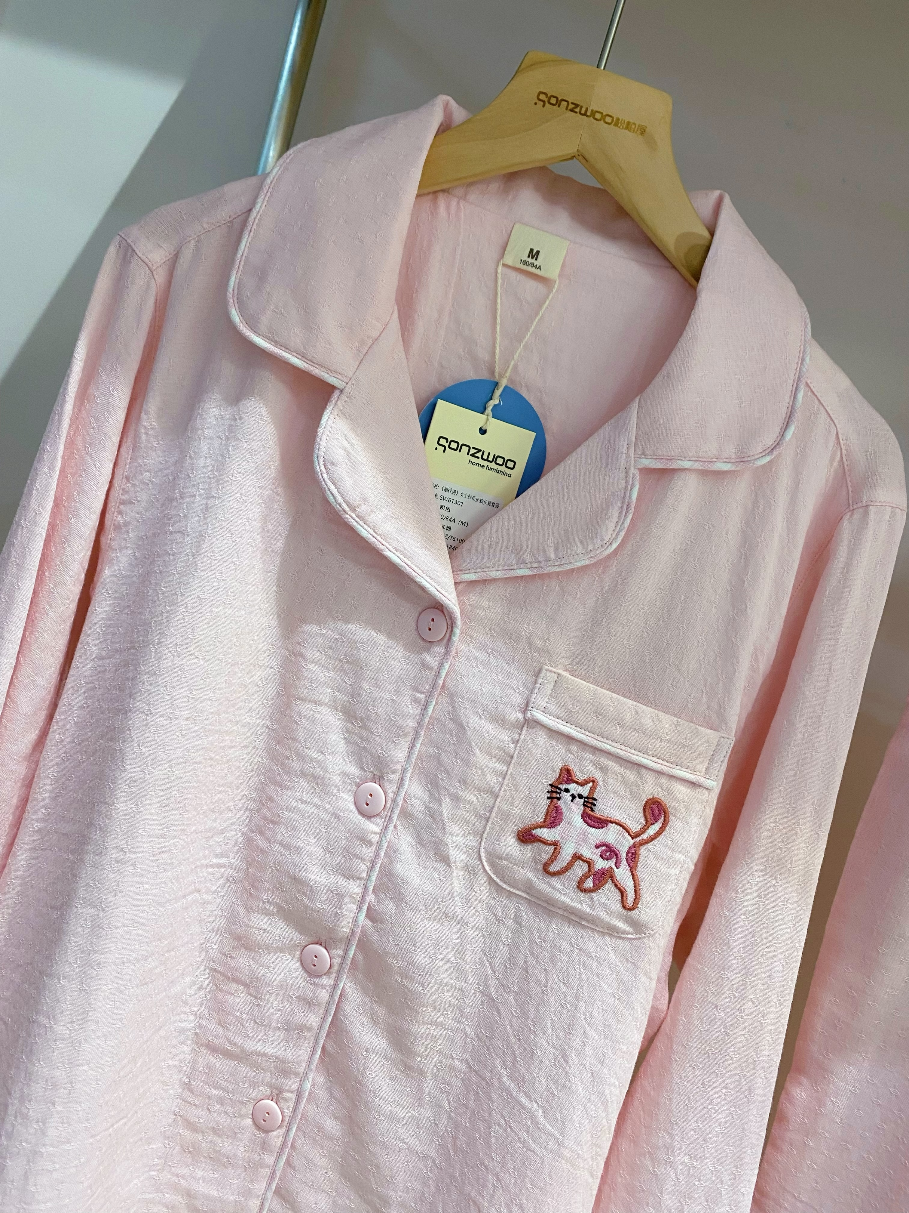 100%全棉双层纱面料,透气亲肤,口袋上的格纹小猫刺绣,宅家也要做精致小仙女