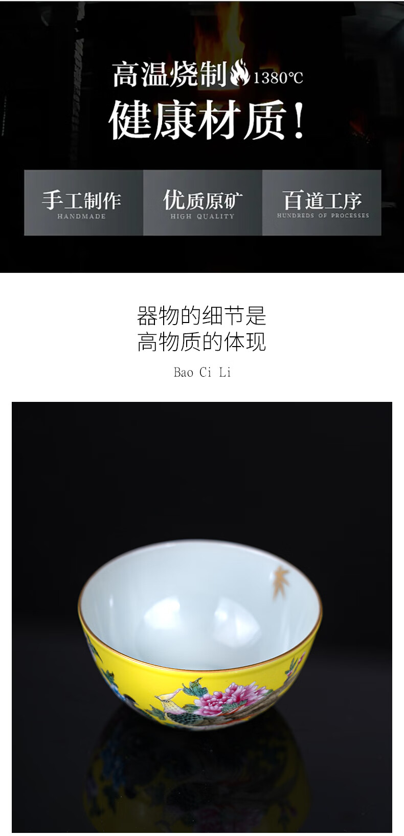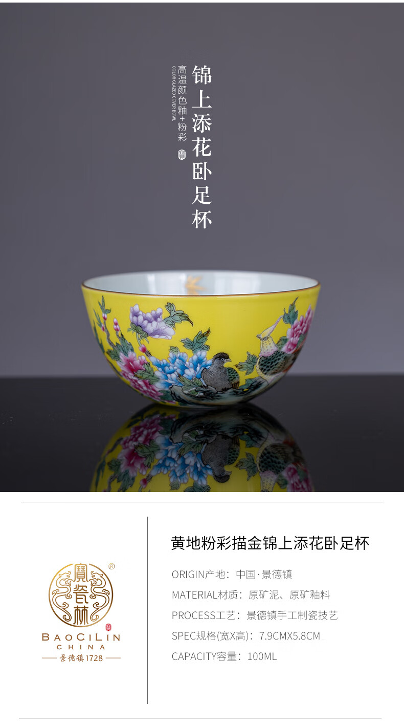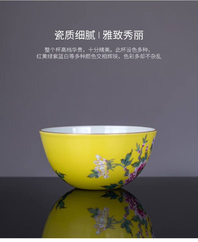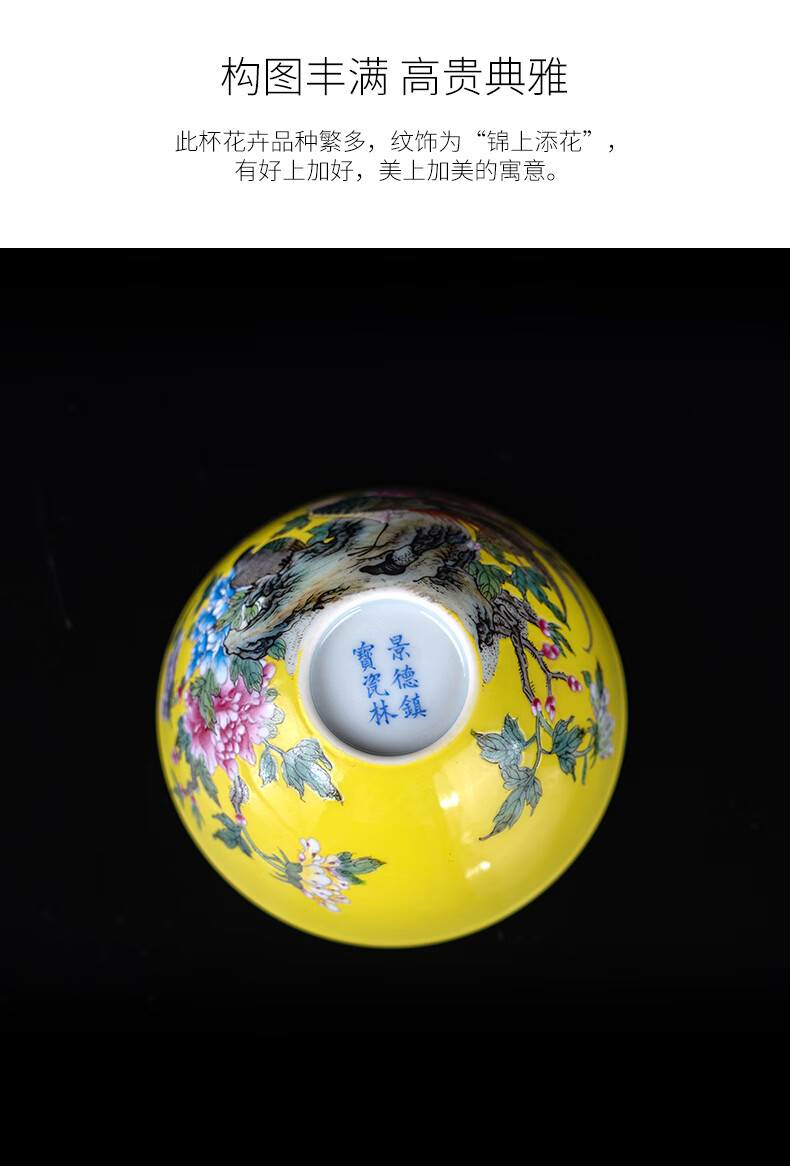 【宝瓷林】黄地粉彩描金锦上添花卧足杯品茗杯