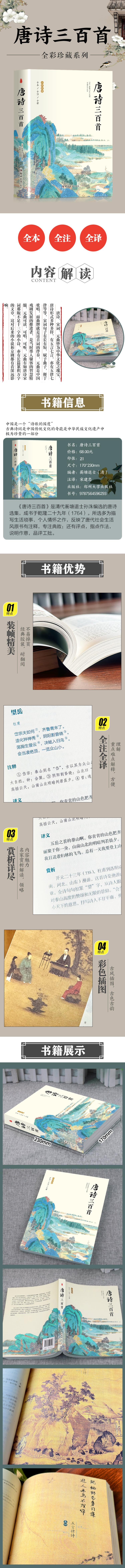 清代诗学名家蘅塘退士,为启蒙孩童掌握唐诗精髓,搜集通读唐诗,呕心推敲增删,在夫人徐兰英的协助下,精选李白、杜甫、王维、白居易、李商隐、孟浩然等77位文学大师的310首经典代表诗作,于乾隆二十九年(1764)编定这部《唐诗三百首》(后四藤吟社本又增补杜甫《咏怀古迹》三首)。此书特点鲜明,兼顾古体诗近体诗、雅俗共赏、老少咸宜,一经问世,风行海内,读诗、写诗、喜诗、赏诗、学诗者,几乎家家收藏,持续畅销近三百年,至今已成为家喻户晓、不可逾越的唐诗选本。本版《唐诗三百首》是以蘅塘退士的经典选本为底本,甄别、遴选76位唐朝诗人的300首文辞优美、感发人心的唐诗佳作。书中每首唐诗都包含原文、注释、译文和赏析四大部分,全面详尽,通俗易懂。书中穿插大量传世名画,带你走进中国古典之美的殿堂,诵读经典的同时,享受一场水墨艺术盛宴,带给读者视觉与精神的双重享受。