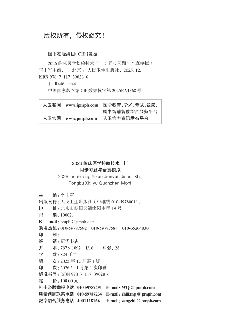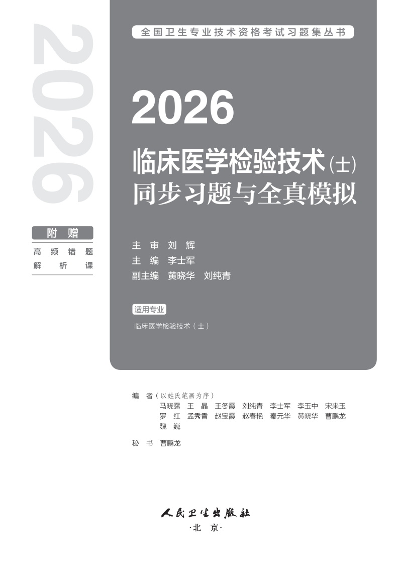 书名:2026临床医学检验技术(士)同步习题与全真模拟