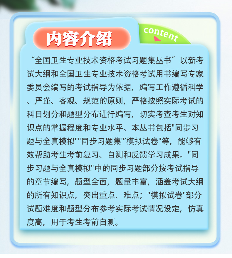 “全国卫生专业技术资格考试习题集丛书”以新考试大纲和全国卫生专业技术资格考试用书编写专家委员会编写的考试指导为依据,编写工作遵循科学、严谨、客观、规范的原则,严格按照实际考试的科目划分和题型分布进行编写,切实考查考生对知识点的掌握程度和专业水平。本丛书包括"同步习题与全真模拟""同步习题集"'模拟试卷"等,能够有效帮助考生考前复习、自测和反馈学习成果。"同步习题与全真模拟"中的同步习题部分按考试指导的章节编写,题型全面,题量丰富,涵盖考试大纲的所有知识点,突出重点、难点;"模拟试卷"部分试题难度和题型分布参考实际考试情况设定,仿真度高,用于考生考前自测。